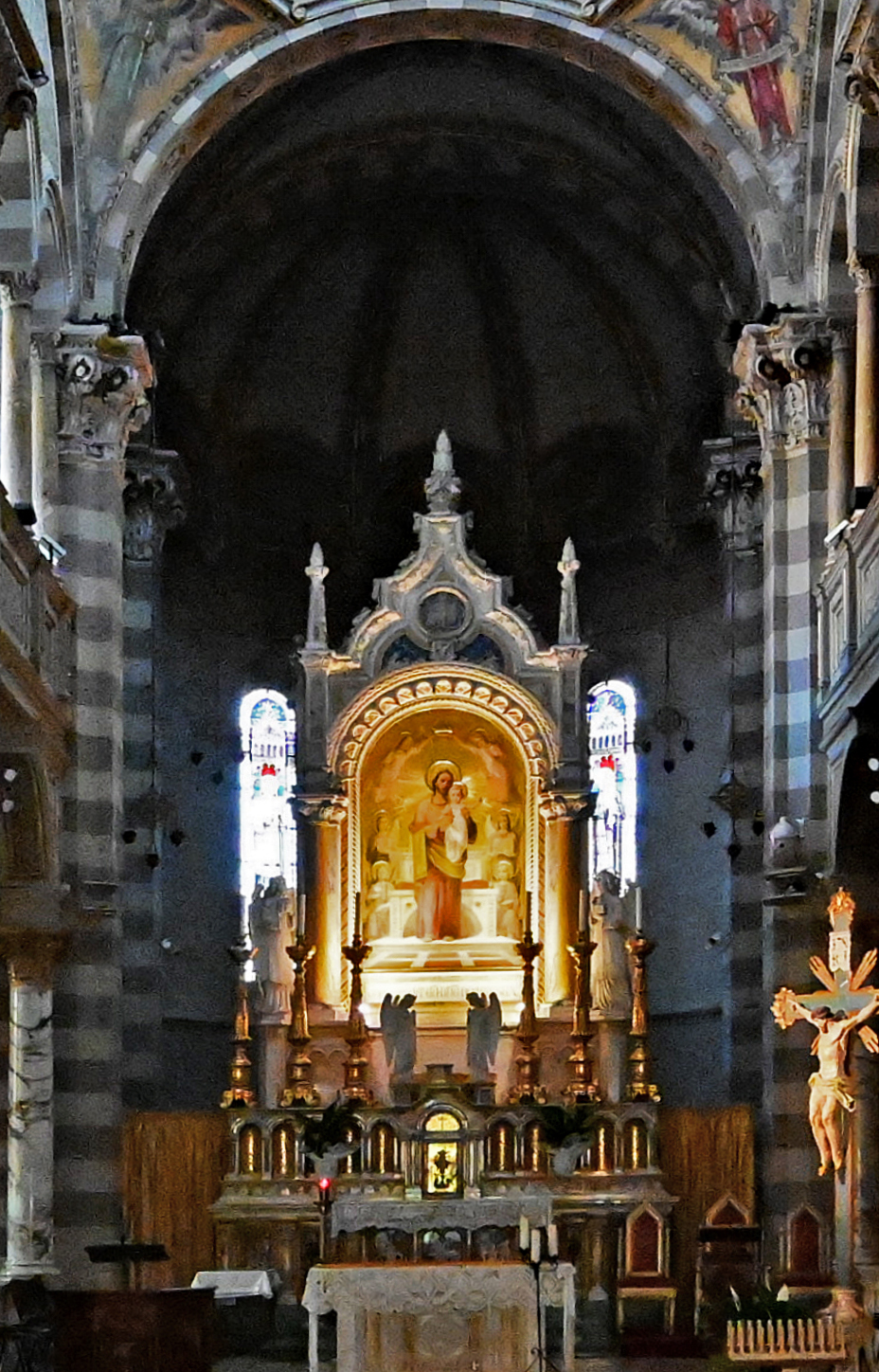 Schließlich erreiche ich die Kathedrale Santa Maria Assunta, das bedeutendste religiöse Bauwerk der Stadt. Schon von außen beeindruckt sie durch ihre Größe und das harmonische Zusammenspiel von rotem Backstein und hellem Sandstein. Erste Vorgängerbauten reichen bis ins 5. oder 6. Jahrhundert zurück, eine romanische Kirche wurde 1095 von Papst Urban II. geweiht, bevor sie teilweise einstürzte oder Bränden zum Opfer fiel. Die heutige Kathedrale entstand zwischen etwa 1327 und 1354, während der romanische Campanile bereits 1266 errichtet wurde.