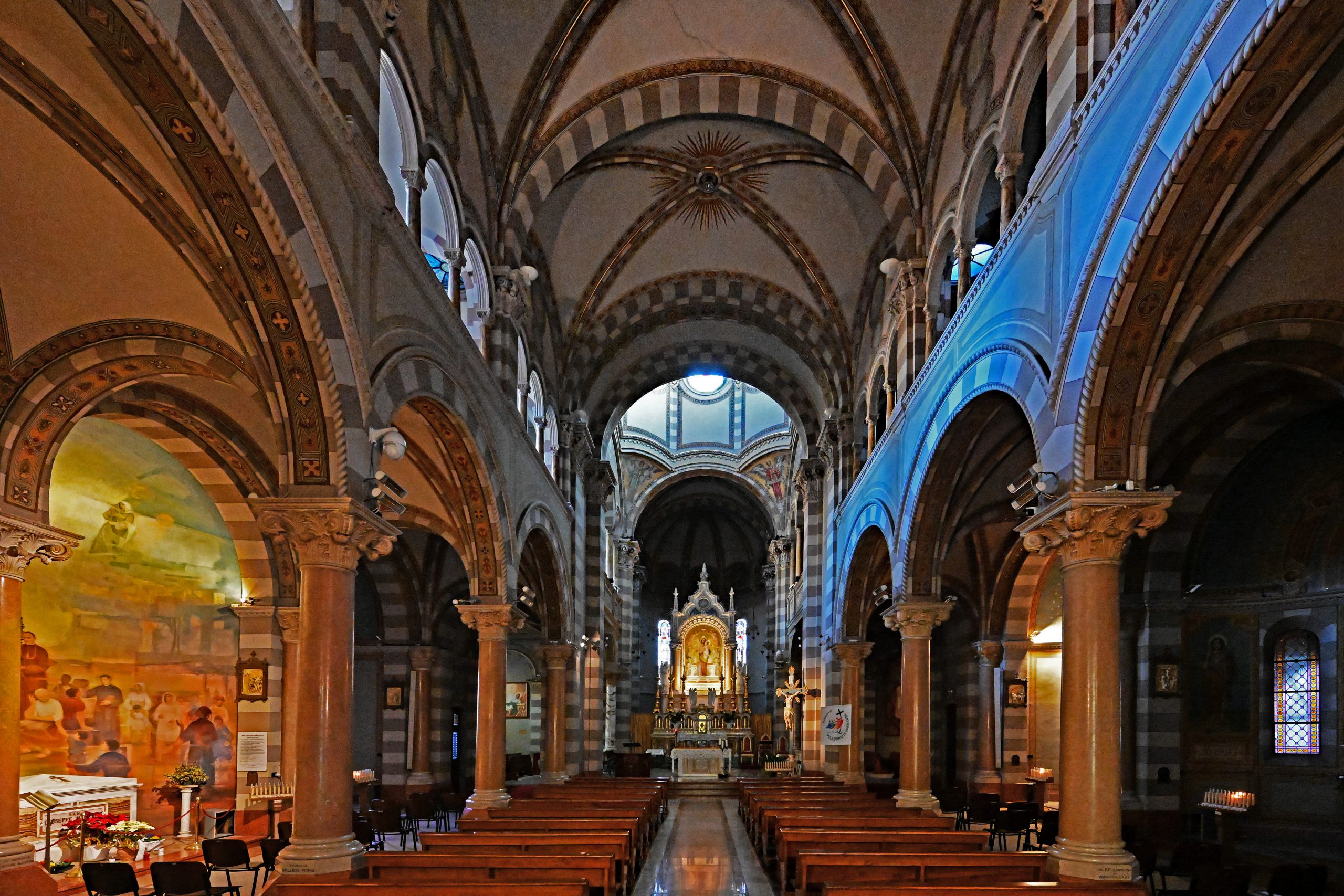 Direkt gegenüber liegt das Santuario di San Giuseppe, dessen neoromanische Backsteinfassade einen warmen, rötlichen Akzent setzt. Die monumentale Statue des Heiligen Josef und der zentrale Glockenturm verleihen dem Bau eine starke Präsenz. Im Inneren beeindruckt die Säulenhalle mit ihren 40 Säulen und dem kosmatesken Mosaikboden. Besonders berührend ist die Marello-Kapelle, in der die sterblichen Überreste des Heiligen Giuseppe Marello ruhen.