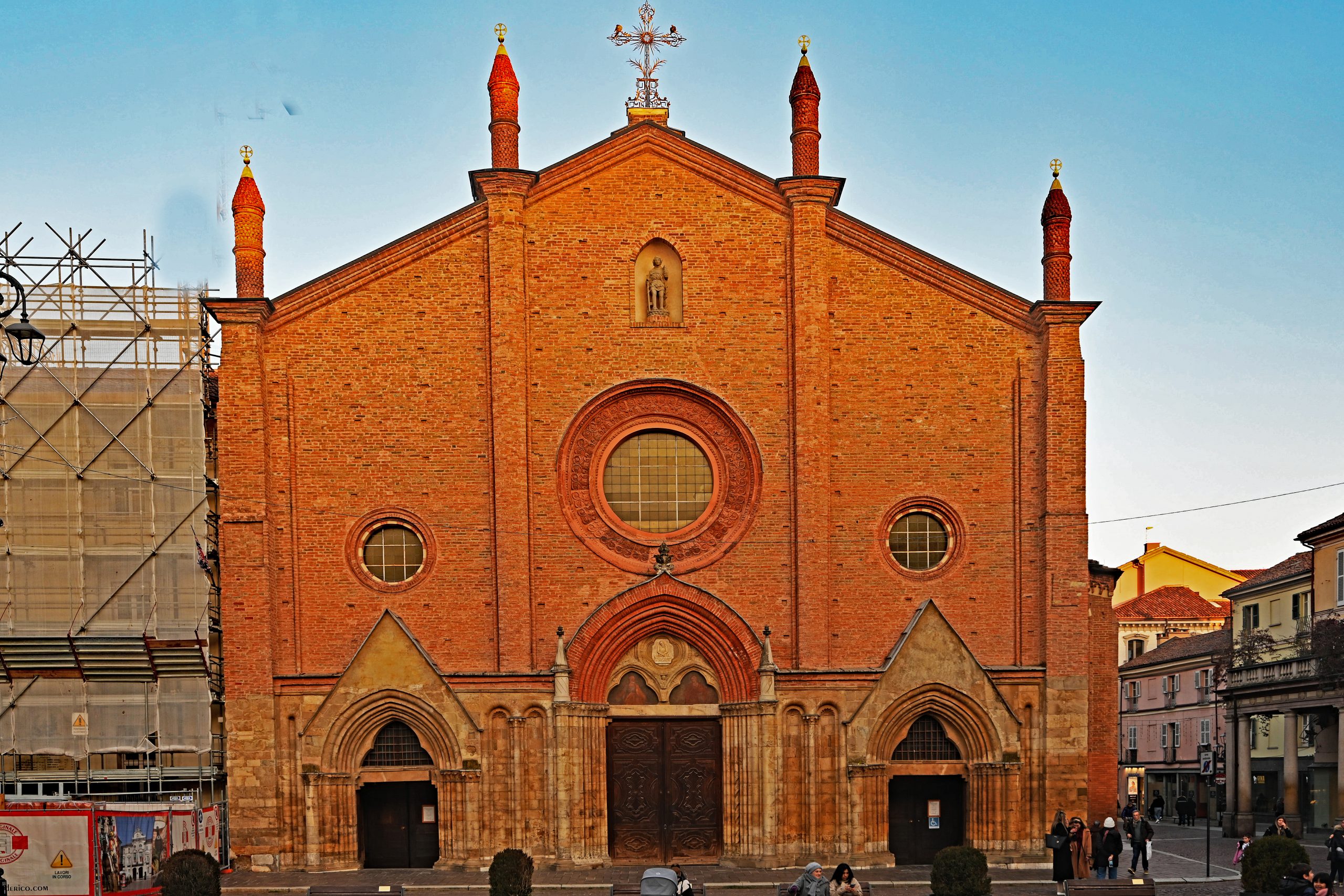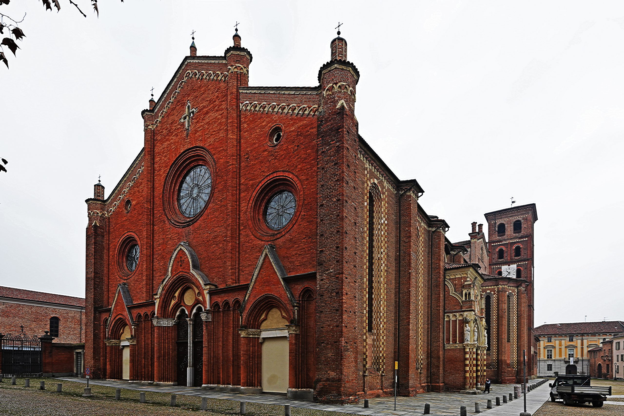 Beim Näherkommen fällt mir sofort der warme Ton des roten Backsteins auf, der für die piemontesische Gotik so charakteristisch ist. Spitzbögen gliedern die Fassade, die um 1462 vollendet wurde und durch ihre drei reich geschmückten Marmorportale sowie die zentrale Fensterrose besticht. Der Bau wurde im 15. Jahrhundert um ein Joch verlängert, was ihm eine sanfte Ausdehnung in Richtung des Platzes verleiht. Besonders eindrucksvoll ist der mächtige Campanile aus dem 10. Jahrhundert, ein Relikt der romanischen Vorgängerkirche, der gemeinsam mit Teilen der Krypta die tiefe zeitliche Schichtung dieses Ortes sichtbar macht. Die umfassende Restaurierung zwischen 1968 und 1974 hat dem Bau seinen mittelalterlichen Charakter zurückgegeben, ohne ihm die Patina der Jahrhunderte zu nehmen.
