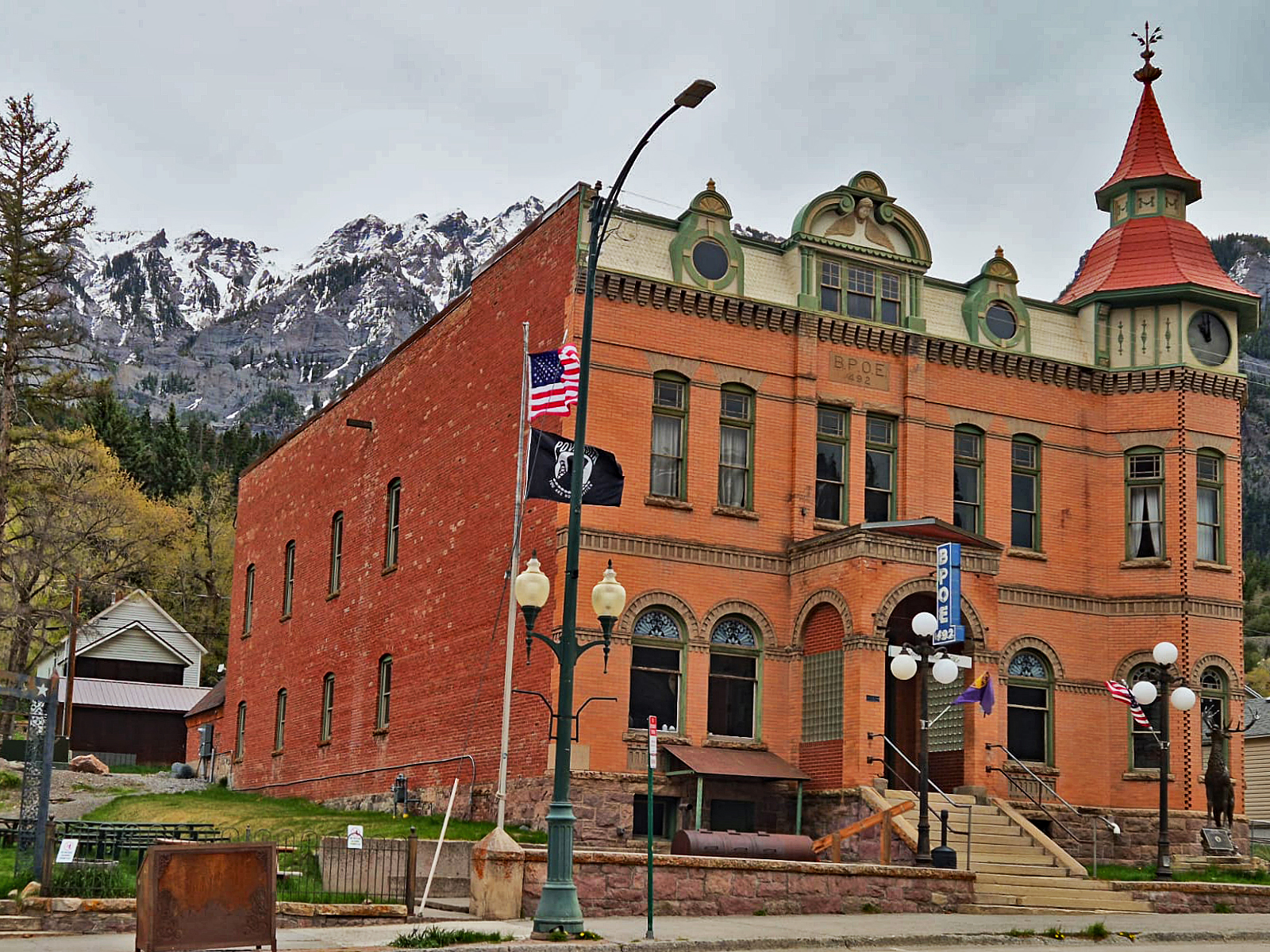 Ein paar Schritte weiter steht das Wright Opera House. Die Brüder Ed und George Wright ließen es 1888 erbauen – ein mutiger Versuch, der rauen Bergbaukultur mit Bildung und Theater etwas Glanz entgegenzusetzen. Die kunstvolle Backsteinfassade gilt heute als eines der besterhaltenen Beispiele viktorianischer Architektur in den gesamten Rockies. Gleich daneben zeugt die Ouray Elks Lodge (BPOE) von der langen Tradition der Gemeinde. Das 1904 errichtete Backsteingebäude mit seinen stolzen Bögen ist seit über einem Jahrhundert der soziale Ankerpunkt der Stadt.