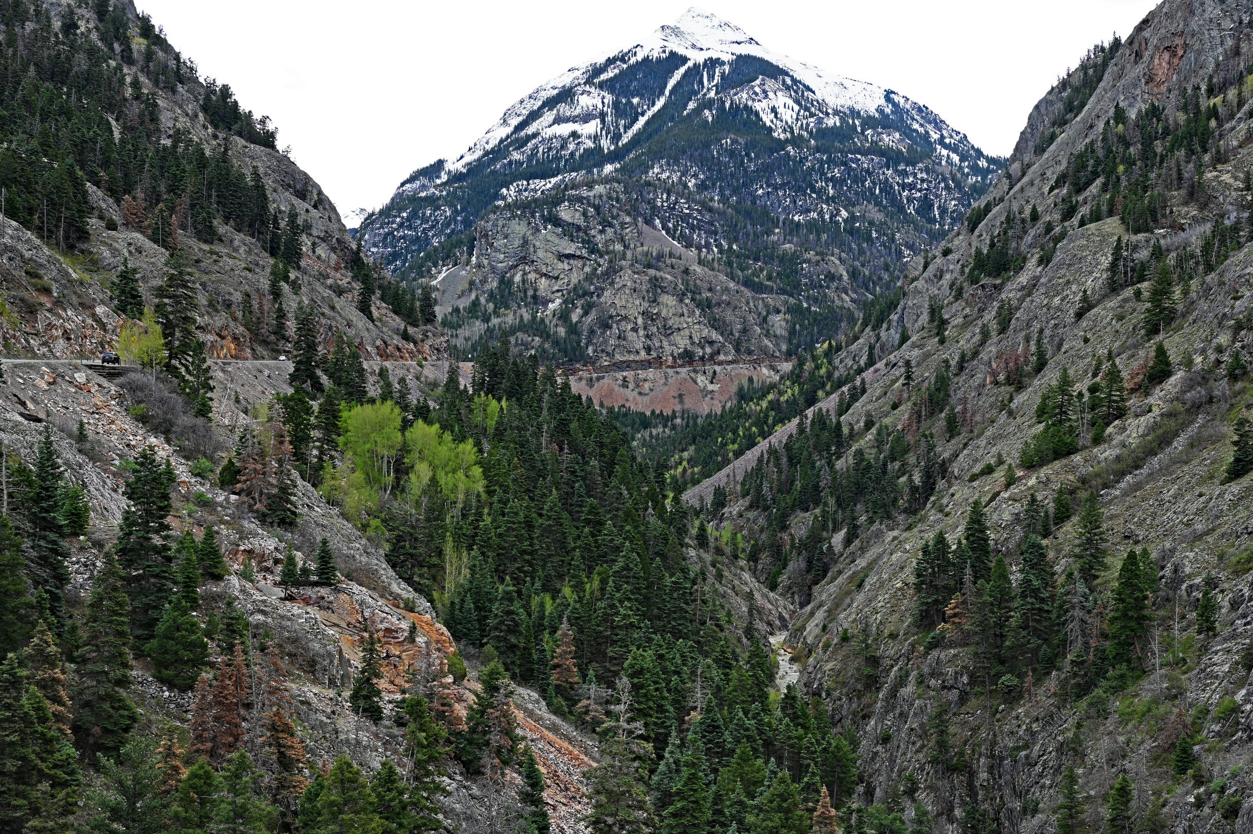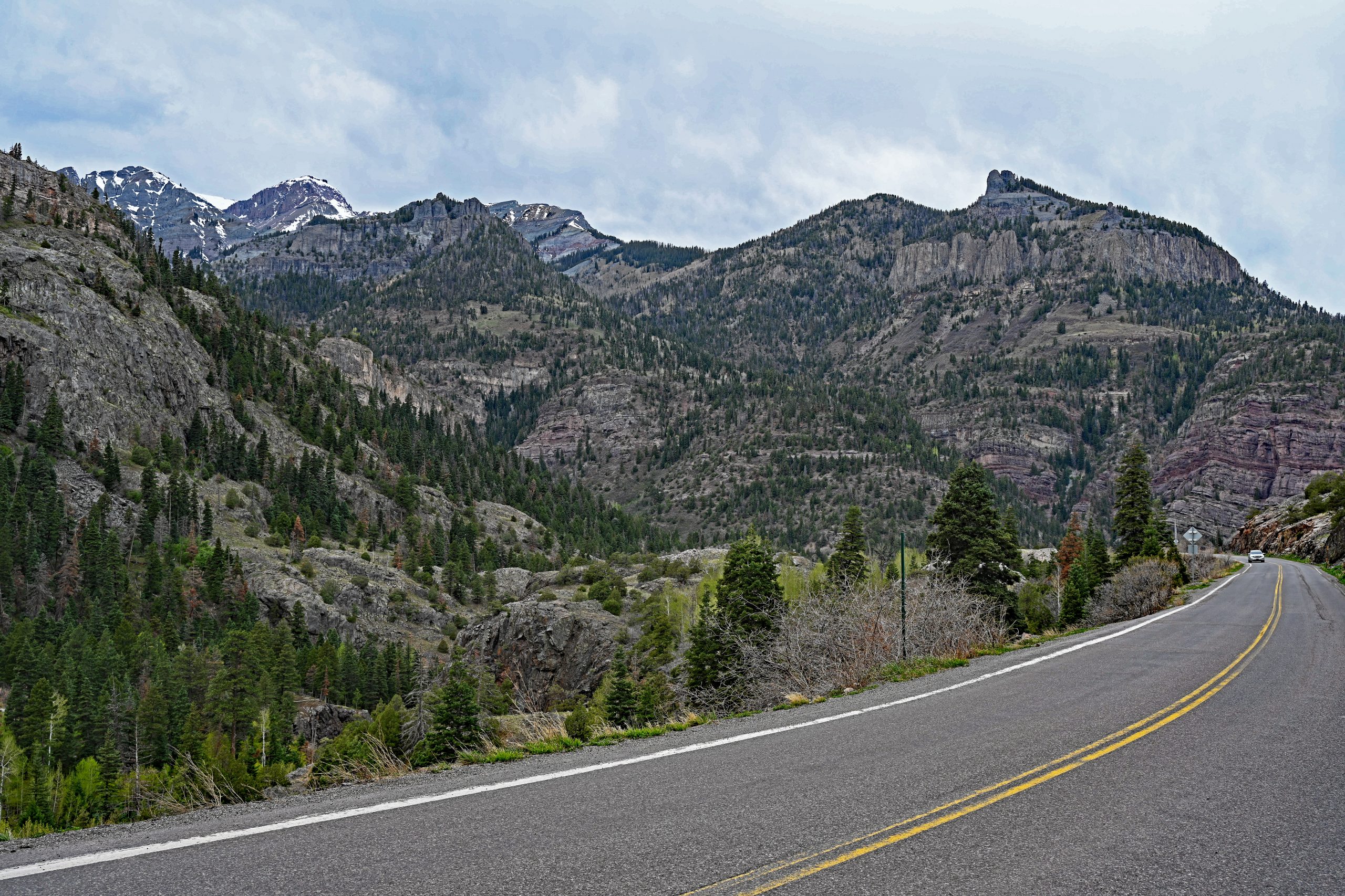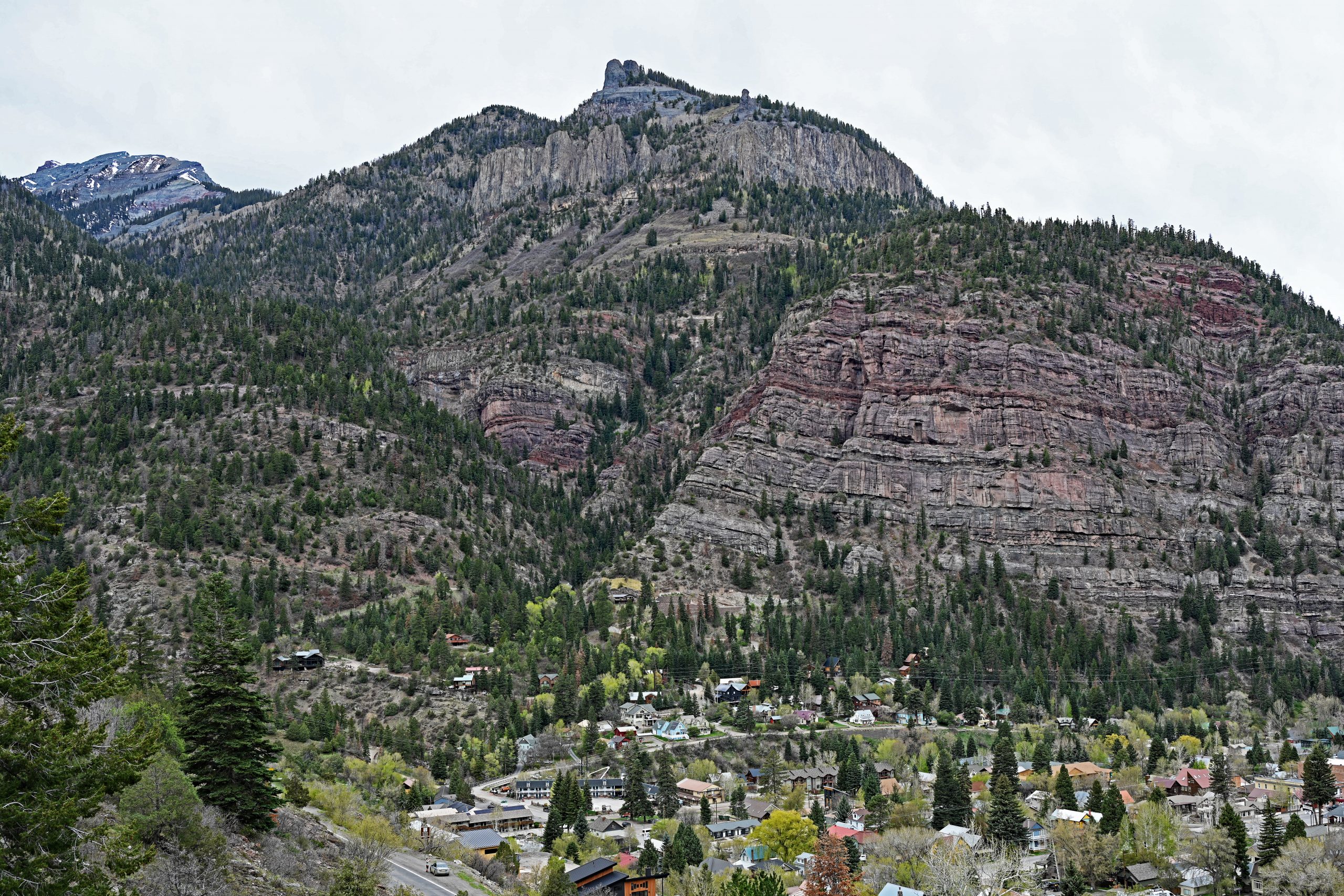 Der Weg über den Red Mountain Pass ist ein Drahtseilakt. Während auf der einen Seite der nackte Fels aufragt, bricht das Gelände auf der anderen hunderte Meter tief ab. Keine Leitplanke stört den Blick – eine bewusste Entscheidung, damit die Schneepflüge die gewaltigen Massen im Winter einfach über die Kante schieben können. Jetzt, im April, ist der Kontrast fast berauschend: Das tiefe Oxid-Rot der Hänge prallt auf das blendende Weiß der Schneereste. Hinter einer Kurve taucht plötzlich der Red Mountain No. 1 auf, gefolgt vom McNamee Peak, der das Mineral Creek Valley begrenzt.