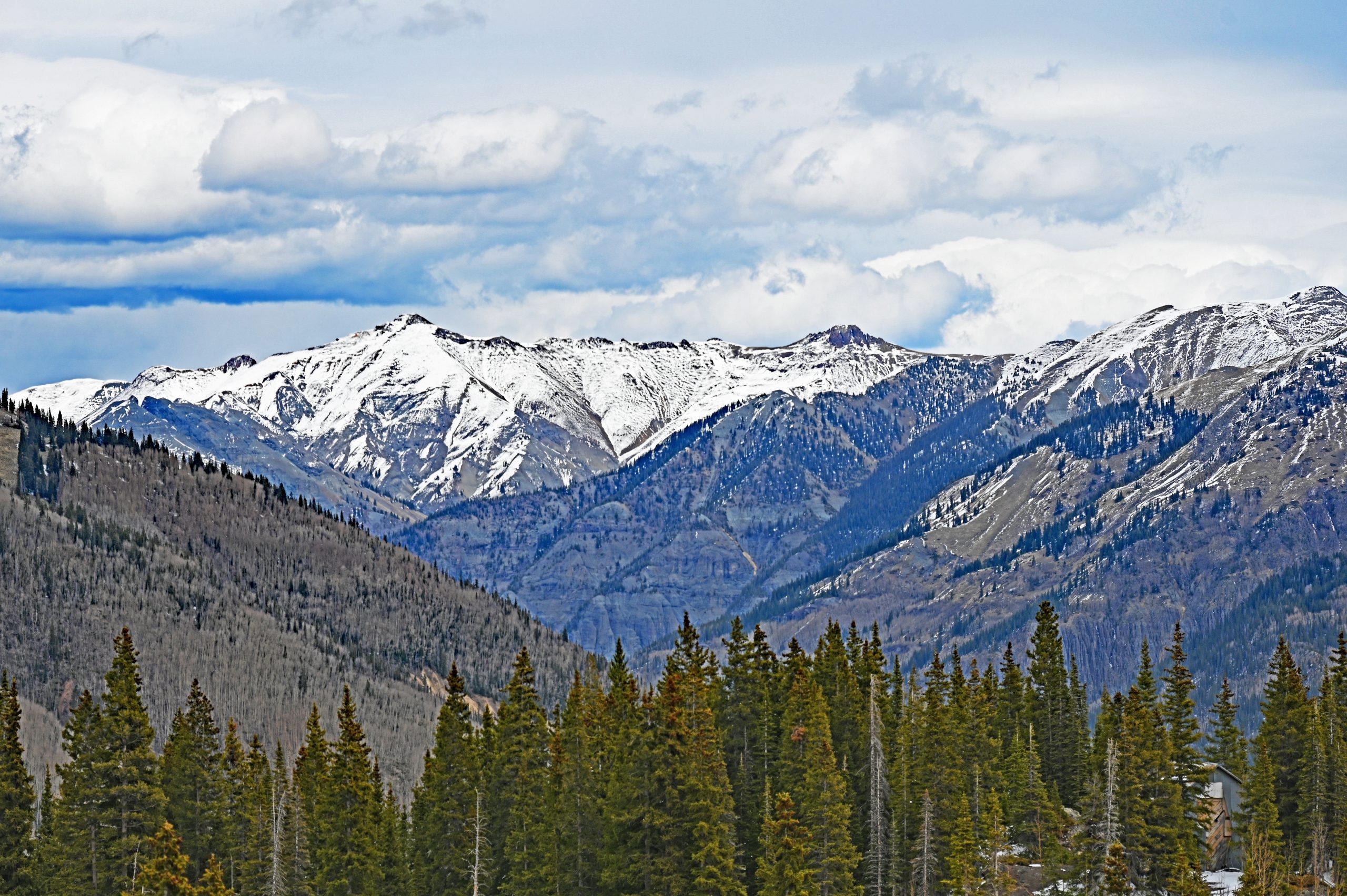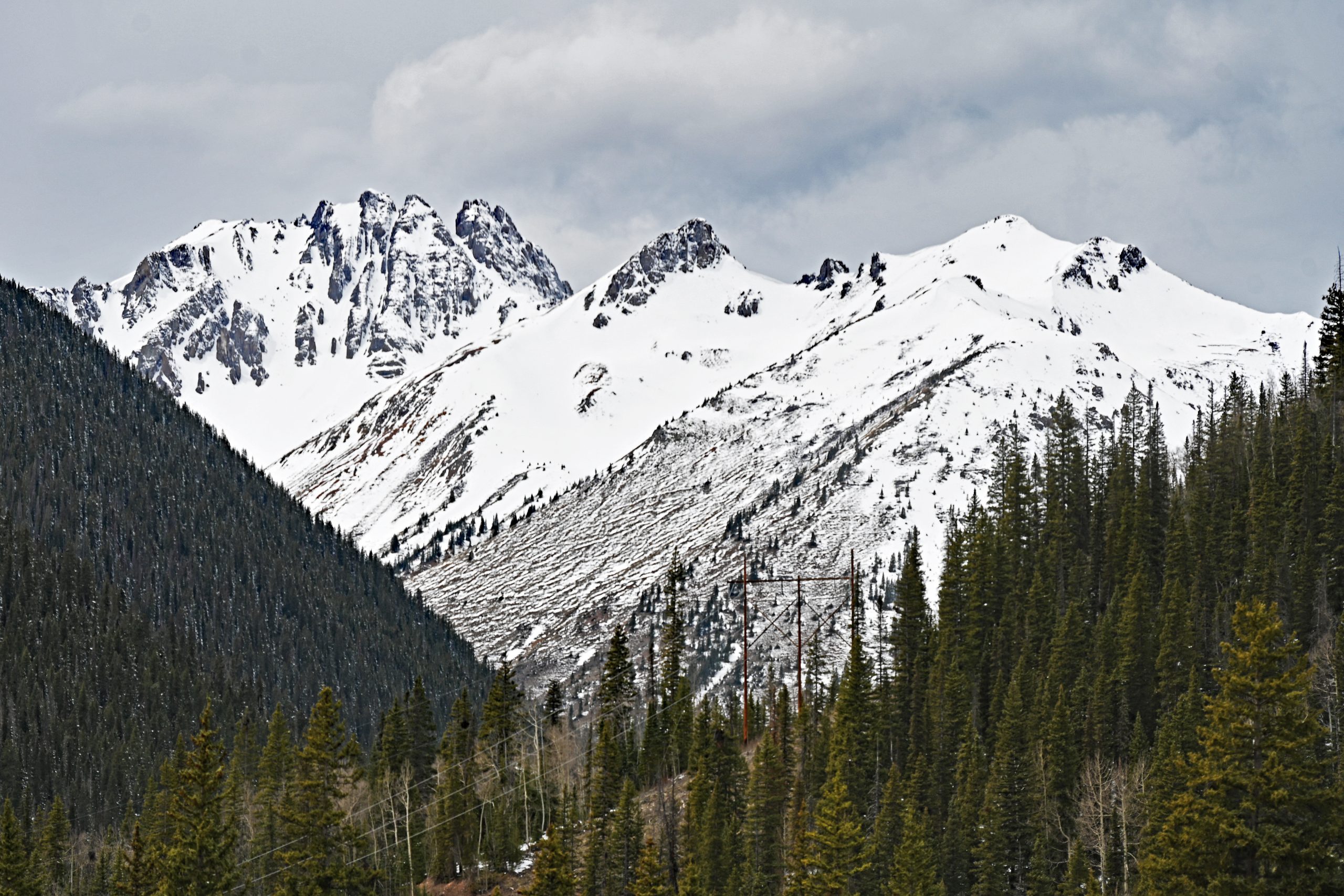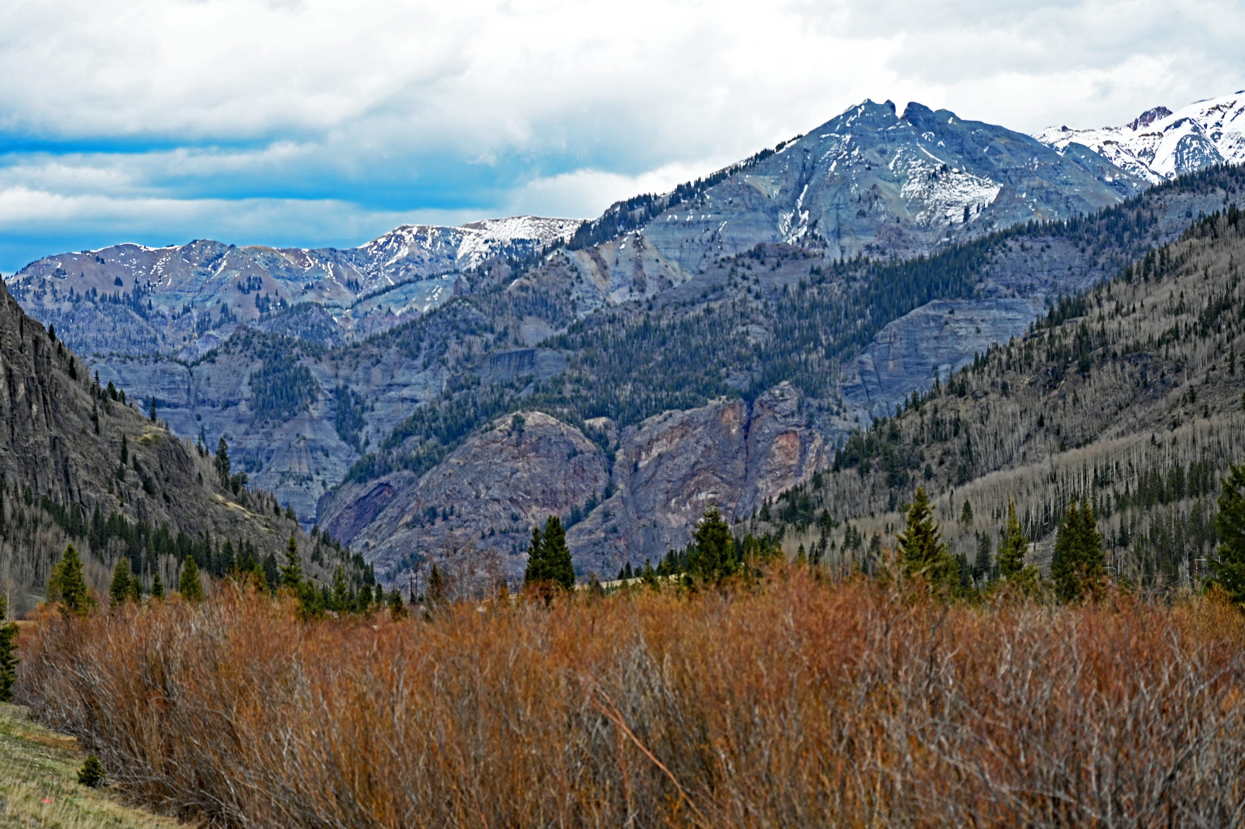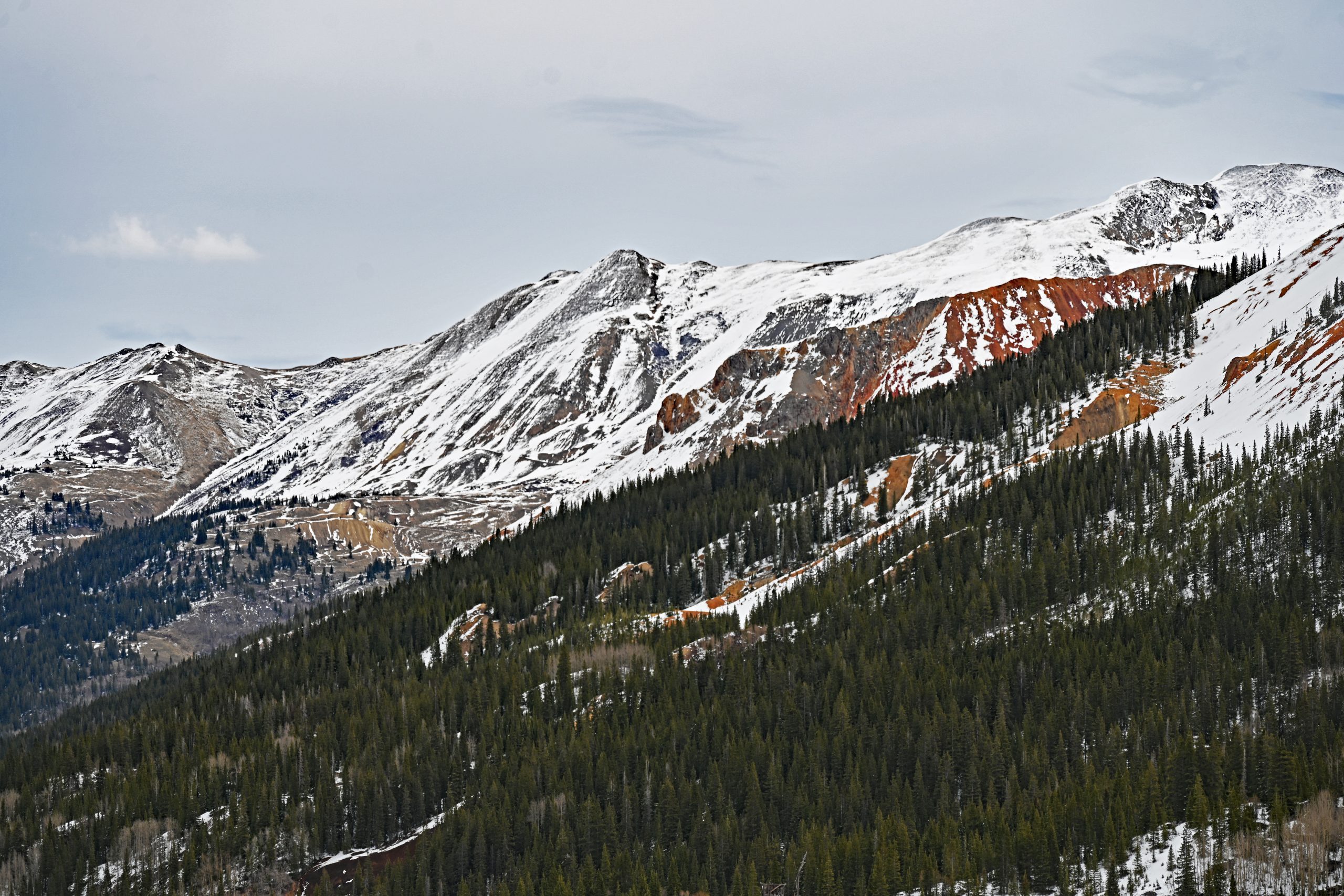 Der Weg über den Red Mountain Pass ist ein Drahtseilakt. Während auf der einen Seite der nackte Fels aufragt, bricht das Gelände auf der anderen hunderte Meter tief ab. Keine Leitplanke stört den Blick – eine bewusste Entscheidung, damit die Schneepflüge die gewaltigen Massen im Winter einfach über die Kante schieben können. Jetzt, im April, ist der Kontrast fast berauschend: Das tiefe Oxid-Rot der Hänge prallt auf das blendende Weiß der Schneereste. Hinter einer Kurve taucht plötzlich der Red Mountain No. 1 auf, gefolgt vom McNamee Peak, der das Mineral Creek Valley begrenzt.