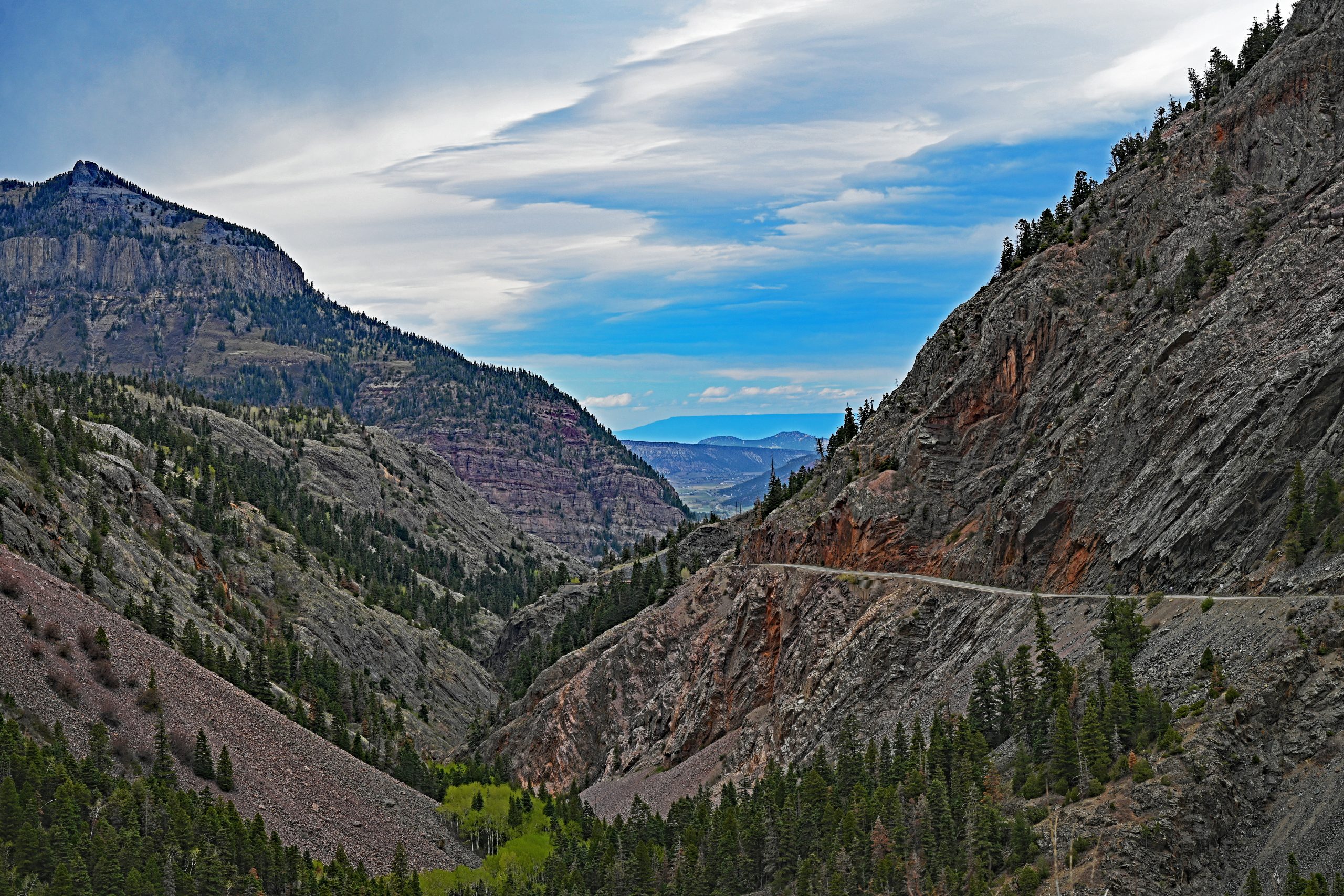 Bevor die Straße in die dunklen Windungen der Uncompahgre Gorge eintaucht, weitet sich das Land kurz im Ironton Park. Hier zeigt sich der Abrams Mountain erneut in seiner vollen Pracht, flankiert vom langgestreckten Rücken des Brown Mountain, dessen Hänge von alten Mineneingängen durchlöchert sind wie ein Schweizer Käse. Im Hintergrund wacht der Hayden Mountain über das stille Tal. Der finale Abstieg ist ein Rausch aus Serpentinen, bis ich den Switzerland of America Lookout erreiche. Tief unter mir, eingekesselt von steilen Felswänden, liegt Ouray.