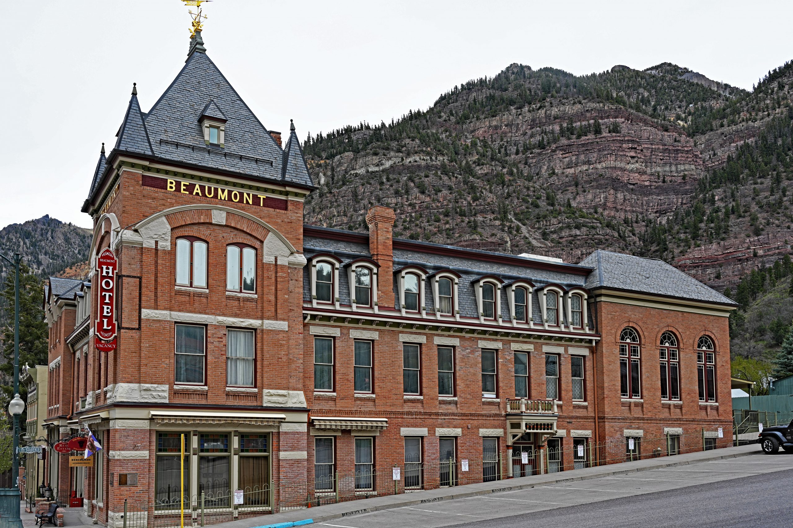 Als Schweizer fühle ich mich in Ouray sofort heimisch, auch wenn die Dimensionen hier typisch amerikanisch sind. Ich parke direkt gegenüber dem Beaumont Hotel & Spa. Dieses „Flaggschiff der San Juans“ aus dem Jahr 1886 ist eine architektonische Zeitreise. Mit seiner prunkvollen viktorianischen Fassade und dem markanten Mansarddach strahlt es eine Eleganz aus, die schon Theodore Roosevelt und Herbert Hoover zu schätzen wussten. Es ist ein steinernes Zeugnis des Goldrausches, das heute noch den Geist der Pionierzeit atmet.