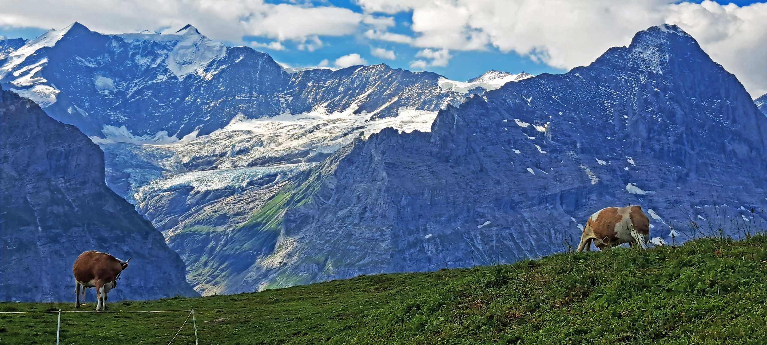 Das Schreckhorn dominiert nun das Panorama, flankiert vom Kleinaarhorn und der schroffen Stirnseite des Mettenbergs. In einer tiefen Senke schimmert erneut der Gletscher, dahinter ragen die Fiescherhörner wie dunkle, steile Pyramiden auf. Das Grosse Fiescherhorn wirkt fast schwarz gegen das gleißende Weiß des Fieschergletschers. Und mitten in dieser monumentalen Szenerie? Zwei Kühe. Sie kauen völlig unbeeindruckt auf ihren Gräsern, während hinter ihnen die Weltgeschichte der Geologie geschrieben steht.