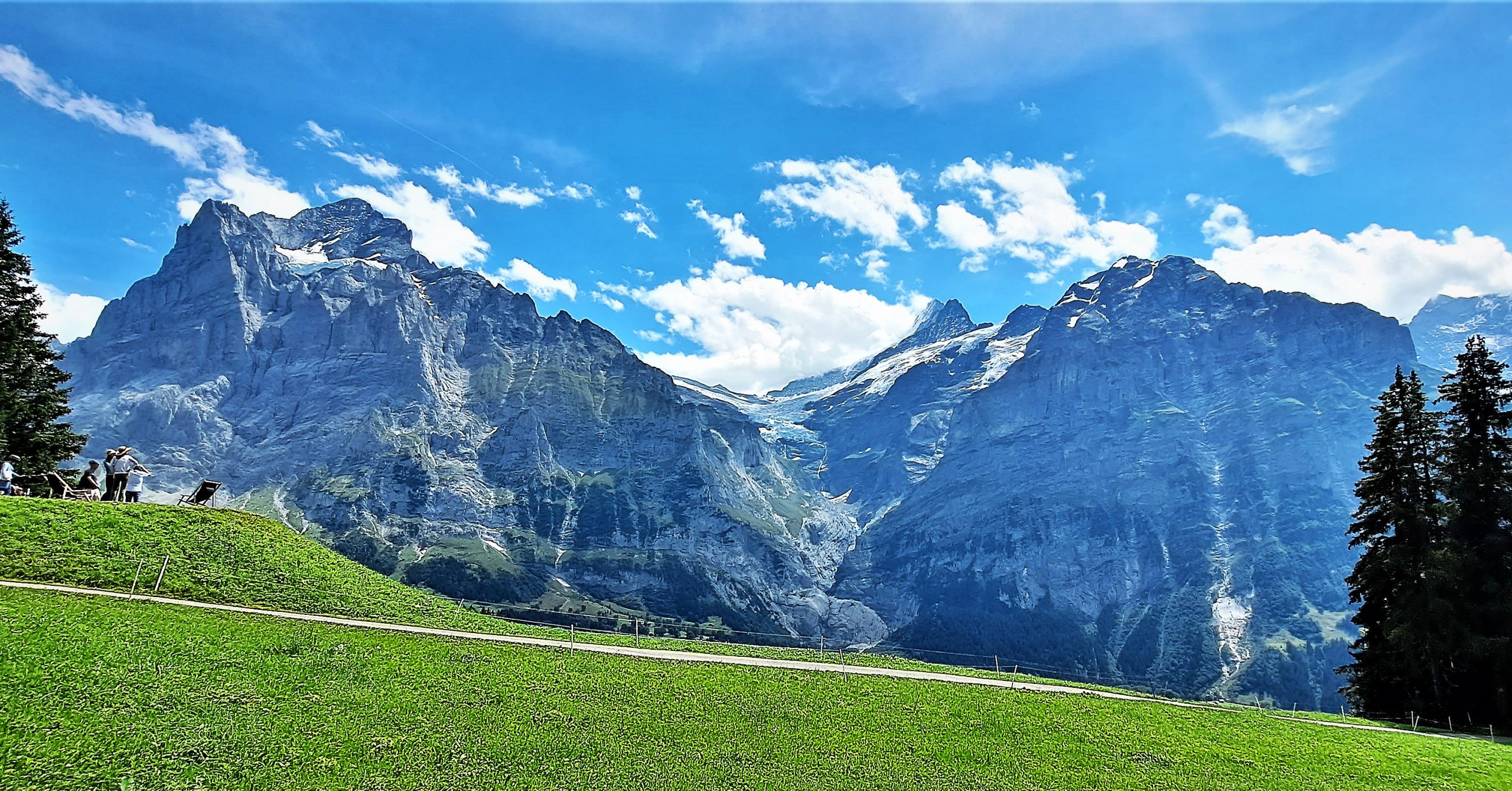 In einer unscheinbaren Sackgasse bei der Dorfstraße 108a bleiben Basia und ich wie angewurzelt stehen. Es ist, als hätte jemand einen Vorhang aufgezogen: Plötzlich öffnet sich der Blick auf die monumentale Breitseite des Mettenbergs. Er thront dort in einem harten, kühlen Grau, während links daneben das majestätische Wetterhorn in den blauen Himmel ragt. Dazwischen schmiegt sich der Obere Grindelwaldgletscher wie ein erstarrter Fluss aus weißem Eis in die Felsfurchen.