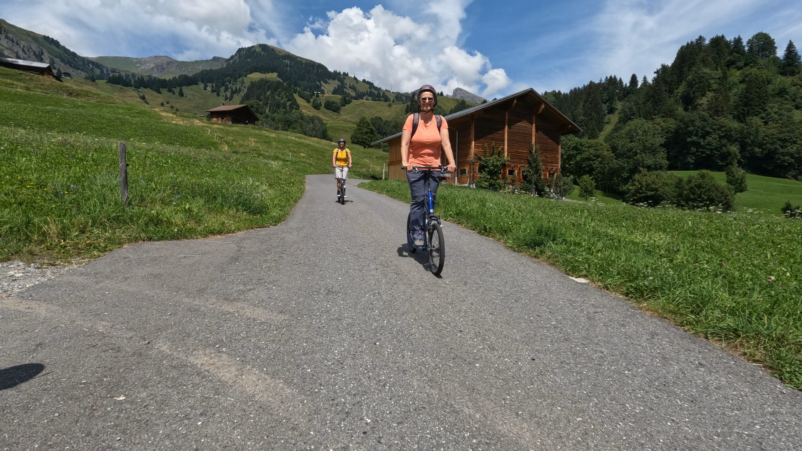 Nach dem Mittagessen, bei dem wir amüsiert die Fahrkünste der vorbeiziehenden Trottinettfahrer beobachten, schnappen wir uns selbst die Trottibikes. Simon und ich verlieren schnell die anfängliche Vorsicht und nehmen richtig Fahrt auf. Der Weg ins Tal ist steil. Wer hier den Blick zu lange von der Piste abwendet, riskiert einen Sturz – wie wir bei einigen Pechvögeln am Wegesrand sehen.