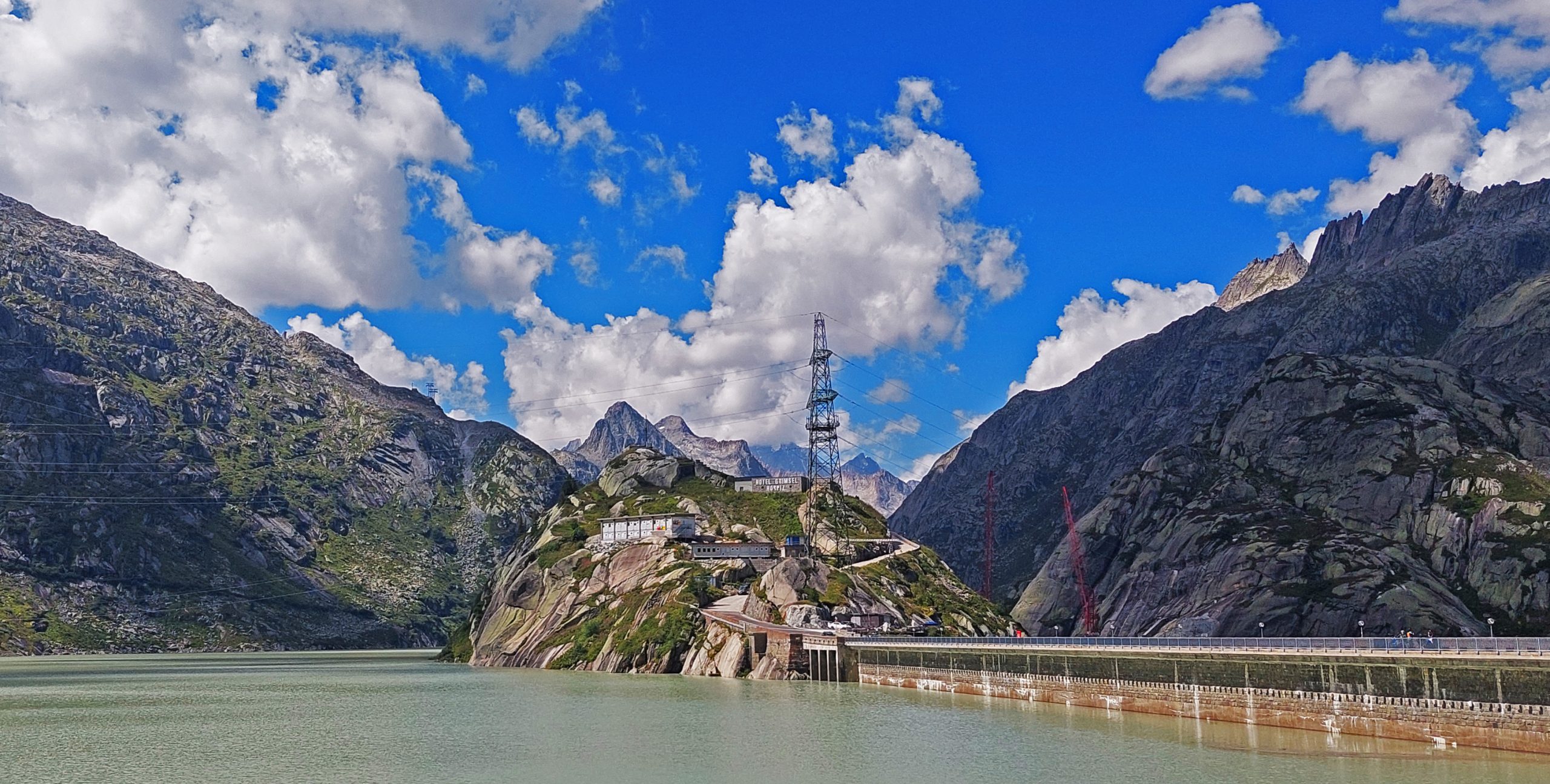Nachdem ich meine Gefährten wieder eingesammelt habe, verabschieden wir uns vom majestätischen Aarmassiv. Die Strasse stürzt nun förmlich in die Tiefe. In engen Kehren, dicht entlang an senkrechten Granitwänden, führt uns der Weg hinunter nach Gletsch. Dort, wo die Rhone noch ein junger Wildbach ist, wartet ein technisches Juwel auf uns.