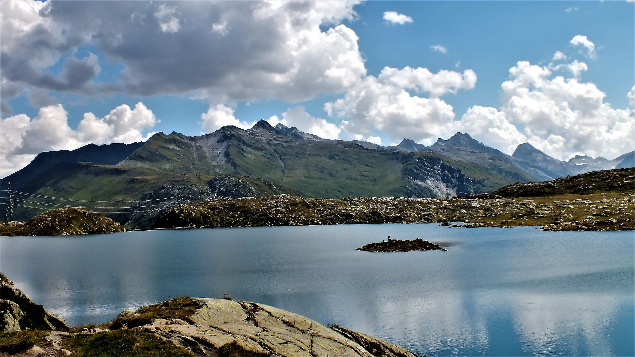 Obwohl wir nun schon seit 25 Jahren in der Schweiz leben, sind es genau diese Momente, die uns sprachlos machen. Wir entdecken immer wieder neue Facetten dieser Heimat. Wir folgen dem Pfad weiter am Ufer entlang, geniessen das Glitzern der kleinen Insel mit ihrer Steinskulptur. Kurz keimt Unsicherheit auf: Führt der Weg wirklich ganz herum? Doch die Neugier siegt. Am Damm führt uns der Pfad ein Stück hinunter, nur um uns auf der anderen Seite wieder sanft hinaufzuführen.