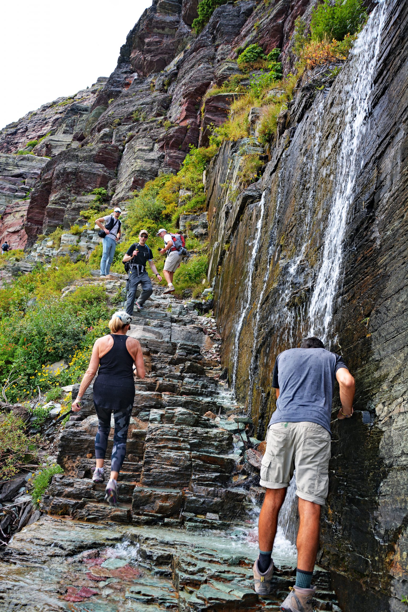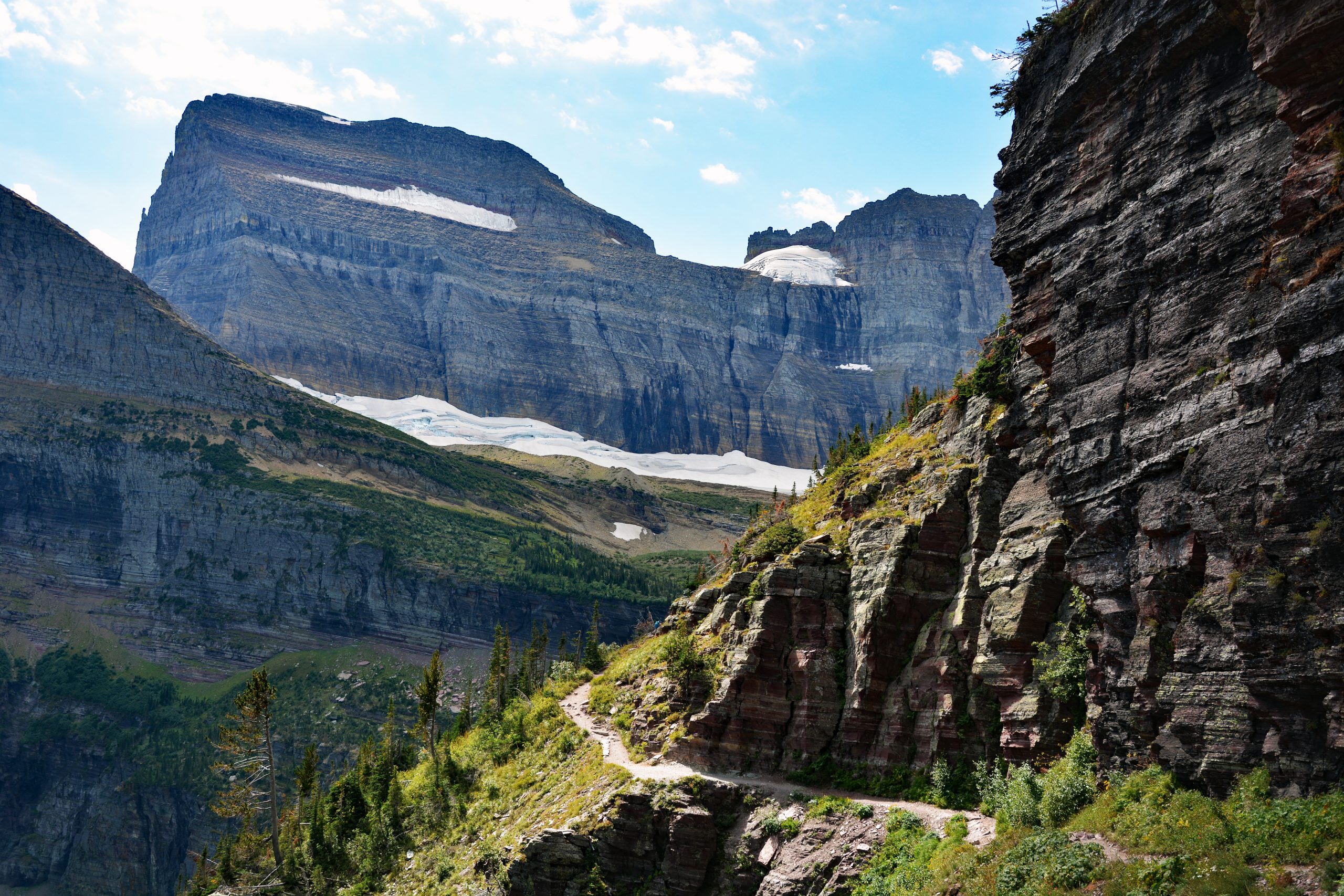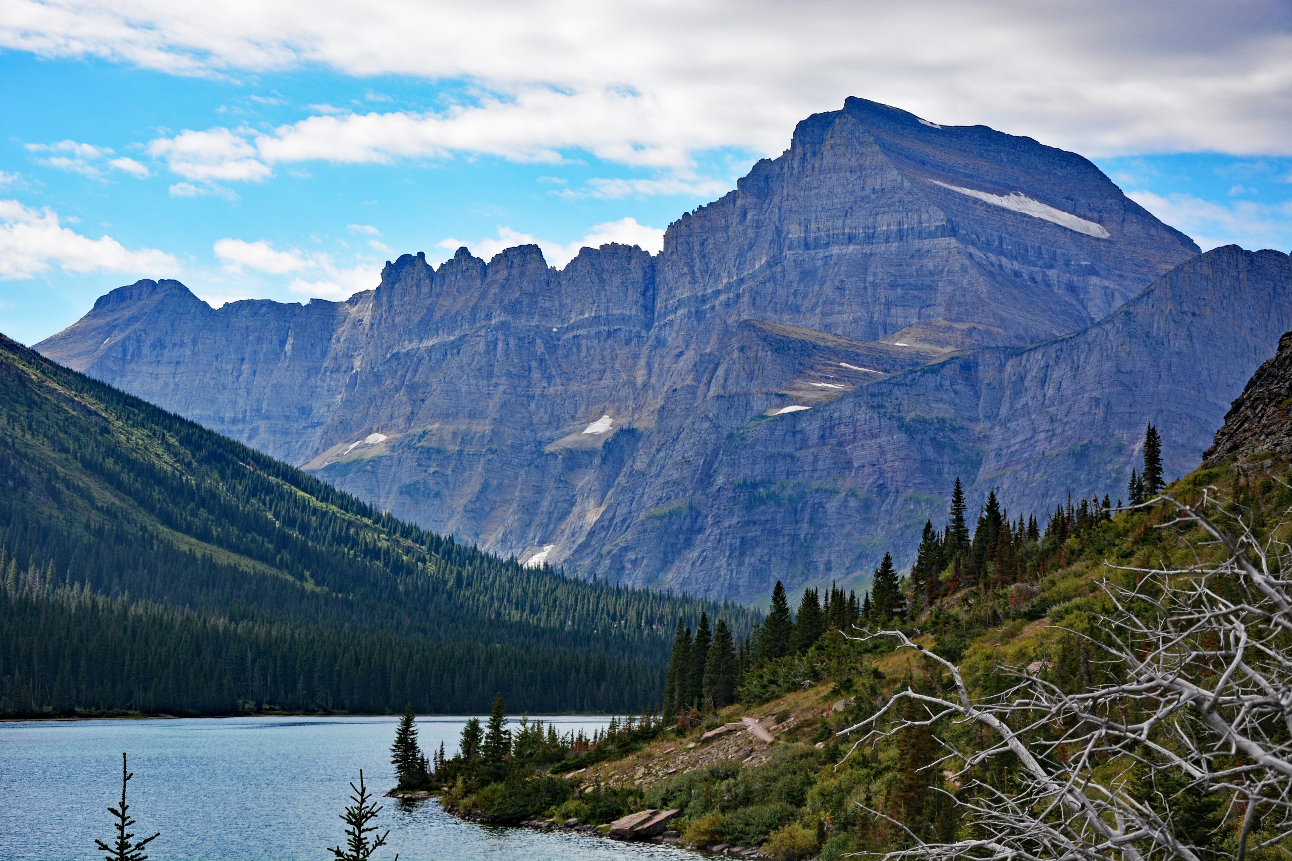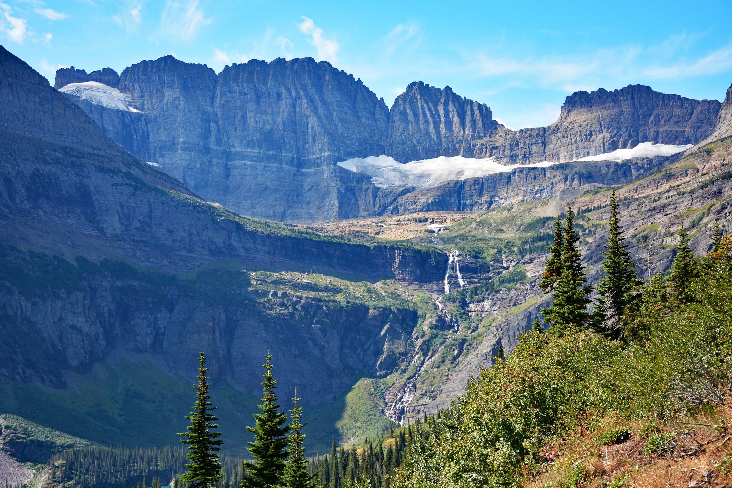Über ihm thronte Mount Gould wie eine gewaltige Wand aus dunklem, geschichtetem Gestein. Von seiner Schulter stürzten die weißen Bänder der Grinnell Falls hunderte von Metern in das Tal. Ich blieb stehen und ließ den Moment auf mich wirken. Es waren genau diese Ausblicke, die Müdigkeit vergessen lassen.
