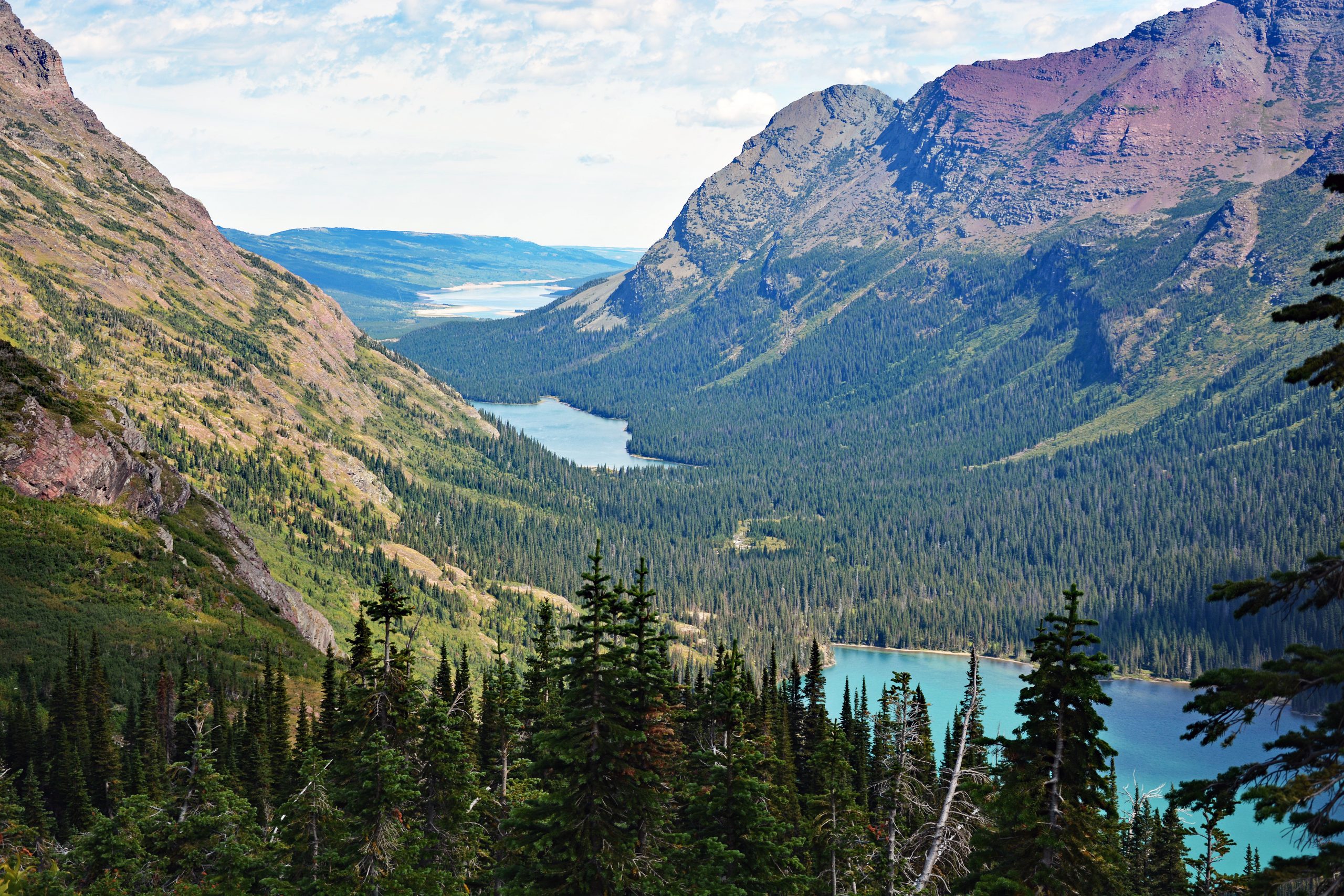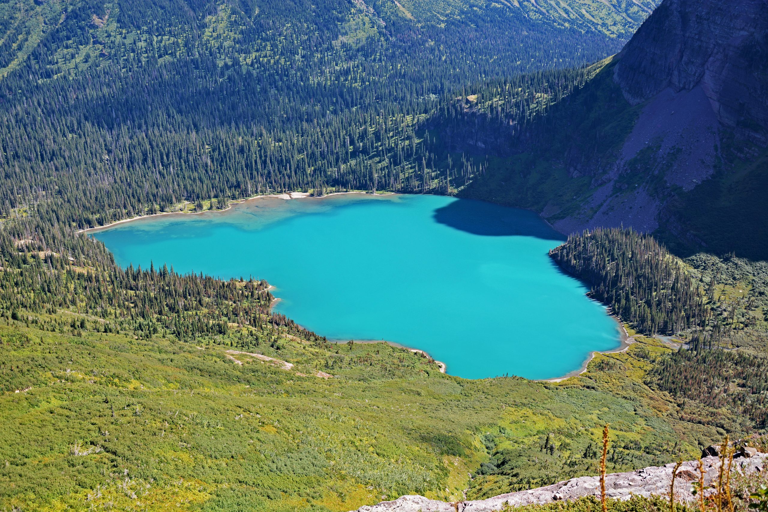 Nachdem ich das hintere Ufer des Lake Josephine umrundet hatte, änderte sich der Charakter des Trails schlagartig. Der Weg stieg steil an, und plötzlich fiel zu einer Seite die Welt tief ab. Die Luft wurde kühler und dünner und trug das Rauschen ferner Wasserfälle. Etwa eine Meile hinter dem See öffnete sich ein überwältigender Blick: Grinnell Lake, tief unten und in einem unwirklichen Türkis, als würde er von innen leuchten.
