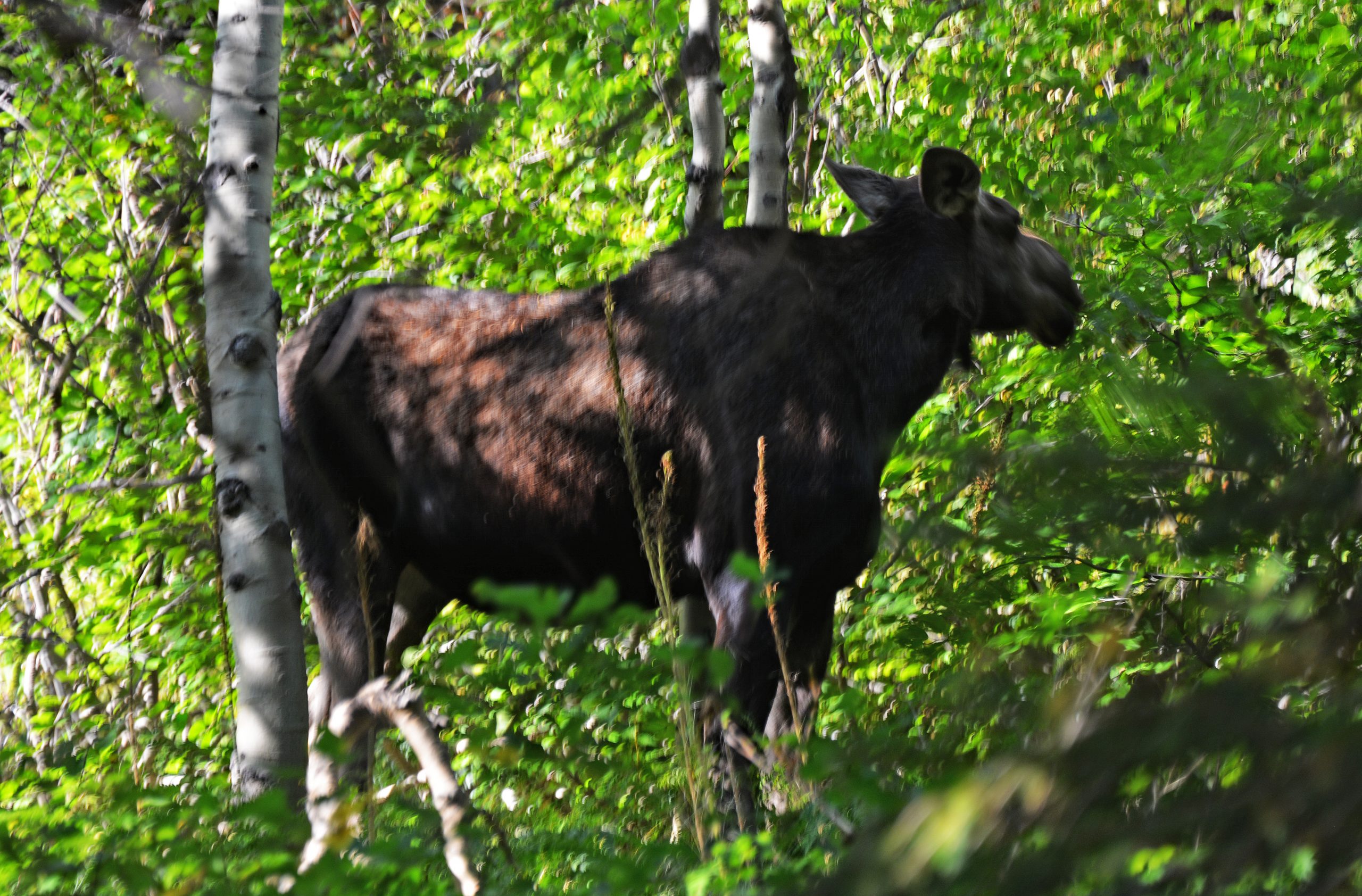 Kurz vor dem Ende des Trails tauchte plötzlich ein riesiger Elch nur drei Meter entfernt hinter einigen Bäumen auf. Für einen Moment blieb mir der Atem stehen – so ein Tier aus nächster Nähe beeindruckt und mahnt zugleich. Doch er fraß ruhig weiter, ohne sich um mich zu kümmern