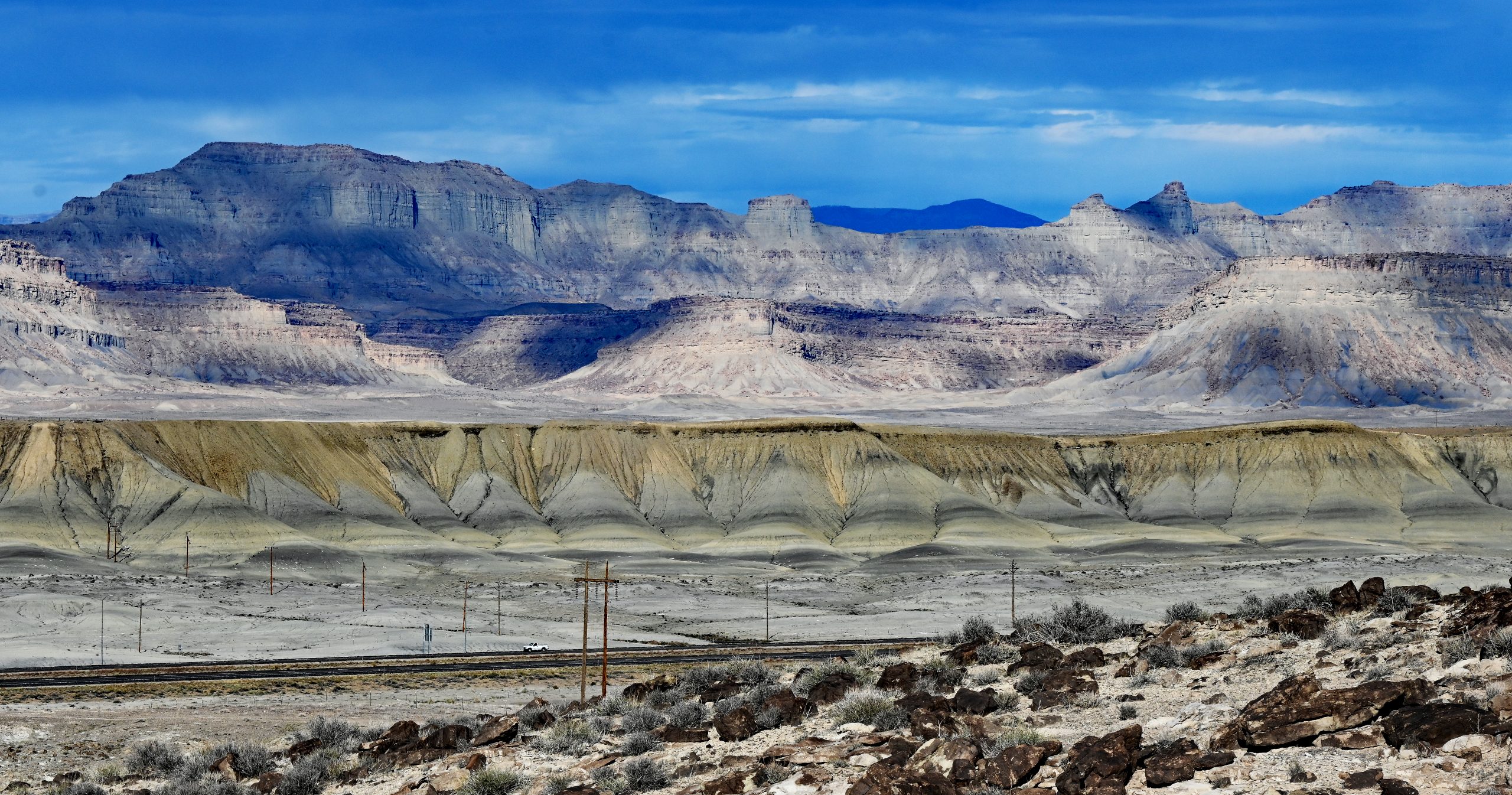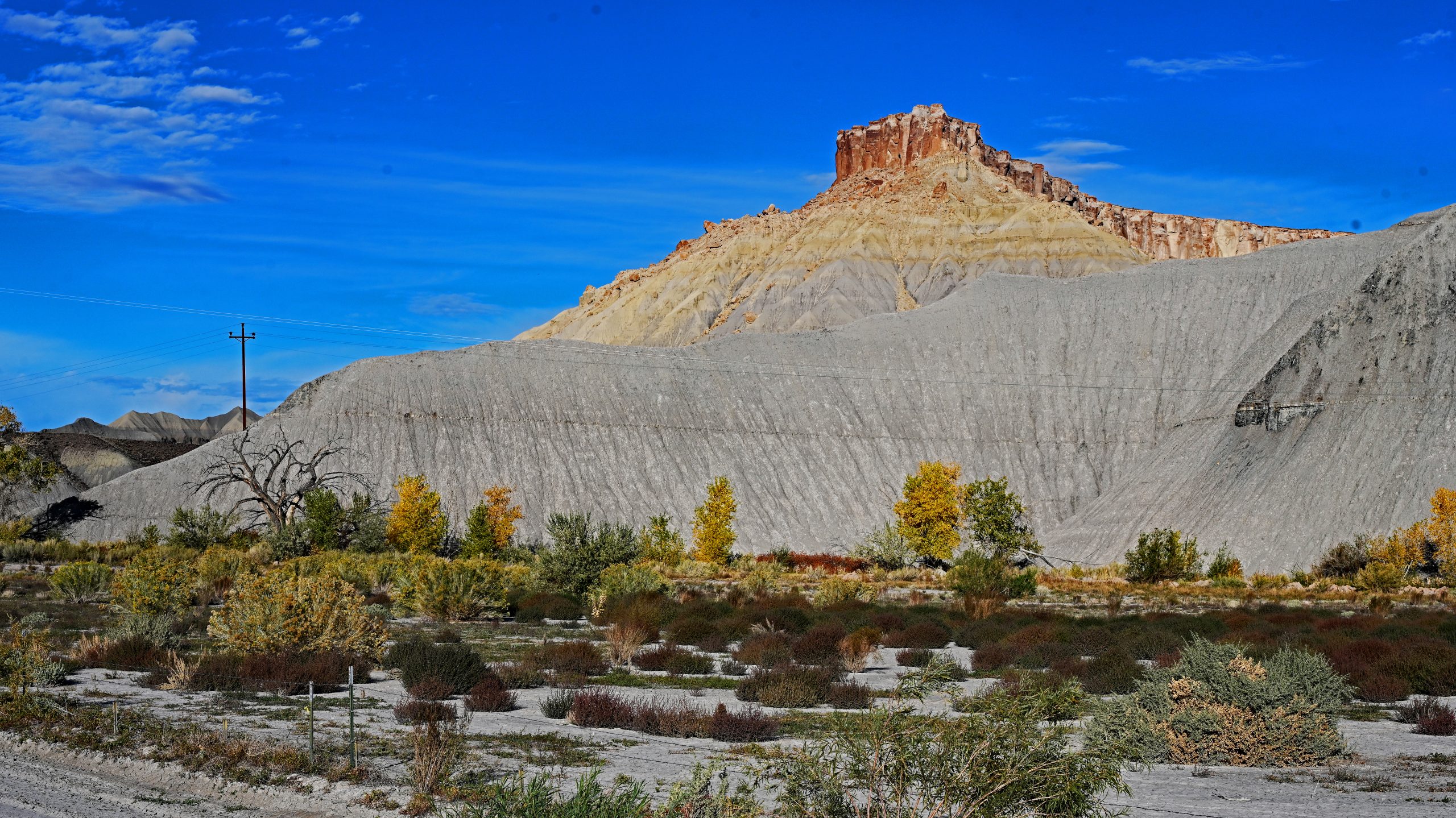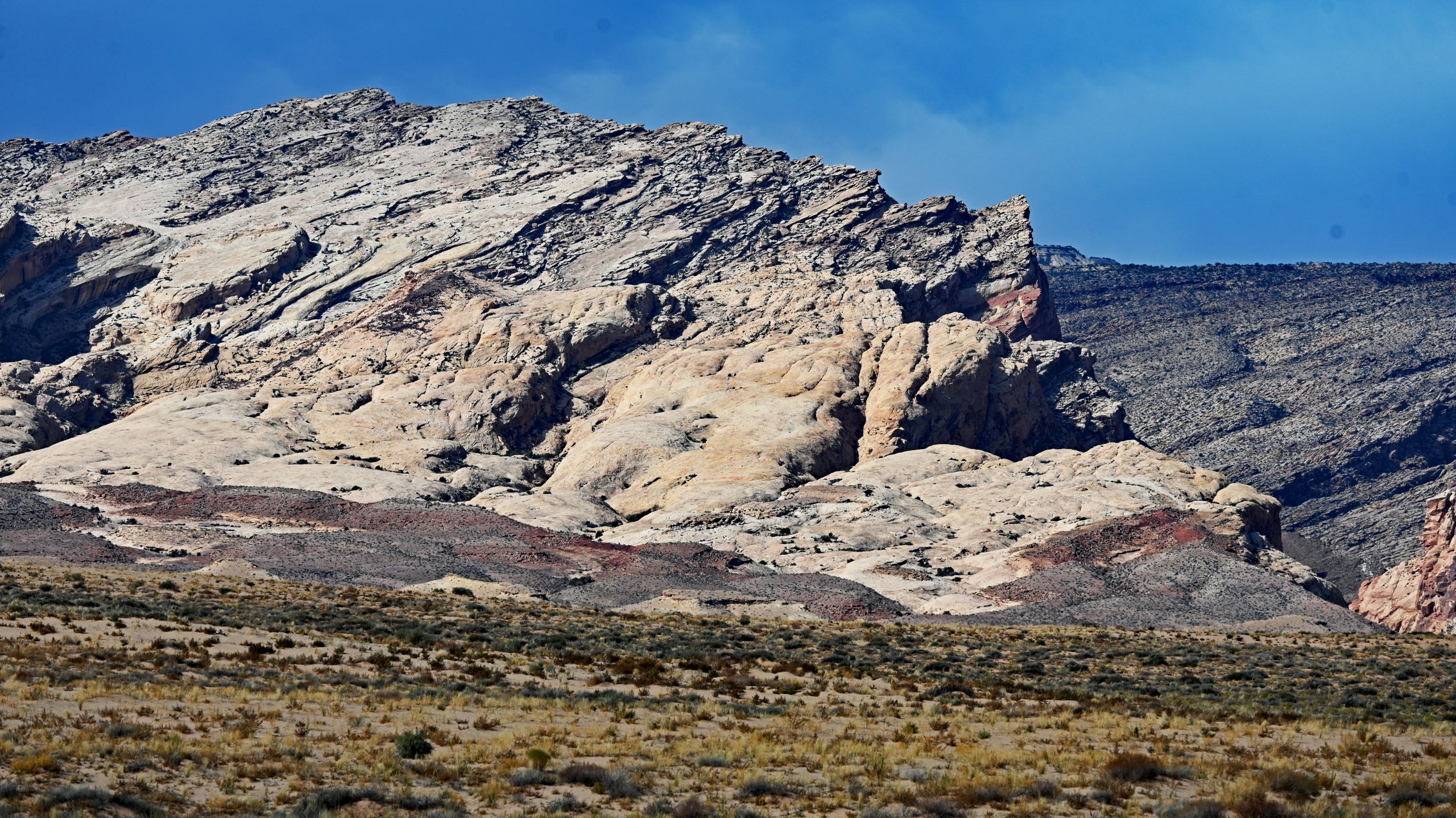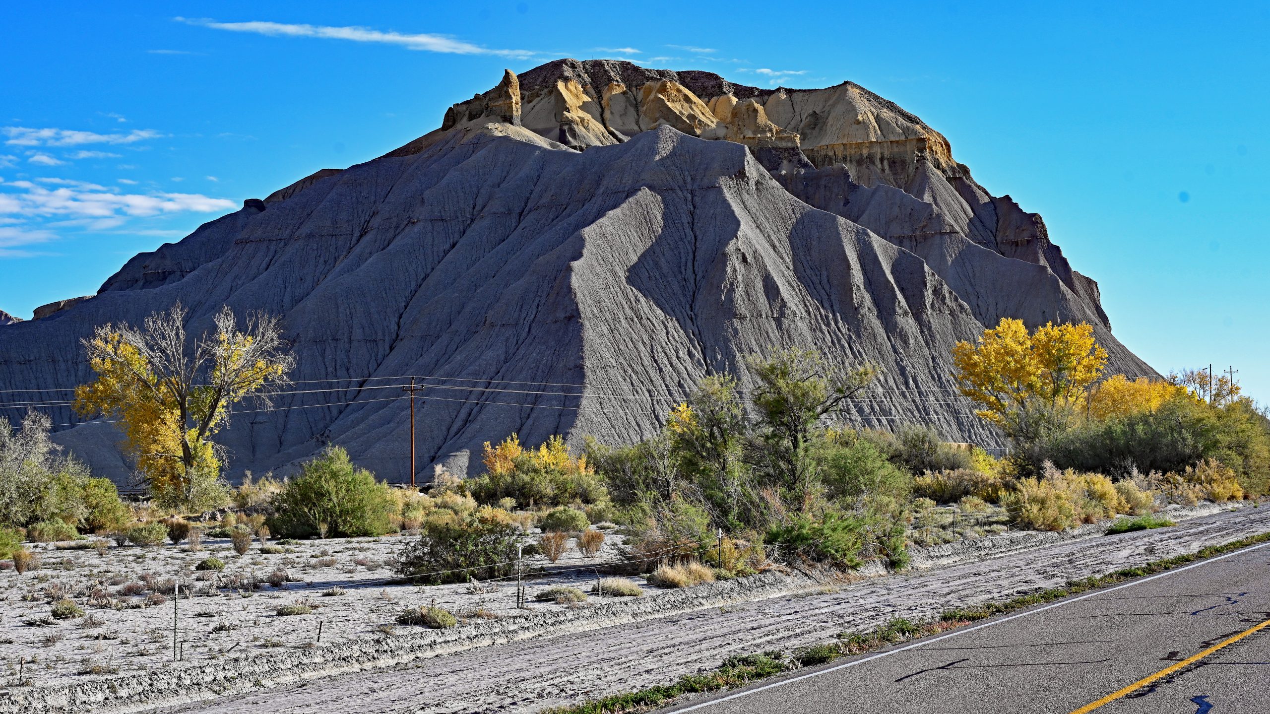 Später las ich, warum dieser Abschnitt der Panoramastraße „The Grey“ genannt wird. Geologische Untersuchungen des Gebiets um den Capitol Reef Nationalpark zeigen, dass hier graue Schiefer- und Tonsteinformationen die Landschaft prägen. Diese sogenannten Blue-Gate-Schiefer verwittern zu bläulich-grauen Hängen, über denen sich härtere Sandsteinschichten türmen. So entsteht das typische „kühle“ Farbspiel aus Graublau, Blassgelb und Silber, das diese Region so einzigartig macht.