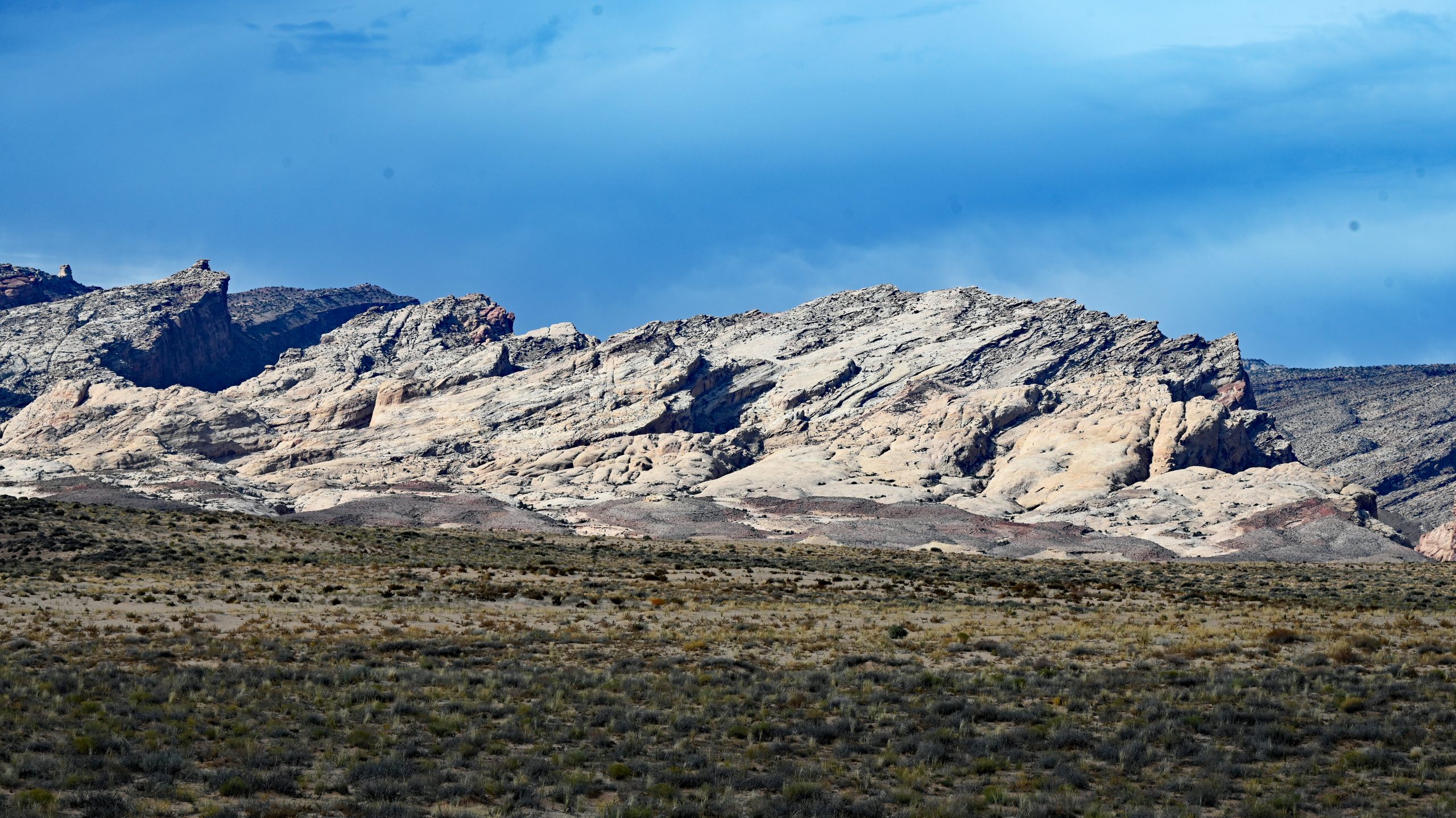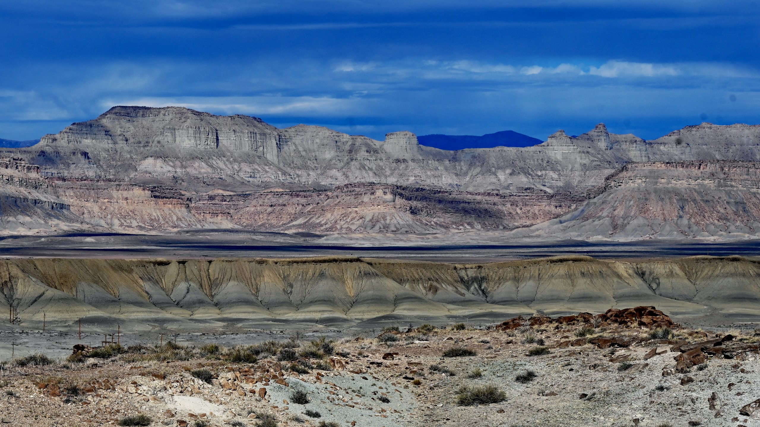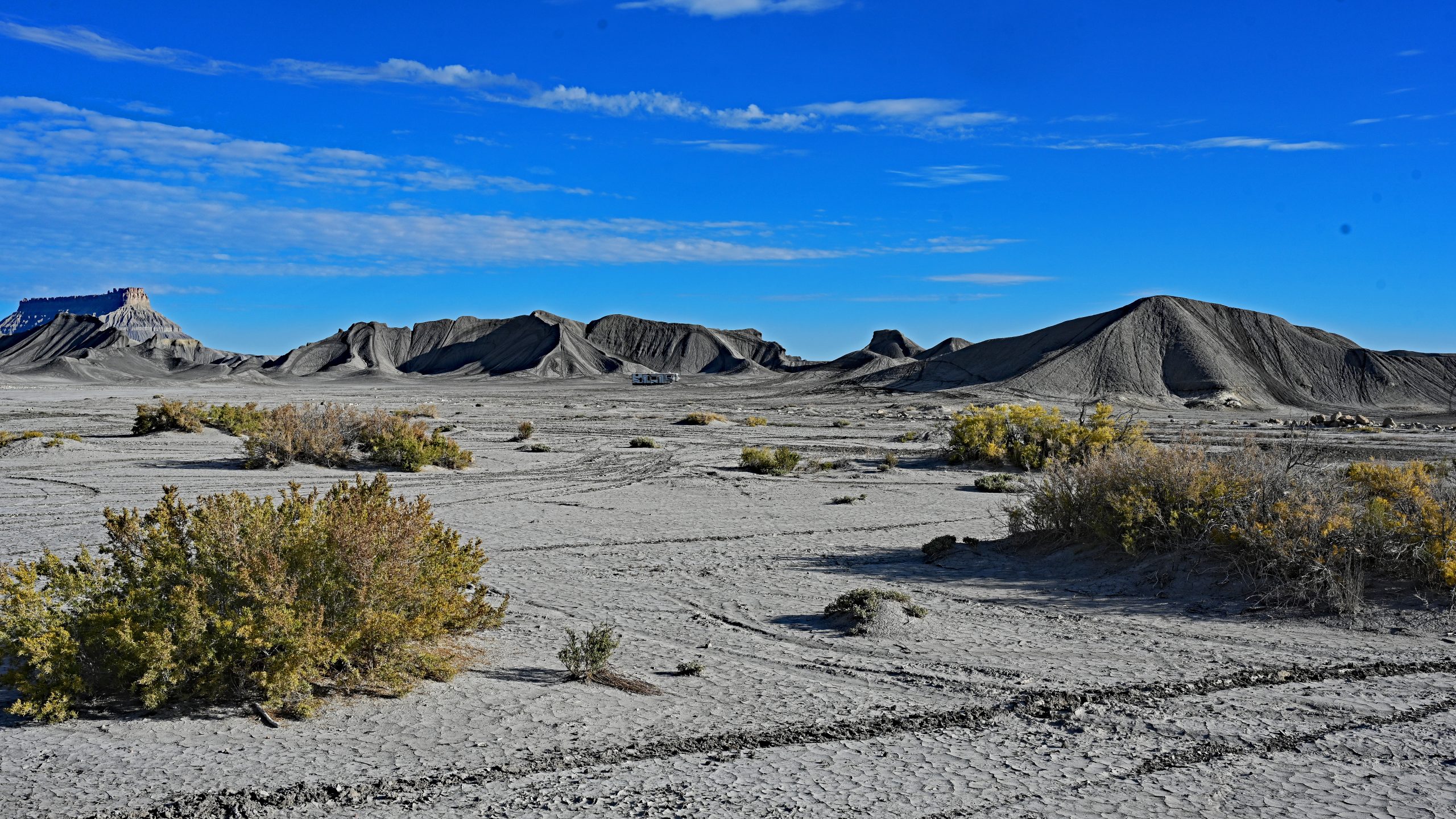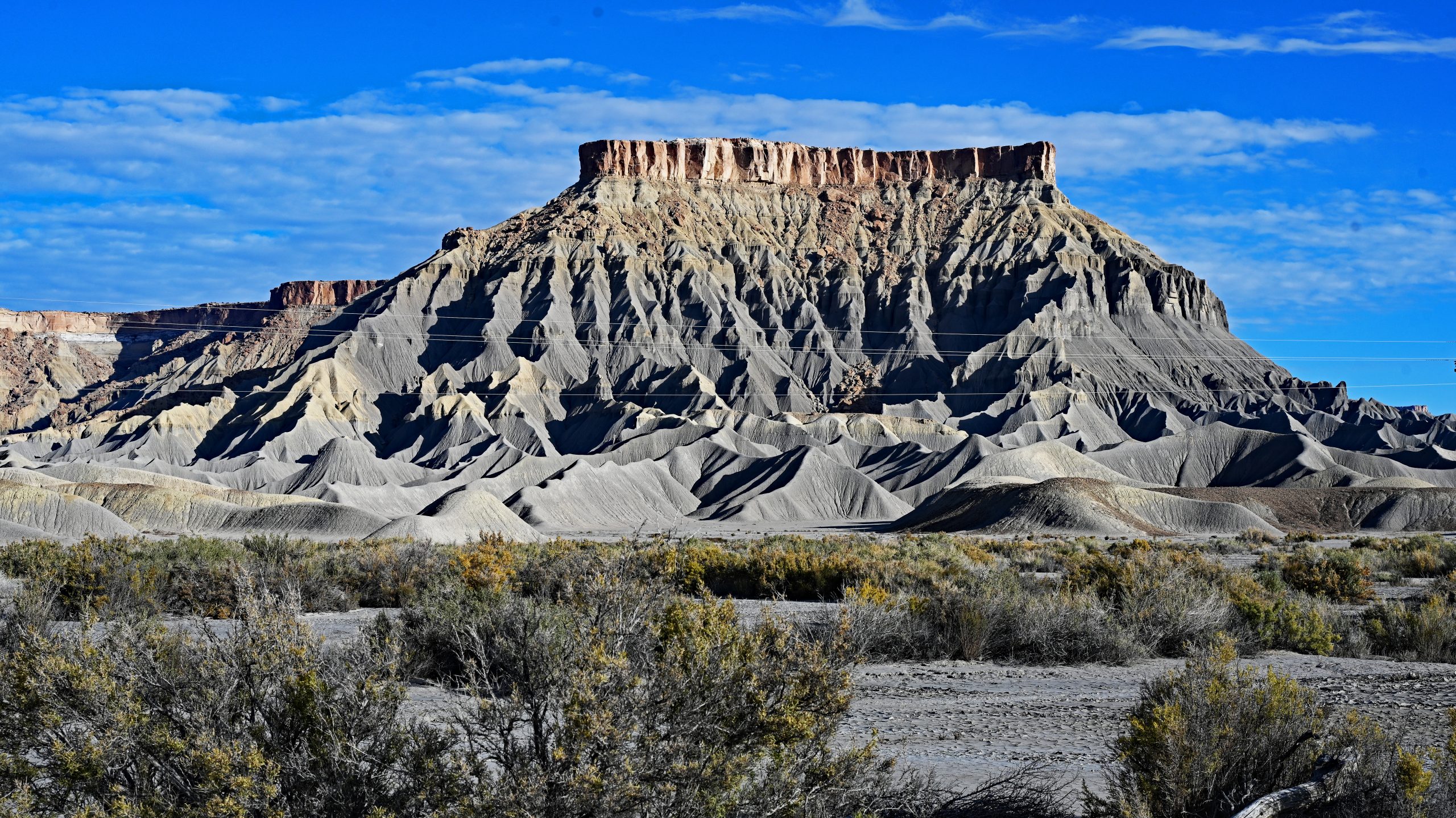 Später las ich, warum dieser Abschnitt der Panoramastraße „The Grey“ genannt wird. Geologische Untersuchungen des Gebiets um den Capitol Reef Nationalpark zeigen, dass hier graue Schiefer- und Tonsteinformationen die Landschaft prägen. Diese sogenannten Blue-Gate-Schiefer verwittern zu bläulich-grauen Hängen, über denen sich härtere Sandsteinschichten türmen. So entsteht das typische „kühle“ Farbspiel aus Graublau, Blassgelb und Silber, das diese Region so einzigartig macht.