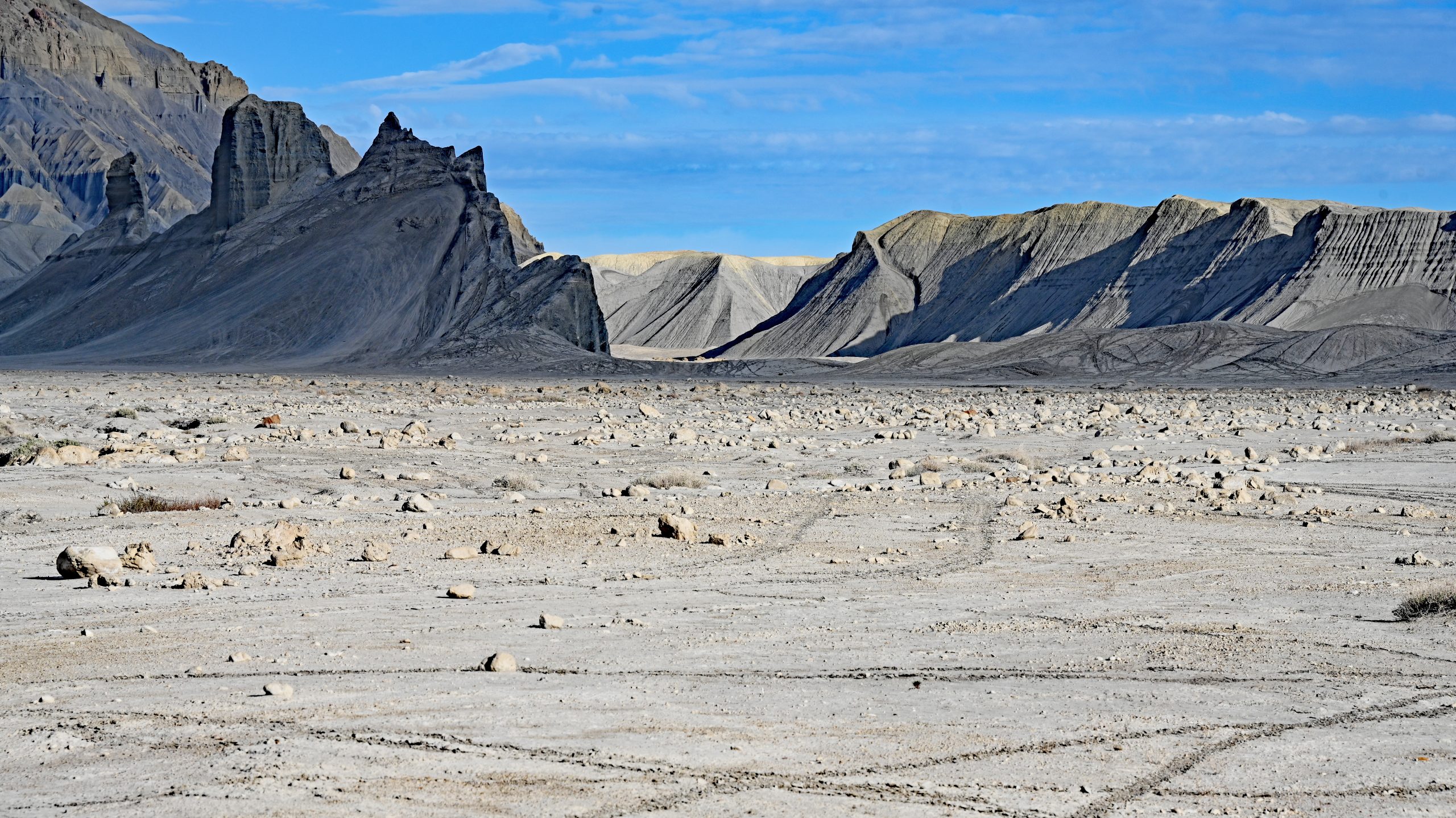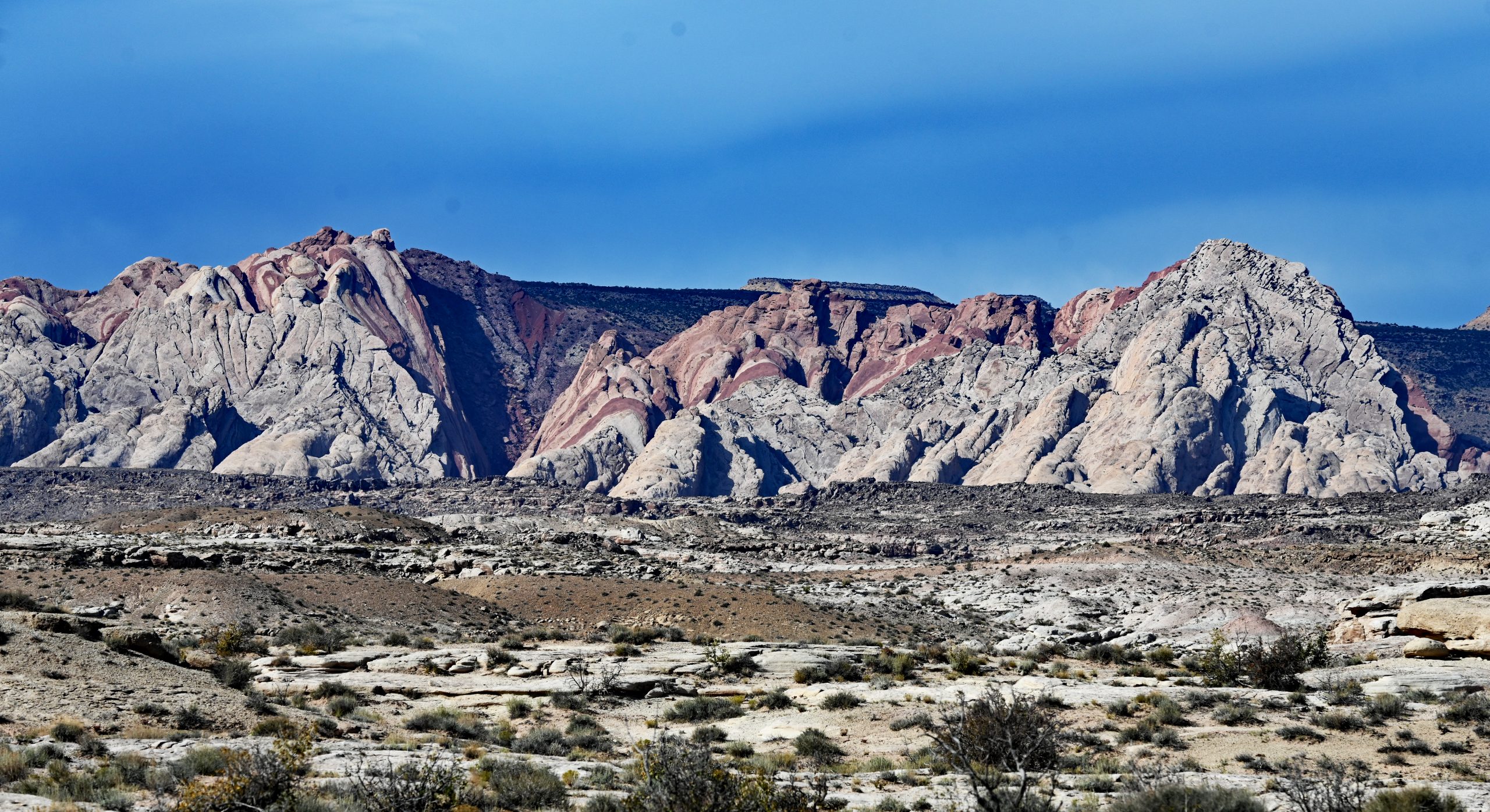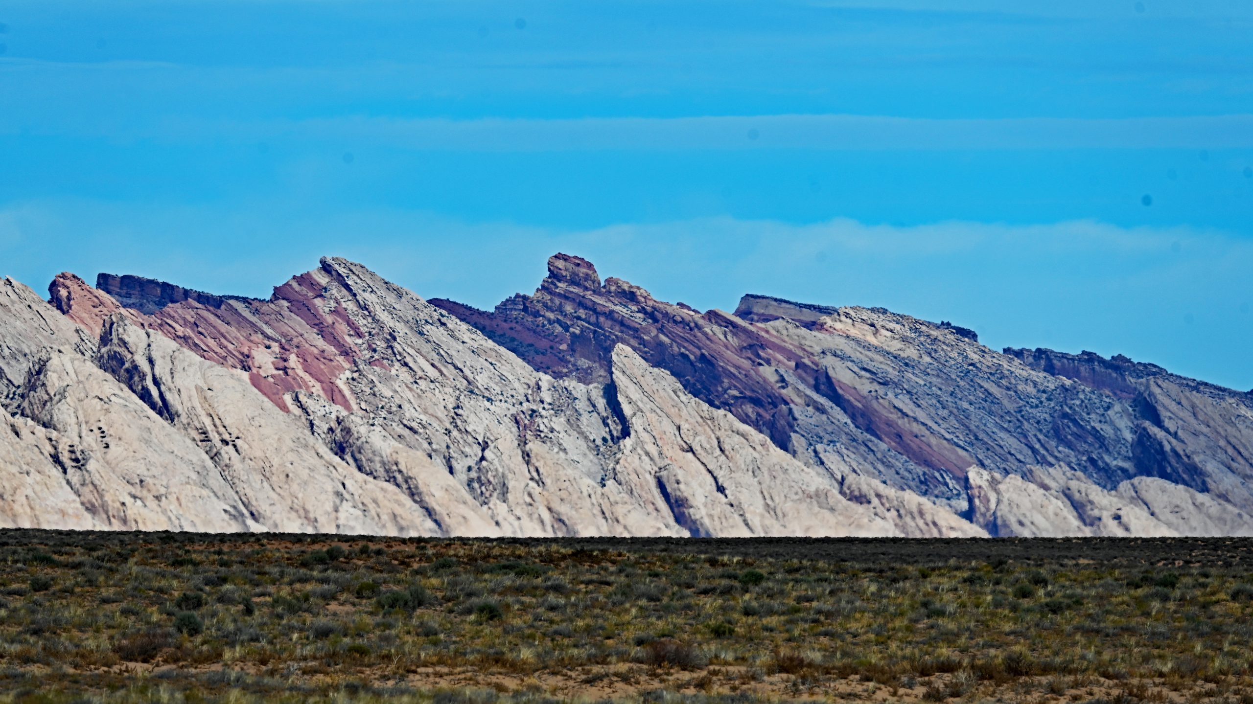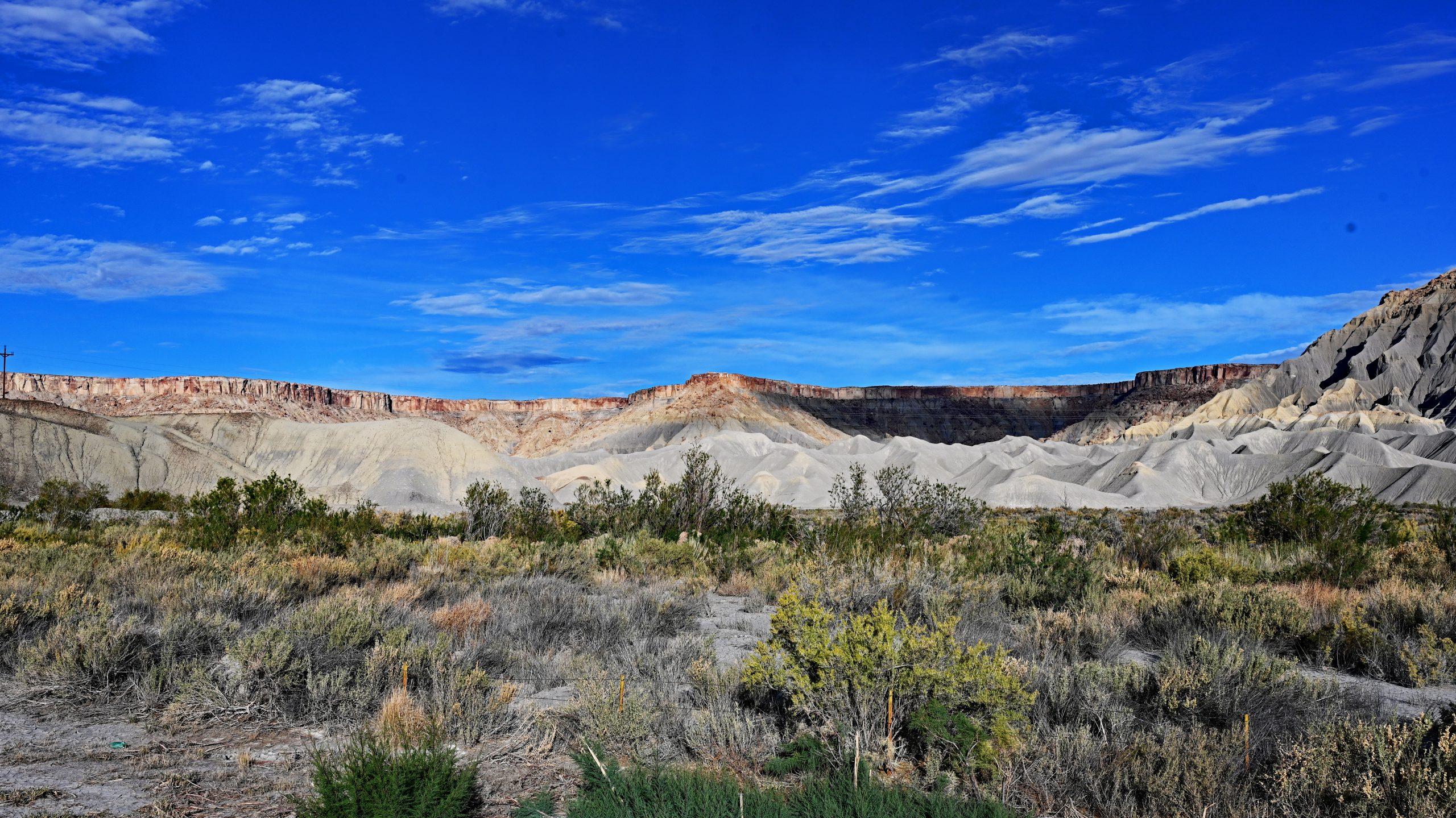 Später las ich, warum dieser Abschnitt der Panoramastraße „The Grey“ genannt wird. Geologische Untersuchungen des Gebiets um den Capitol Reef Nationalpark zeigen, dass hier graue Schiefer- und Tonsteinformationen die Landschaft prägen. Diese sogenannten Blue-Gate-Schiefer verwittern zu bläulich-grauen Hängen, über denen sich härtere Sandsteinschichten türmen. So entsteht das typische „kühle“ Farbspiel aus Graublau, Blassgelb und Silber, das diese Region so einzigartig macht.