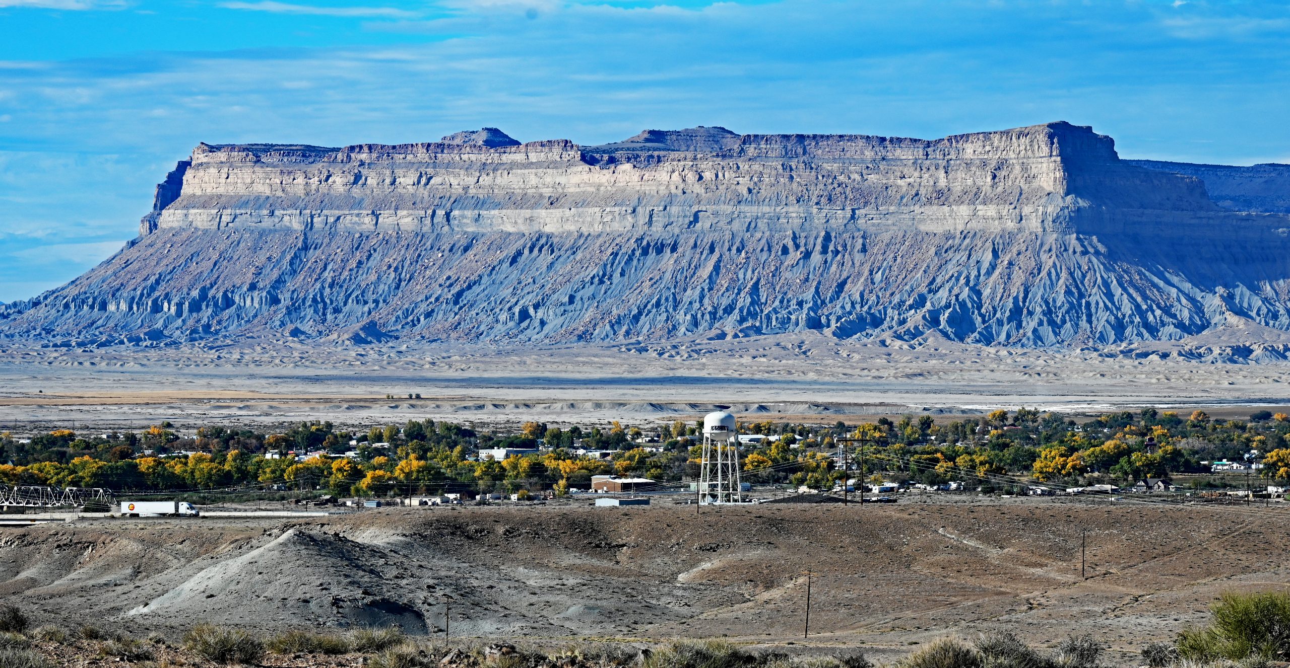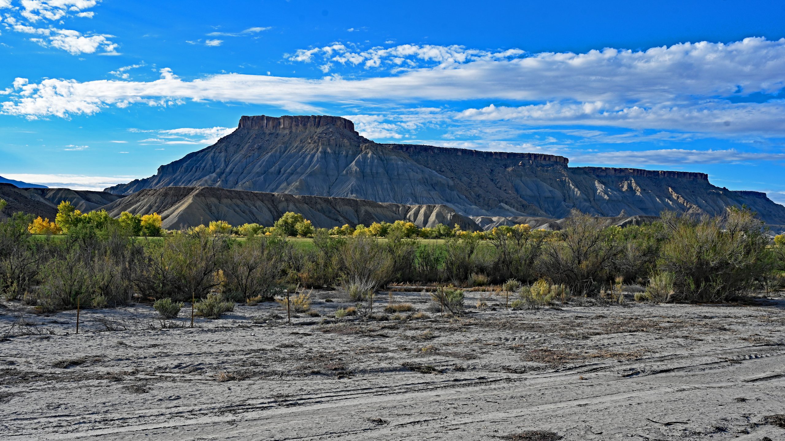 Nach der unerwarteten Reifenpanne am Morgen, einige Meilen vor Hanksville, setzte ich meine Fahrt in Richtung Green River nach einer kleinen Pause in Hanksville und einem Capuchino fort. Der Ersatzreifen war dünn, und die bevorstehenden Meilen schienen lang – doch die Landschaft entschädigte für jede Sorge. Der Highway schlängelte sich durch eine weite, offene Wüste, in der die grauen Hügel allmählich in tiefere, wärmere Farbtöne übergingen. Auf der Westseite erhoben sich mächtige Felsrücken aus der Ebene – Schicht um Schicht, vom Wind und der Zeit zu Schluchten und Türmen geformt. Das Licht wechselte ständig: mal glühten die Felswände in hellem Silber, mal lagen tiefe, bläuliche Schatten in den Falten. Weiter oben verwandelten sich die grauen Basen in Rot- und Goldtöne, wo das Sonnenlicht die oberen Schichten traf, als würde die Erde selbst sanft unter dem Himmel brennen. Oft hielt ich an, um zu fotografieren und die Stille zu atmen. Jeder Windstoß brachte Staub und den Duft von trockenem Salbei mit sich.