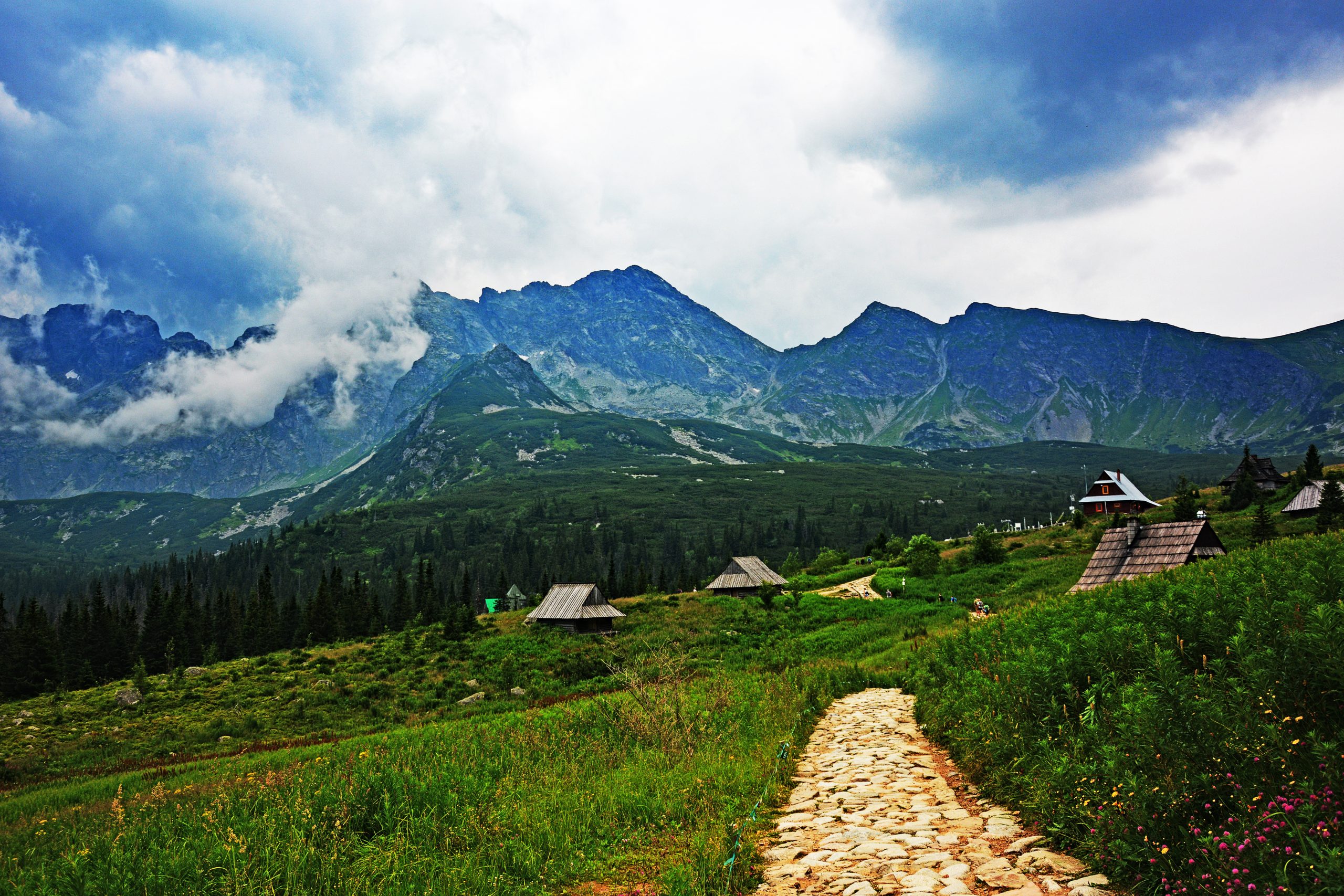 Nach etwa fünfundvierzig Minuten lichtete sich der Wald, und wir traten hinaus auf die weiten Almflächen der Hala Gąsienicowa. Der Übergang war abrupt und wunderschön. Dunkles Waldgrün wich offenen Wiesen im Sommerlicht, übersät mit niedrigen, hölzernen Schäferhütten – den traditionellen Szałasy. Ihr verwittertes Holz und die schrägen Dächer wirkten, als seien sie aus der Landschaft selbst hervorgegangen, geformt von Wind, Schnee und jahrhundertelanger Nutzung. Ringsum erhob sich ein dramatisches Bergpanorama aus steilen Graten, scharfen Gipfeln und tiefen Rinnen, die Wasser und Frost in den Fels geschnitten hatten.