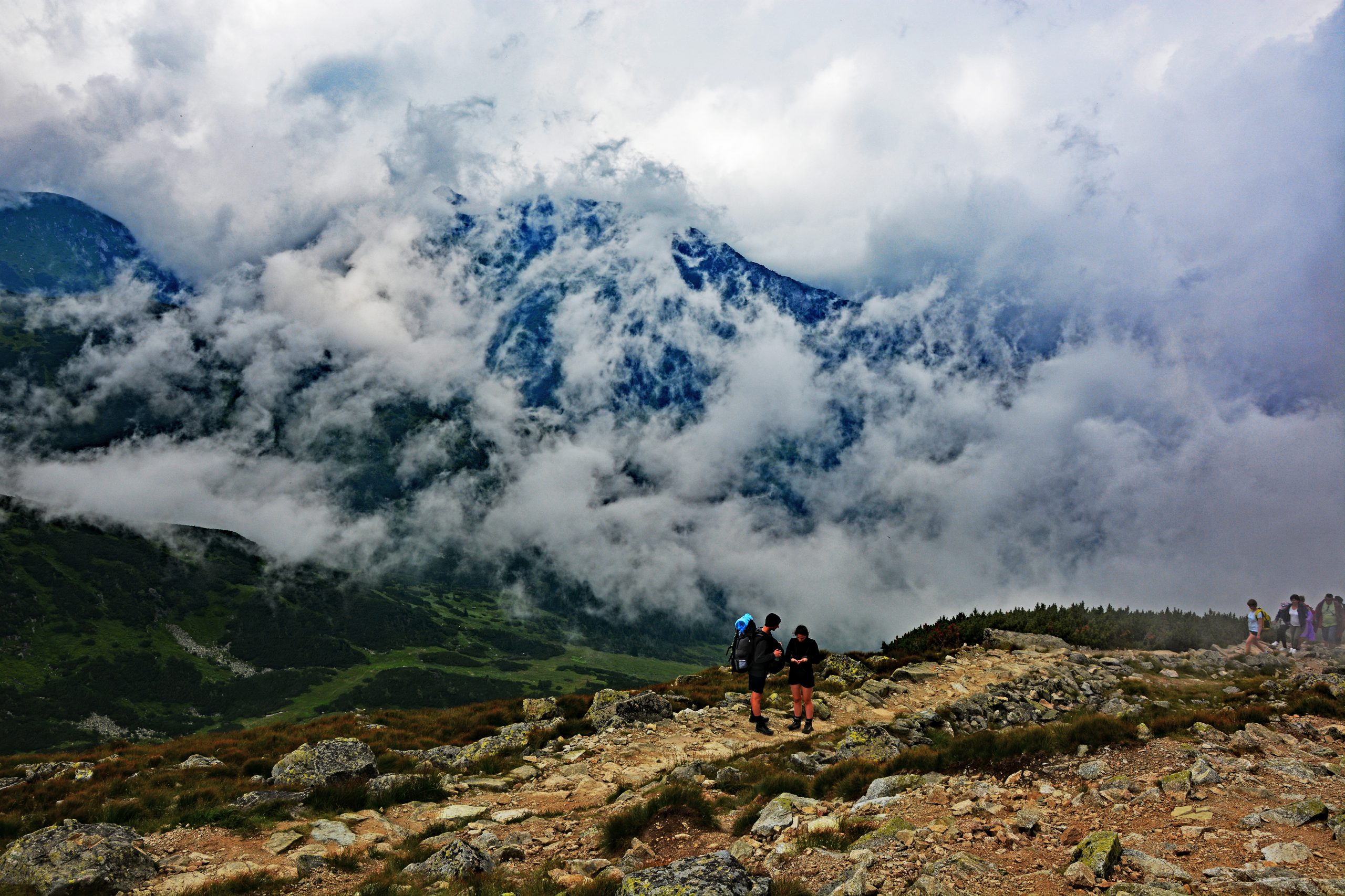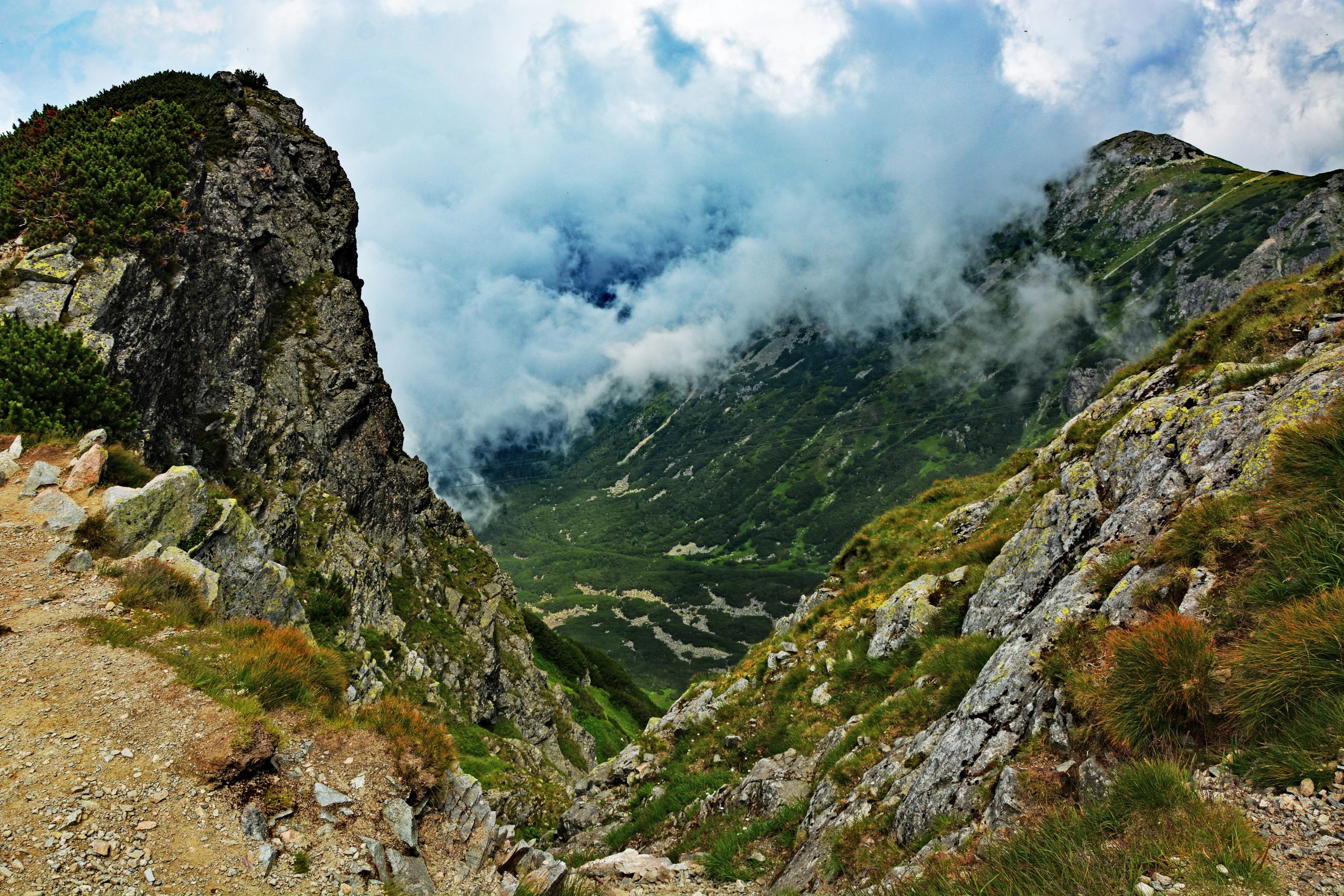 Der Rückweg führte über den grünen Weg durch die Myślenickie Turnie zurück nach Kuźnice, vorbei an der Droga Brata Alberta 1. Der Abstieg dauerte deutlich länger als erwartet. Mit jedem Schritt nahm der Druck auf meine großen Zehen zu, und die Schmerzen verlangsamten mich. Dennoch blieb die Landschaft überwältigend: Wolken, die sich um Gipfel legten, Licht, das silbern durchbrach, und die stille Präsenz der Berge – alt, unbeweglich und zeitlos.