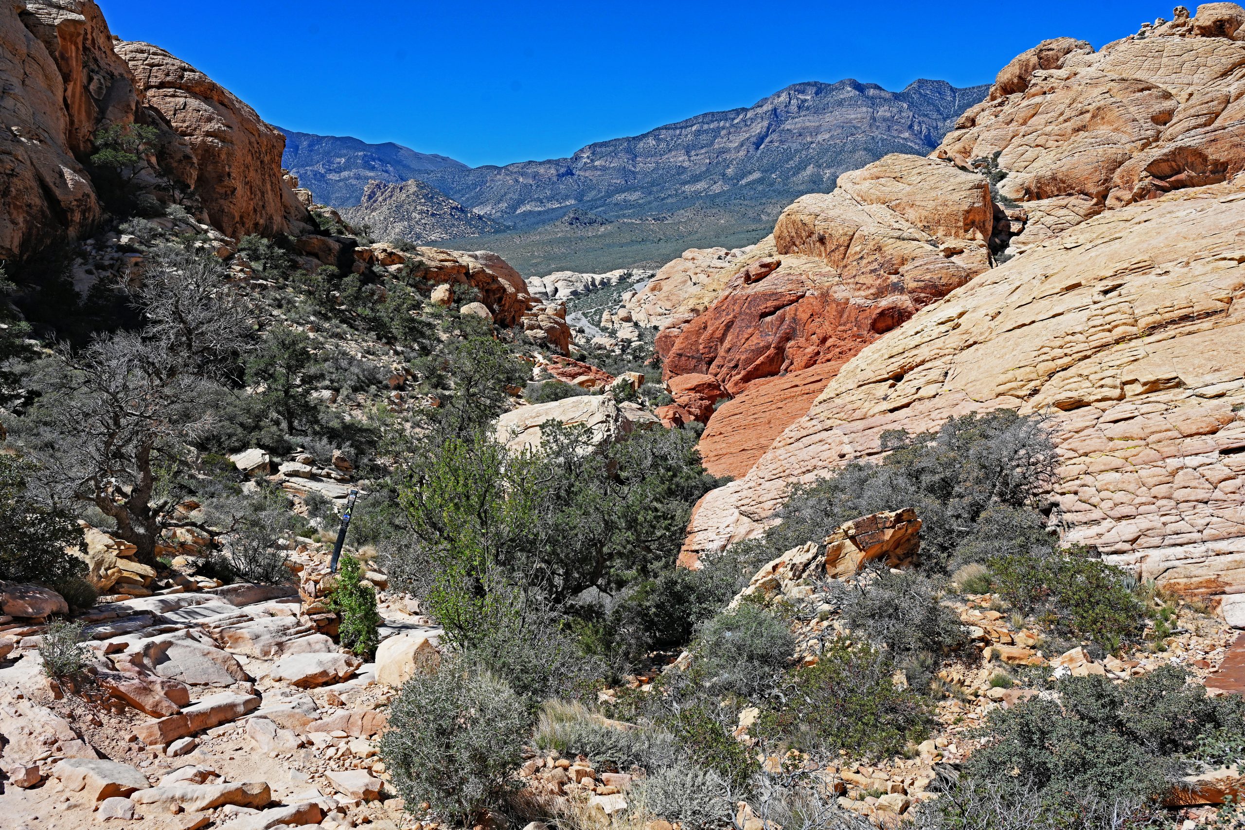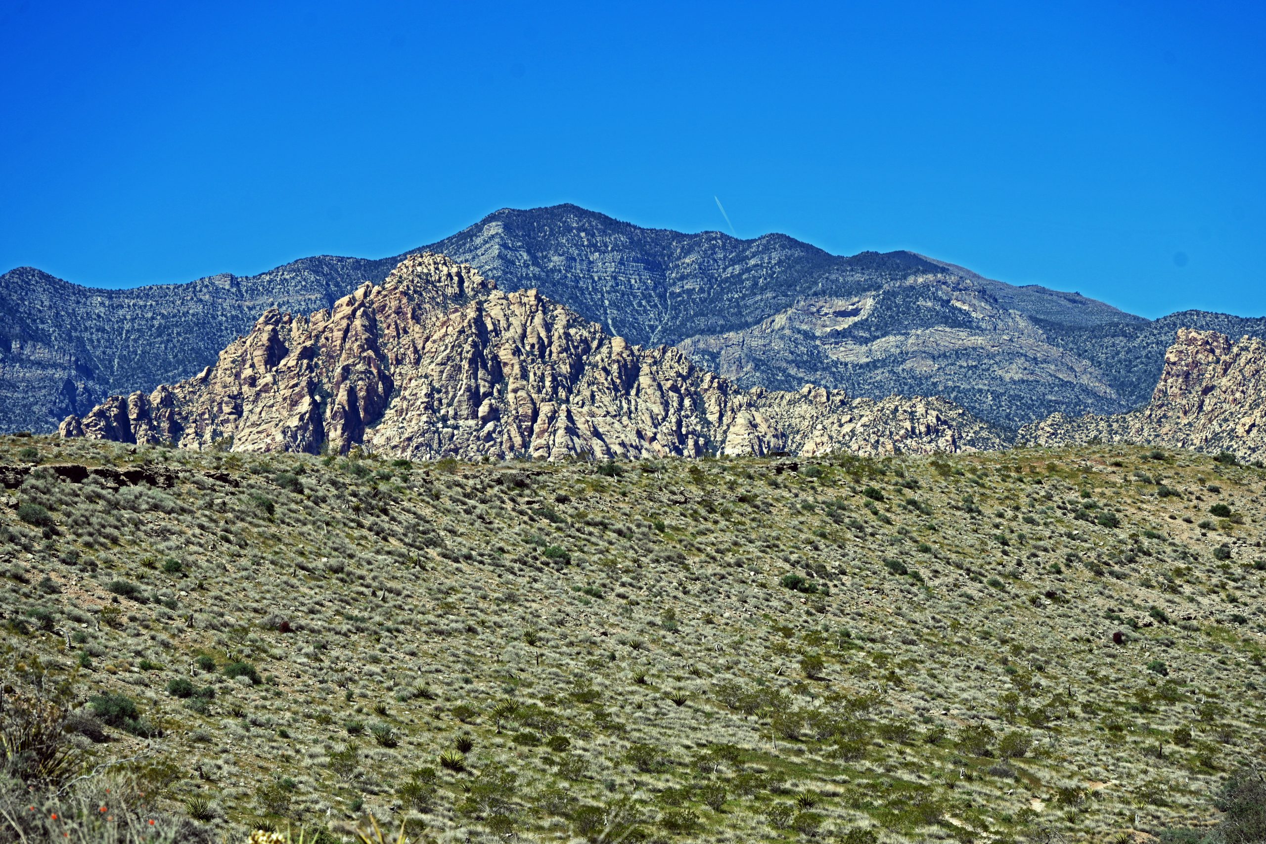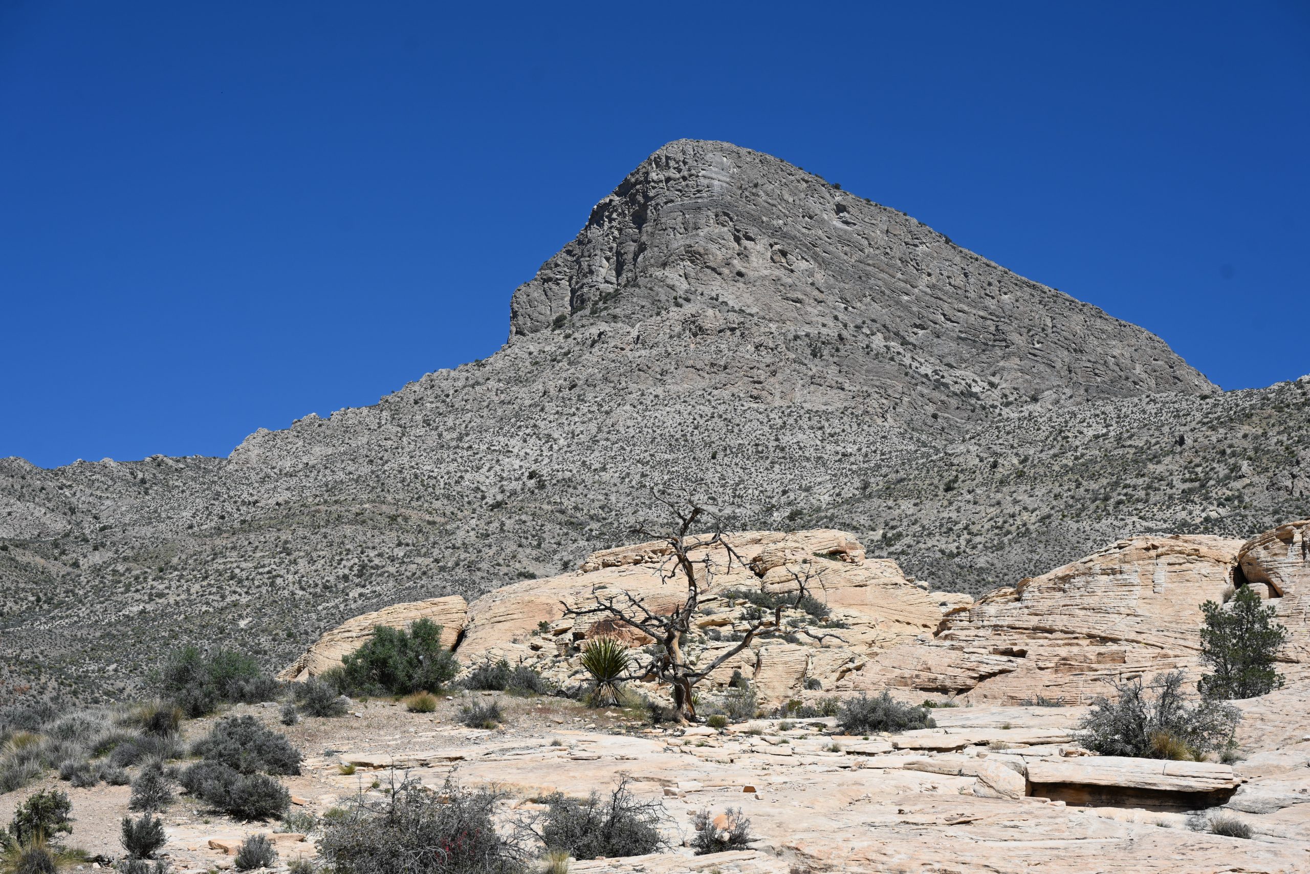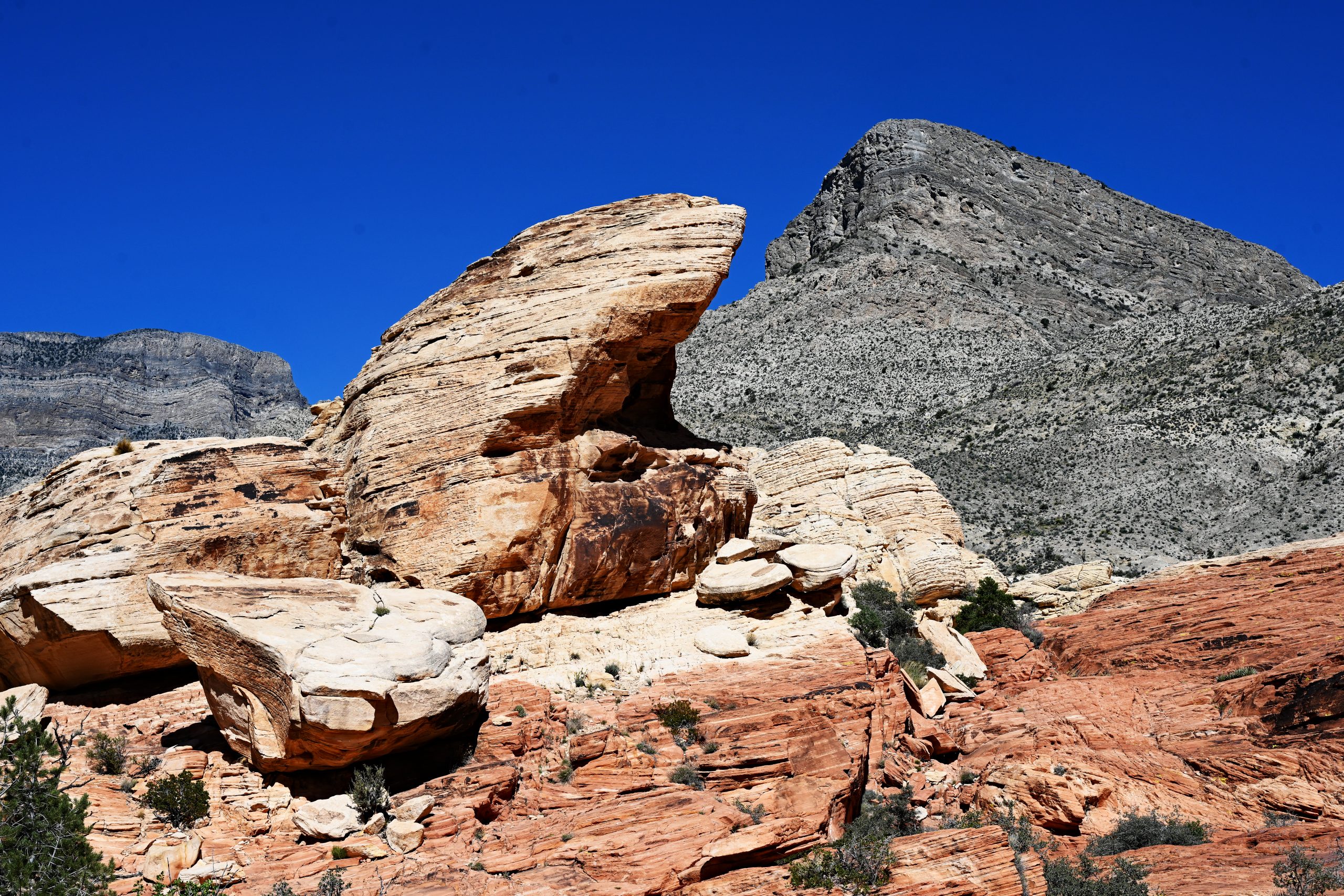 Wir schnürten die Wanderschuhe fester und machten uns bereit für den Trail zu den Calico Tanks. Der Weg begann gemächlich über Kieswege, gesäumt von kargen Büschen. Doch immer wieder zwangen uns die Ausblicke zum Stehenbleiben. Besonders der Turtlehead Mountain zog unsere Blicke auf sich. Er ist Teil der berühmten Keystone Thrust Fault – ein geologisches Wunderwerk, bei dem uralter, grauer Kalkstein über den deutlich jüngeren, roten Sandstein geschoben wurde. Dieser dramatische Farbbruch erzählt die Geschichte von gewaltigen Erdkräften, die hier aufeinanderprallten.