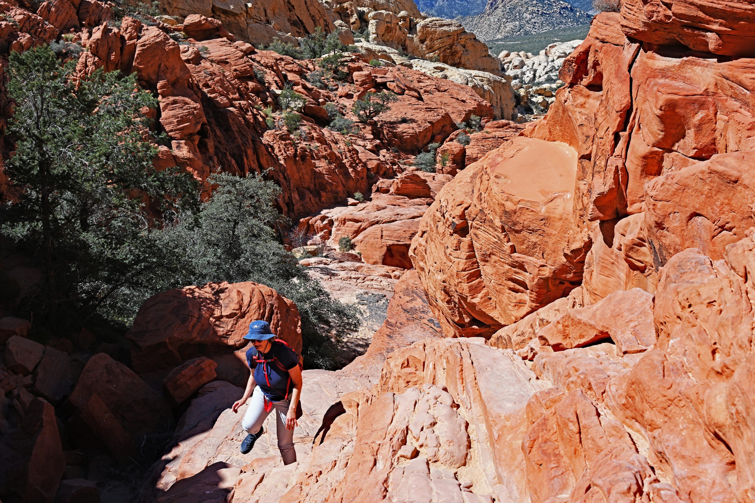 Der Aufstieg zu den Calico Tanks forderte uns einiges ab. Der Pfad wand sich über steile Steintreppen nach oben, und bei den kleineren Wasserbecken – den sogenannten „Tanks“ – wurde es stellenweise so eng, dass man fast eins mit dem Fels wurde. In einem Moment falschen Übermuts versuchte ich, die Passage untenherum zu umgehen. Ein Fehler: Der Boden war tückisch, und ich verlor fast den Halt. Erst auf dem Rückweg nutzte ich den oberen Übergang, der sich als deutlich sicherer und leichter erwies.