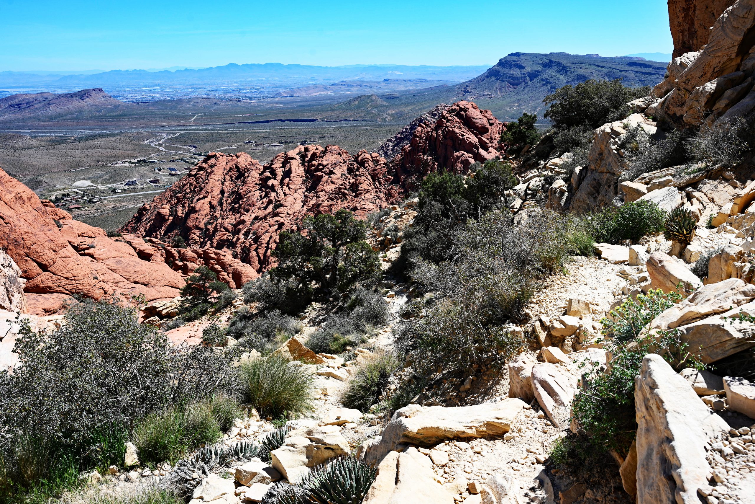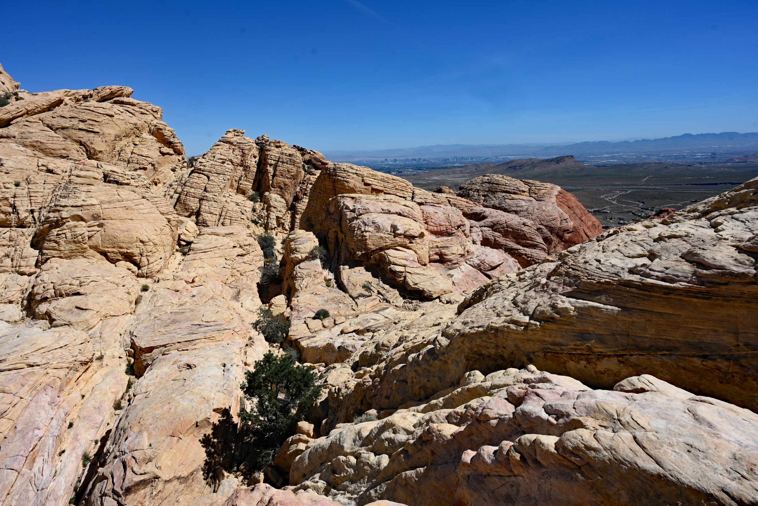 Oben angekommen, bot sich uns ein bizarres Bild. In den Tanks spiegelten sich die Felswände, obwohl das stehende Wasser durch die Mineralien gelb und rot verfärbt war. Der Blick zurück öffnete das Panorama über die Calico Hills von der Rückseite, und in der Ferne flimmerte das Häuserkapitel von Las Vegas in der Wüstenhitze.