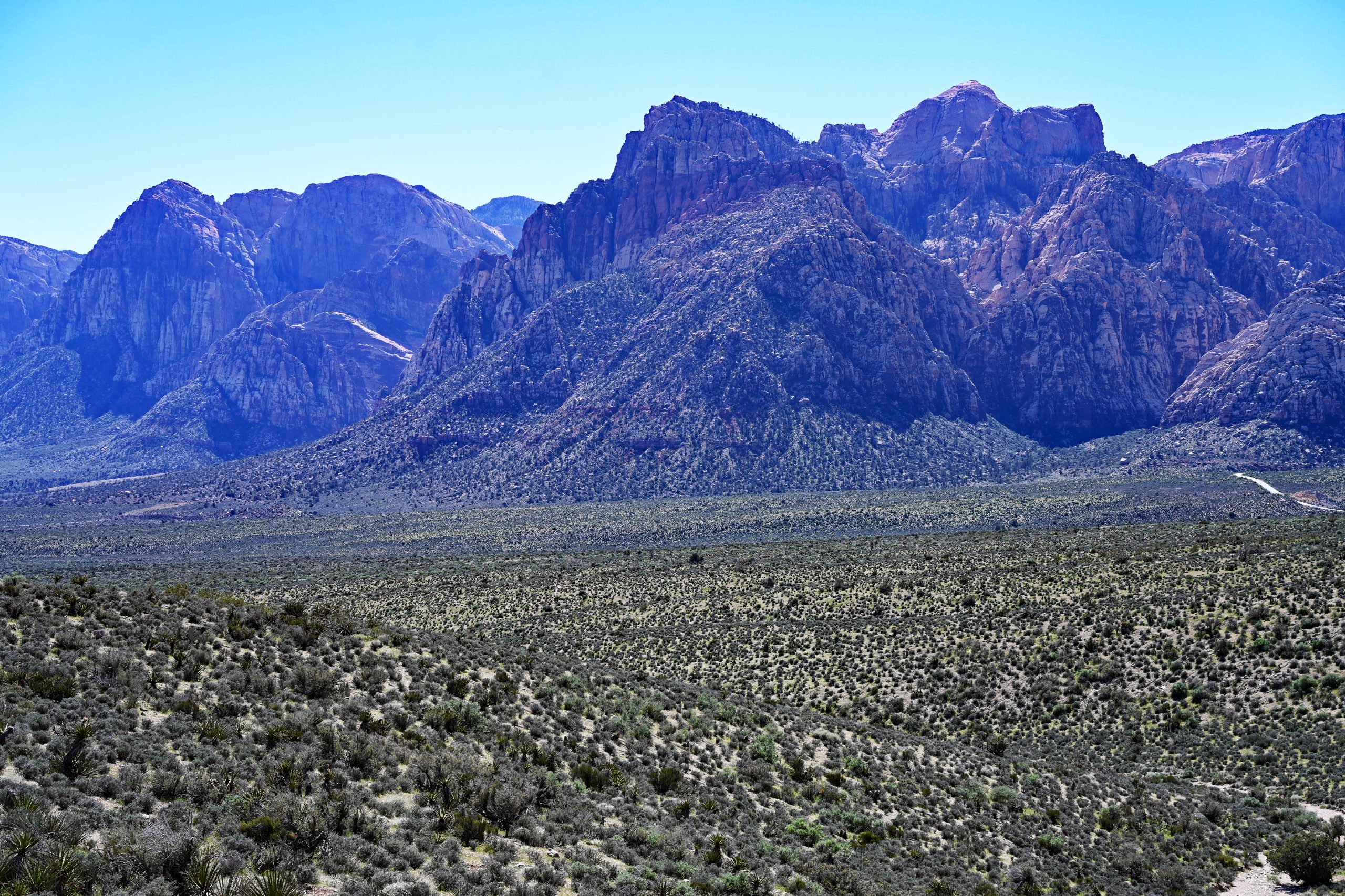 Wieder am Auto folgten wir der Scenic Route zum High Point Overlook. Das Panorama im Süden ist gewaltig: Der Mount Wilson steht dort als massiver Anker der Wilson Cliffs. Rechts davon erstreckt sich die farbenfrohe Rainbow Mountain Wilderness. Obwohl das Licht nun sehr grell war, erkannte man deutlich den Bridge Mountain, der leicht versetzt hinter den vorderen Kämmen thront. Ganz im Südosten zeichnete sich der flachere Blue Diamond Hill aus Kalkstein ab.