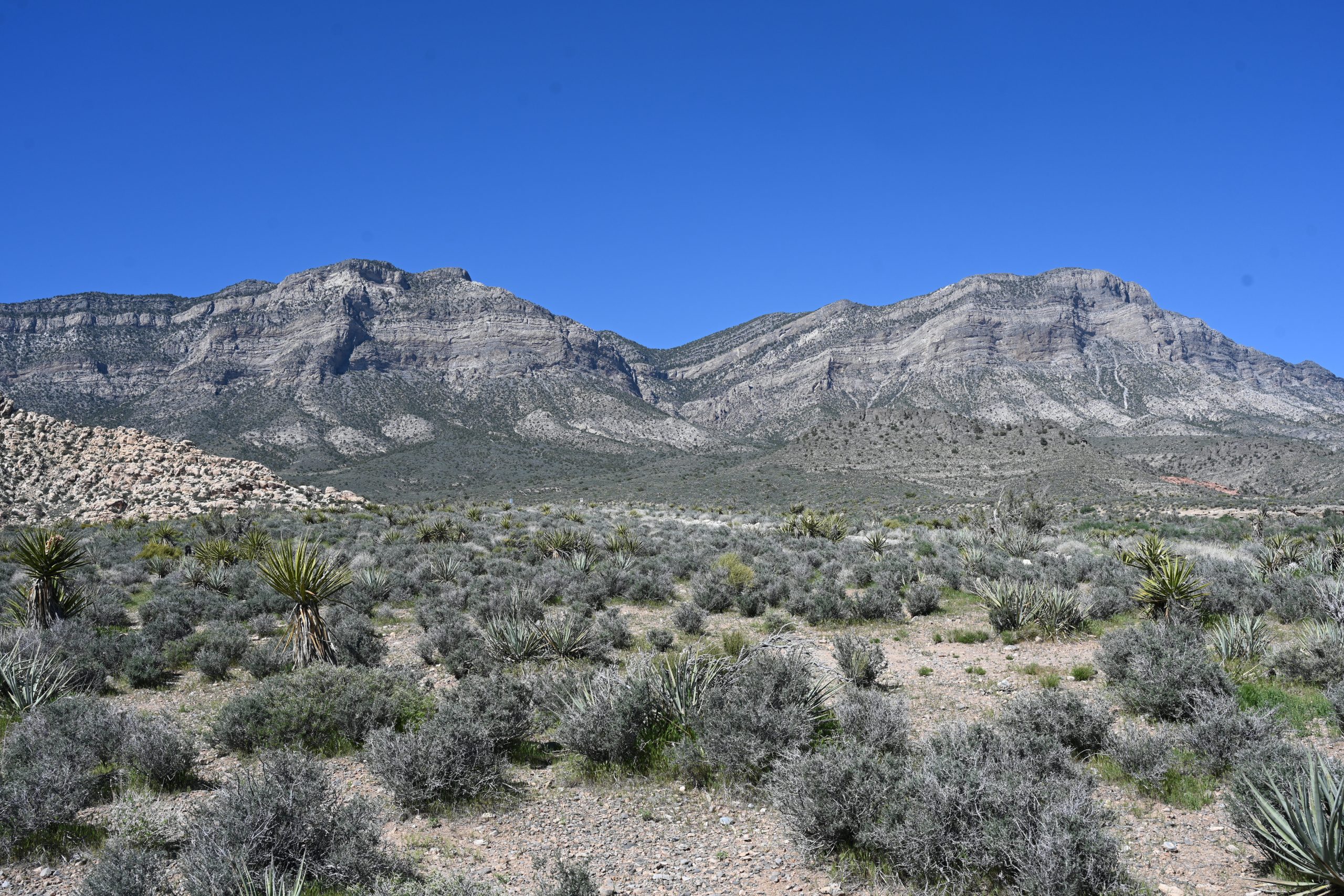 Am ersten Stopp, Calico I, empfing uns ein strahlend blauer Himmel bei bereits 27 Grad. Als wir den Wanderweg hinunterstiegen, umgab uns die Stille der Wüste, nur unterbrochen vom Knirschen unserer Schritte. Wir kletterten auf einen der mächtigen Felsen, um das Panorama aufzusaugen. Die Farben hier sind fast surreal: Ein tiefes, sattes Rot trifft auf sanftes Grau. In der Ferne ragte die Rückseite des White Rock Mountain auf – ein massiver, dreieckiger Block, dessen Flanken so präzise und gleichmäßig abfallen, als hätte jemand ein Lineal an den Horizont gelegt. Dahinter thronte, wie ein schützender Wall, die gewaltige La Madre Range. Der Kontrast zwischen dem brennenden Rot im Vordergrund und der kühlen, grauen Erhabenheit der Berge im Hintergrund war atemberaubend.