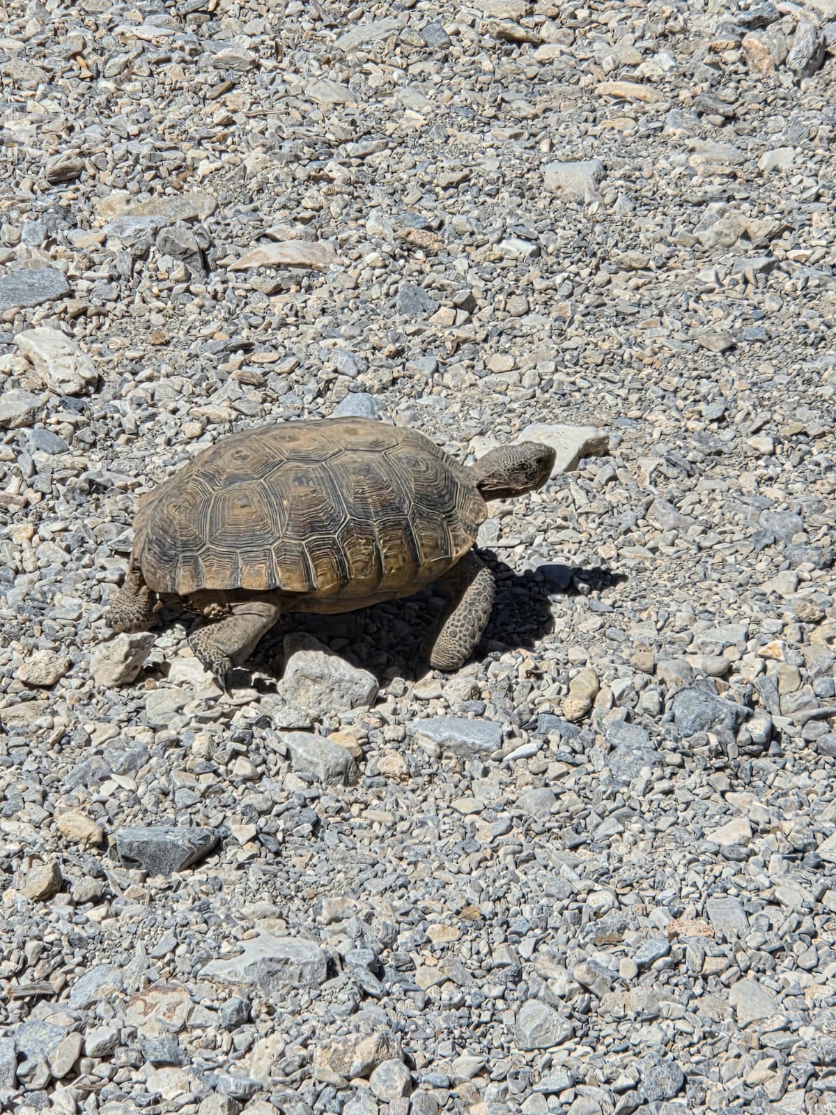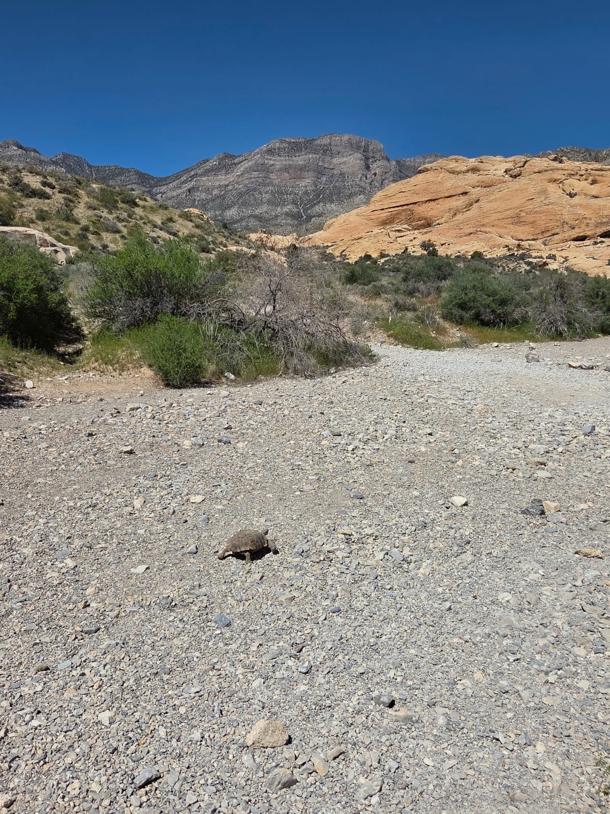 Auf dem Abstieg wartete eine besondere Begegnung auf uns. Eine kleine Wüstenschildkröte kreuzte unseren Weg. Sie strebte zielstrebig in Richtung Turtlehead Mountain – ein amüsanter Anblick, auch wenn sie den Gipfel wohl kaum in diesem Tempo erreichen wird.