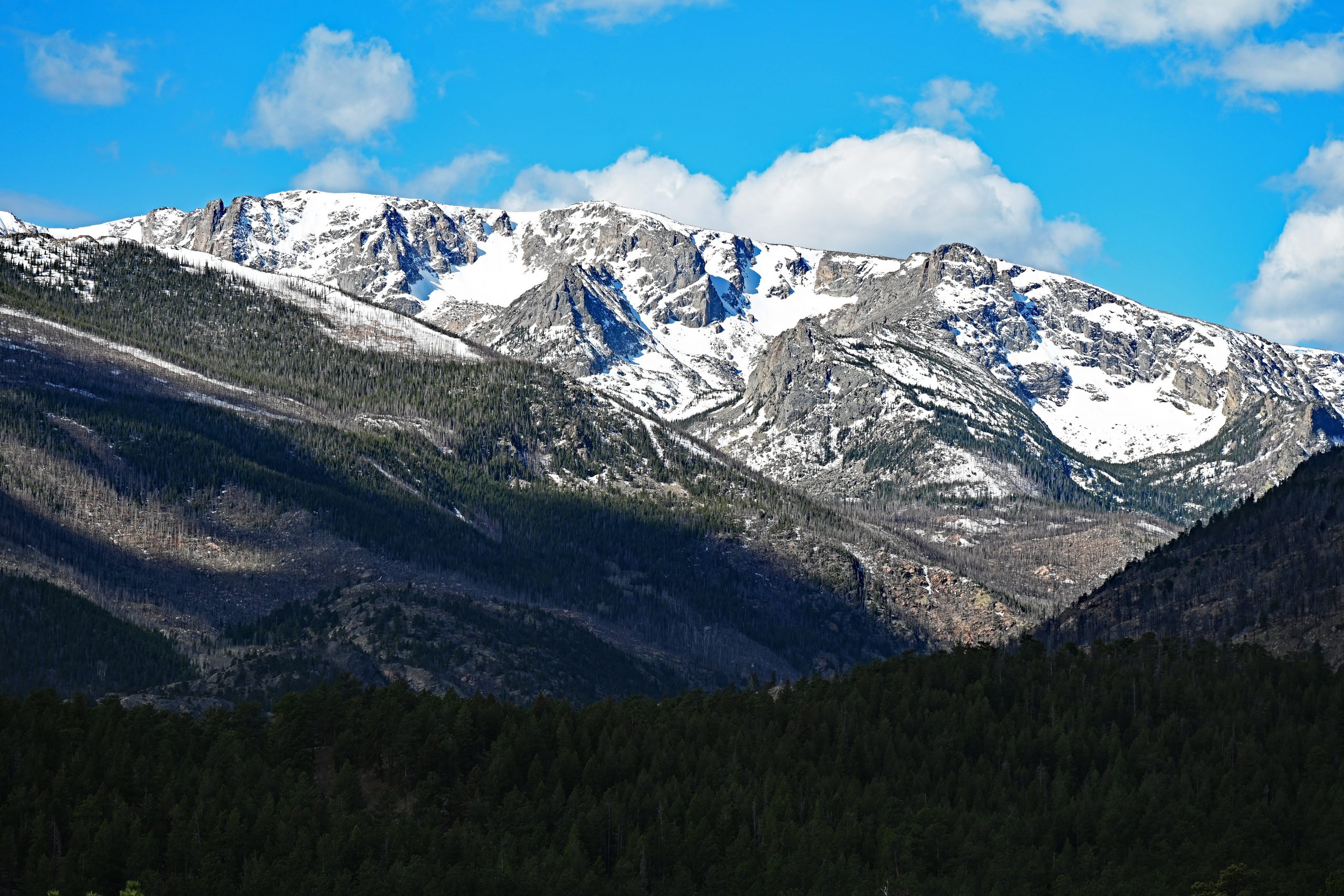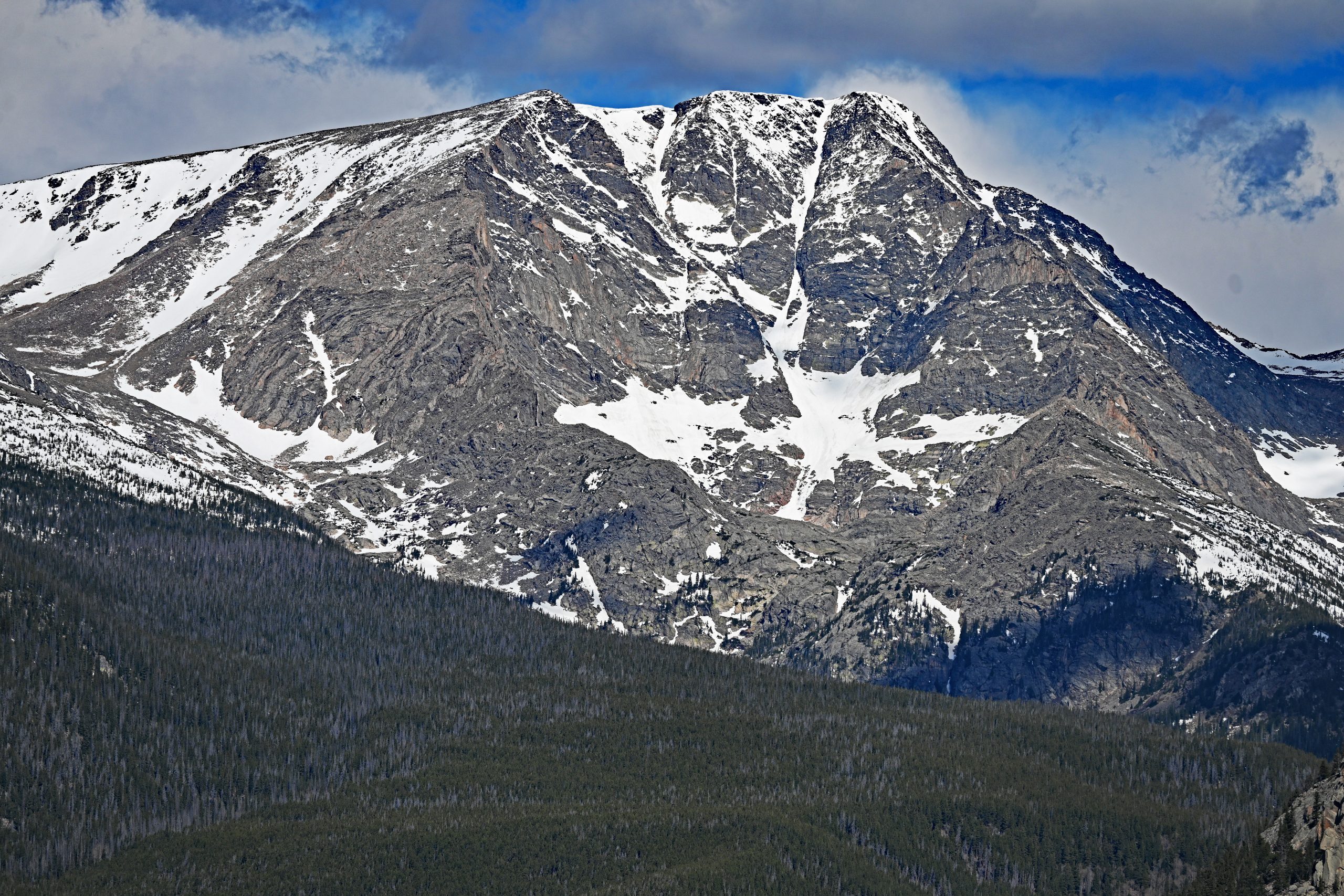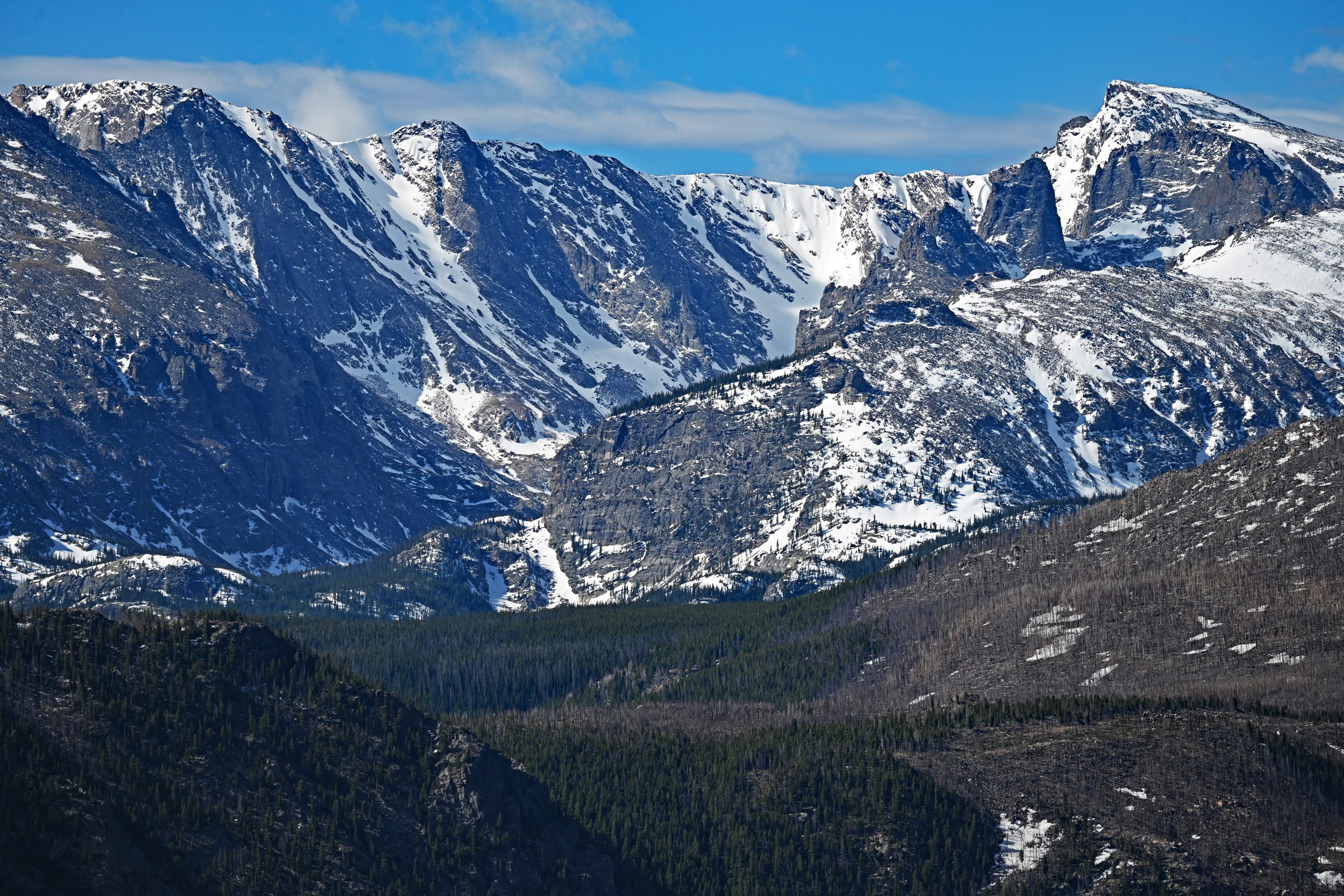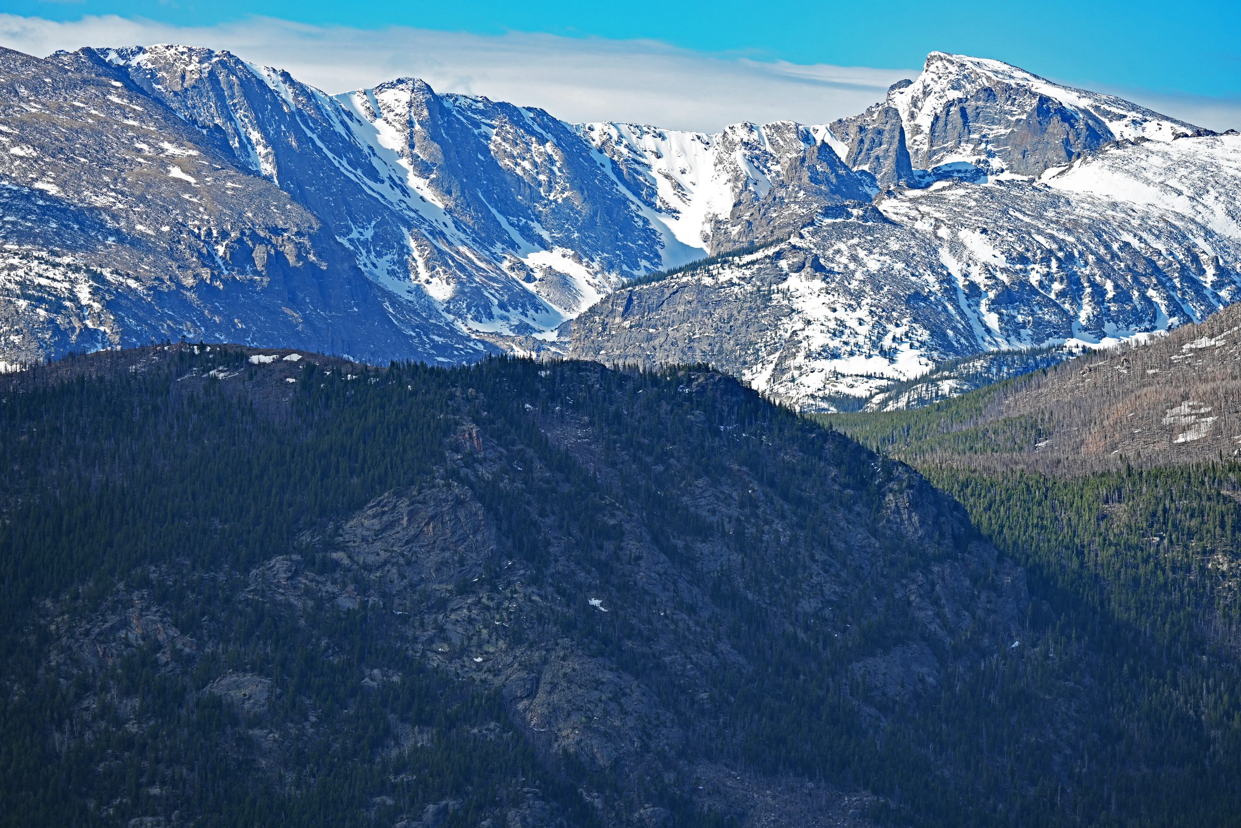 Nach etwa 1,5 Meilen entscheiden wir uns zur Umkehr, da wir heute noch weitere Pfade erkunden möchten. Unser Weg führt uns tiefer in den Park zum Parkplatz des Cub Lake Trail. Von hier aus schweift unser Blick weit nach Westen, hinein in die tiefen Einschnitte des Forest Canyons und hin zu den fernen Gipfeln der Continental Divide. Im unmittelbaren Vordergrund erhebt sich der bewaldete Rücken des Bighorn Mountain, der fast vollständig schneefrei dem Frühling trotzt. Links davon thront dominant der schneebedeckte Stones Peak, während am fernen Ende des Tals der Terra Tomah Mountain über der Szenerie wacht. Zur Rechten vervollständigt der massivere, weiß leuchtende Gipfel des Mount Julian dieses alpine Gemälde. Zwischen diesen Riesen liegt der tief eingeschnittene Forest Canyon, durch dessen Sohle sich der Big Thompson River seinen Weg bahnt.