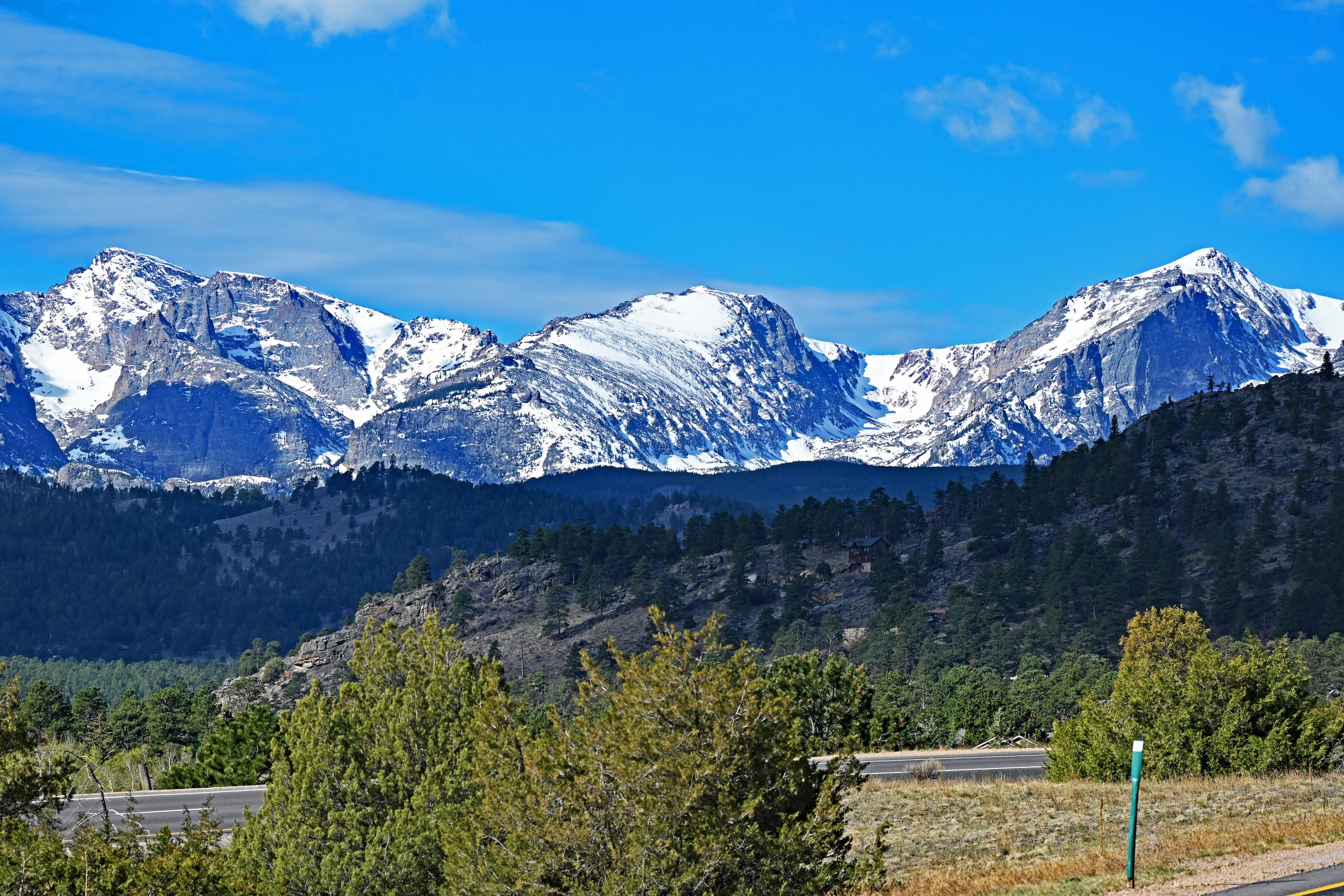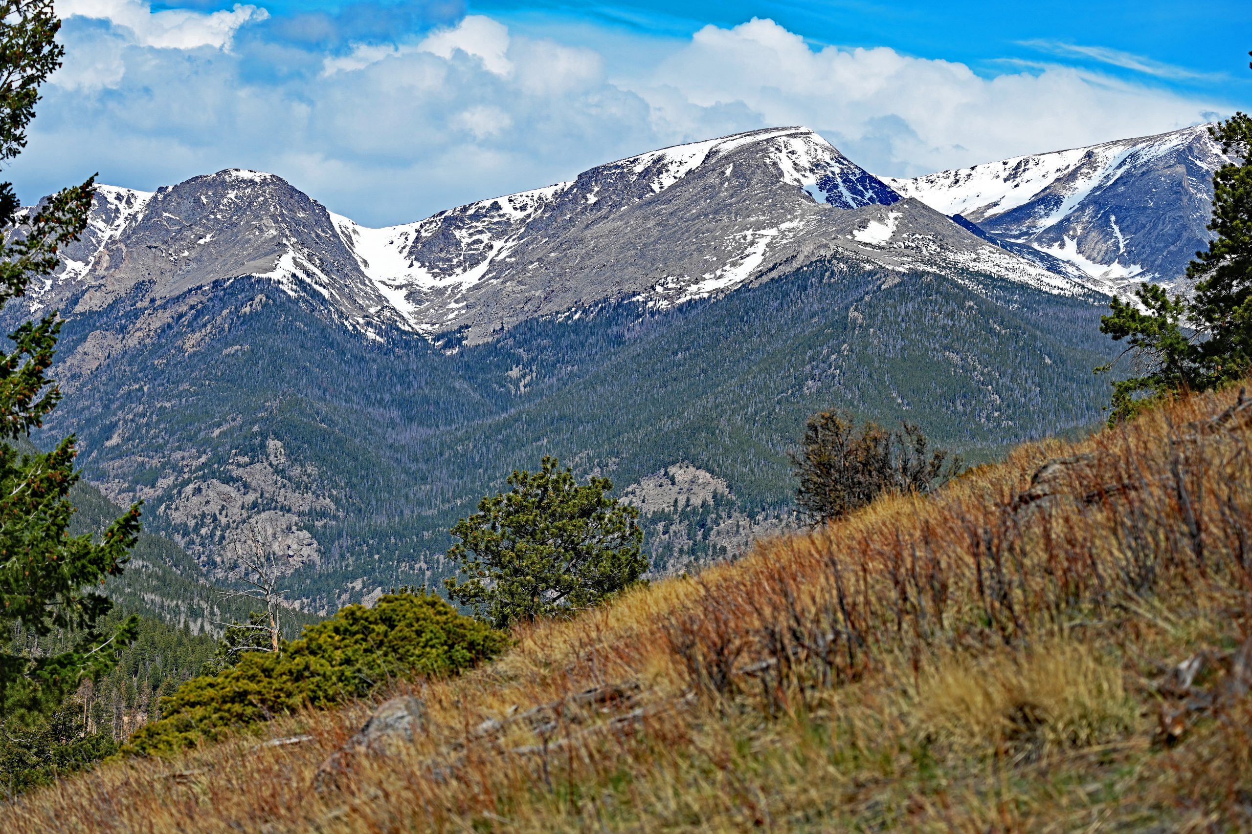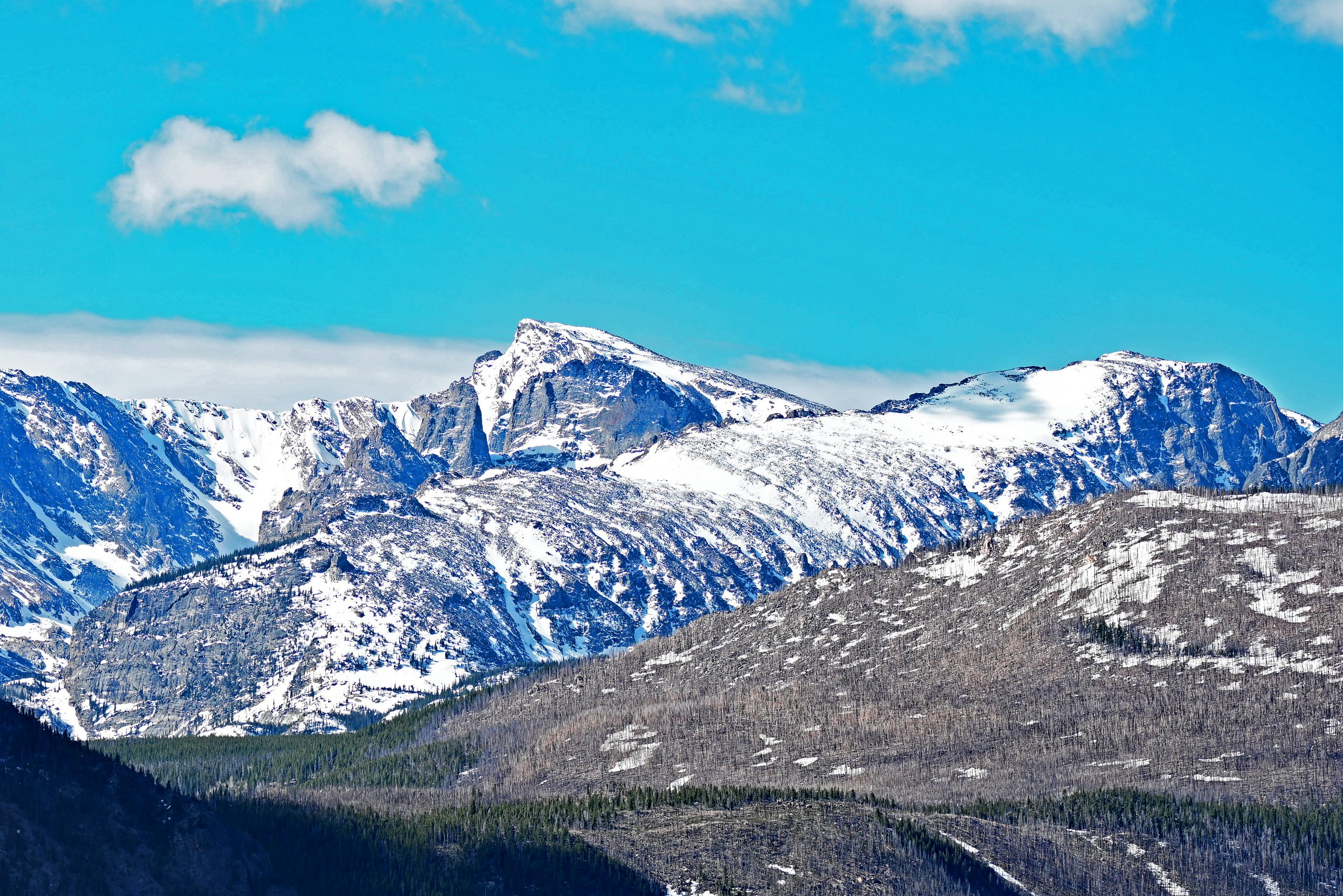 Nach etwa 1,5 Meilen entscheiden wir uns zur Umkehr, da wir heute noch weitere Pfade erkunden möchten. Unser Weg führt uns tiefer in den Park zum Parkplatz des Cub Lake Trail. Von hier aus schweift unser Blick weit nach Westen, hinein in die tiefen Einschnitte des Forest Canyons und hin zu den fernen Gipfeln der Continental Divide. Im unmittelbaren Vordergrund erhebt sich der bewaldete Rücken des Bighorn Mountain, der fast vollständig schneefrei dem Frühling trotzt. Links davon thront dominant der schneebedeckte Stones Peak, während am fernen Ende des Tals der Terra Tomah Mountain über der Szenerie wacht. Zur Rechten vervollständigt der massivere, weiß leuchtende Gipfel des Mount Julian dieses alpine Gemälde. Zwischen diesen Riesen liegt der tief eingeschnittene Forest Canyon, durch dessen Sohle sich der Big Thompson River seinen Weg bahnt.