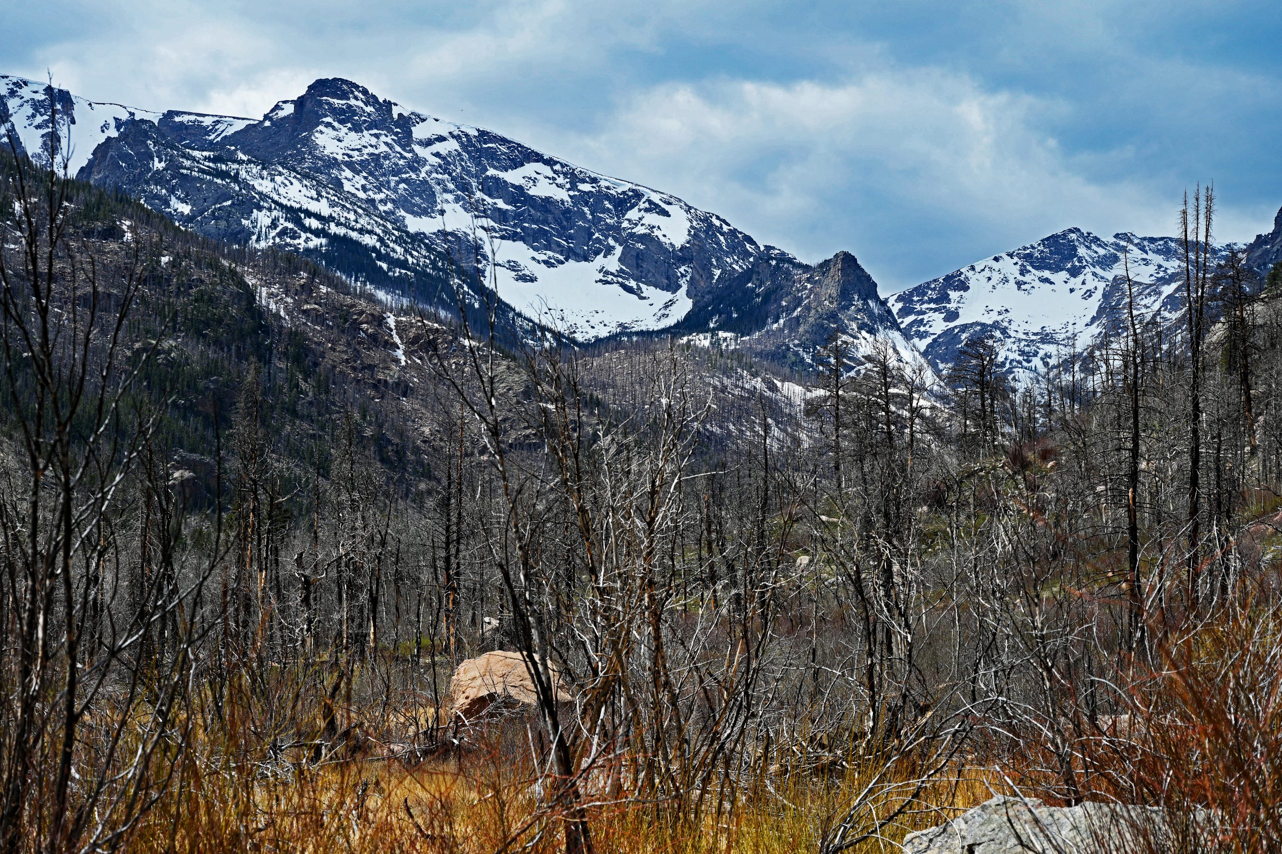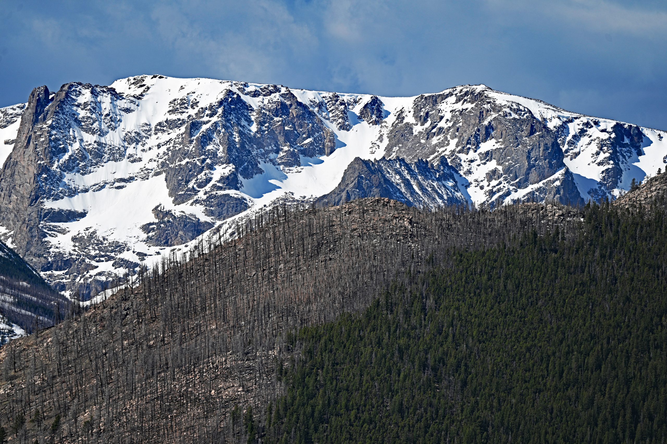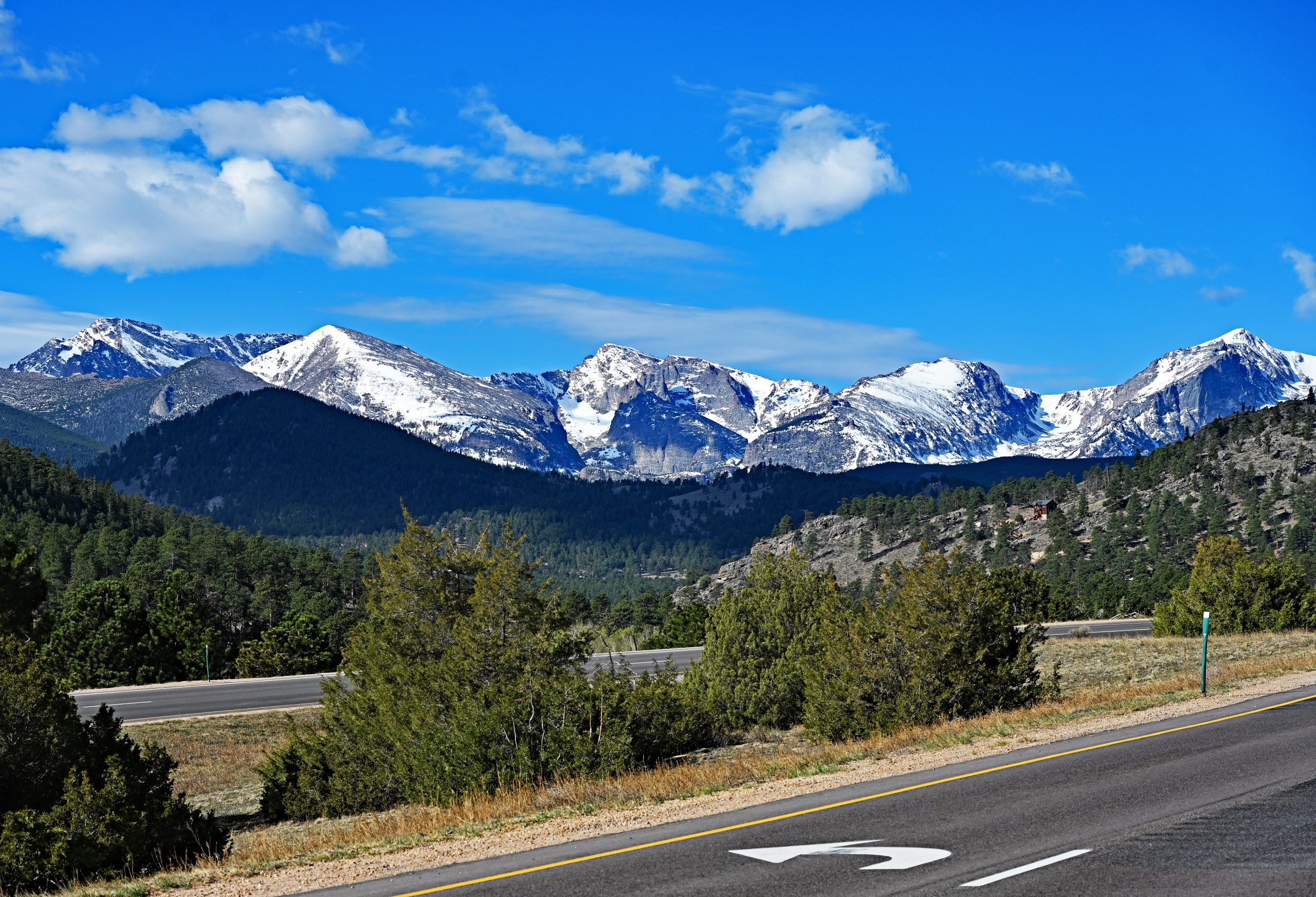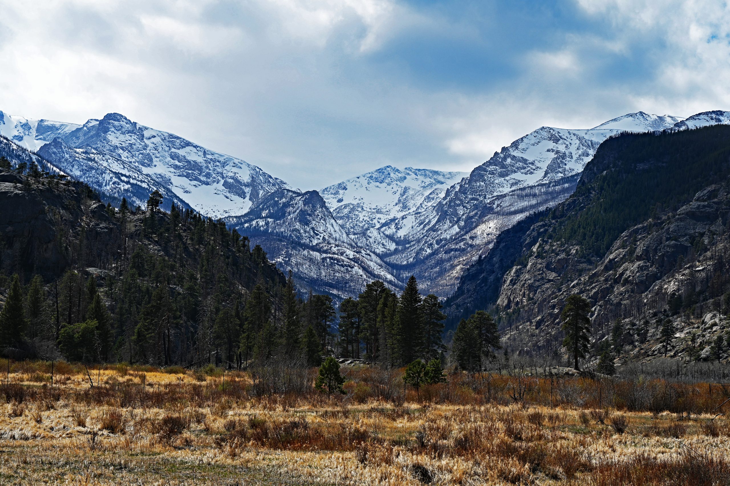 Nach etwa 1,5 Meilen entscheiden wir uns zur Umkehr, da wir heute noch weitere Pfade erkunden möchten. Unser Weg führt uns tiefer in den Park zum Parkplatz des Cub Lake Trail. Von hier aus schweift unser Blick weit nach Westen, hinein in die tiefen Einschnitte des Forest Canyons und hin zu den fernen Gipfeln der Continental Divide. Im unmittelbaren Vordergrund erhebt sich der bewaldete Rücken des Bighorn Mountain, der fast vollständig schneefrei dem Frühling trotzt. Links davon thront dominant der schneebedeckte Stones Peak, während am fernen Ende des Tals der Terra Tomah Mountain über der Szenerie wacht. Zur Rechten vervollständigt der massivere, weiß leuchtende Gipfel des Mount Julian dieses alpine Gemälde. Zwischen diesen Riesen liegt der tief eingeschnittene Forest Canyon, durch dessen Sohle sich der Big Thompson River seinen Weg bahnt.
