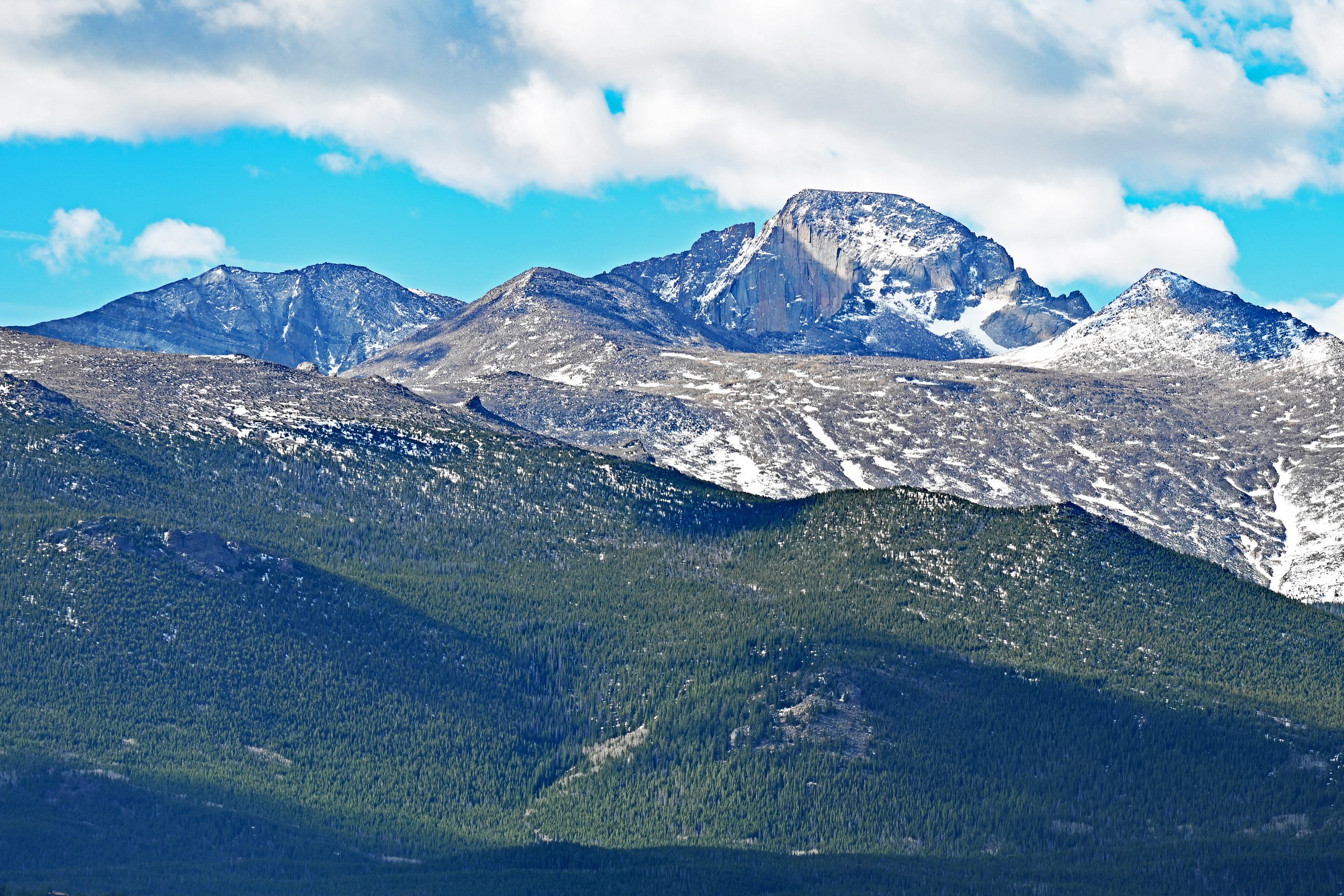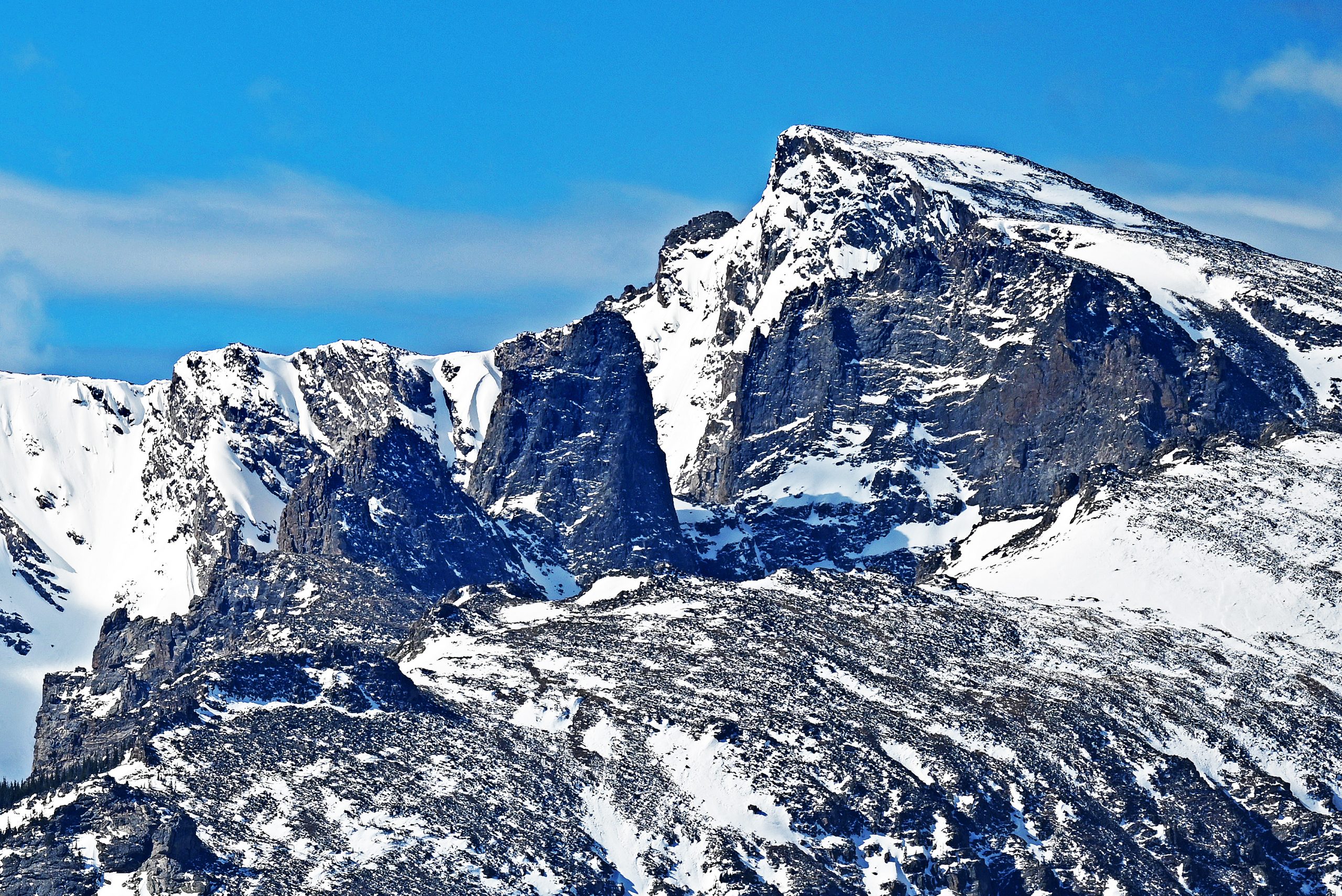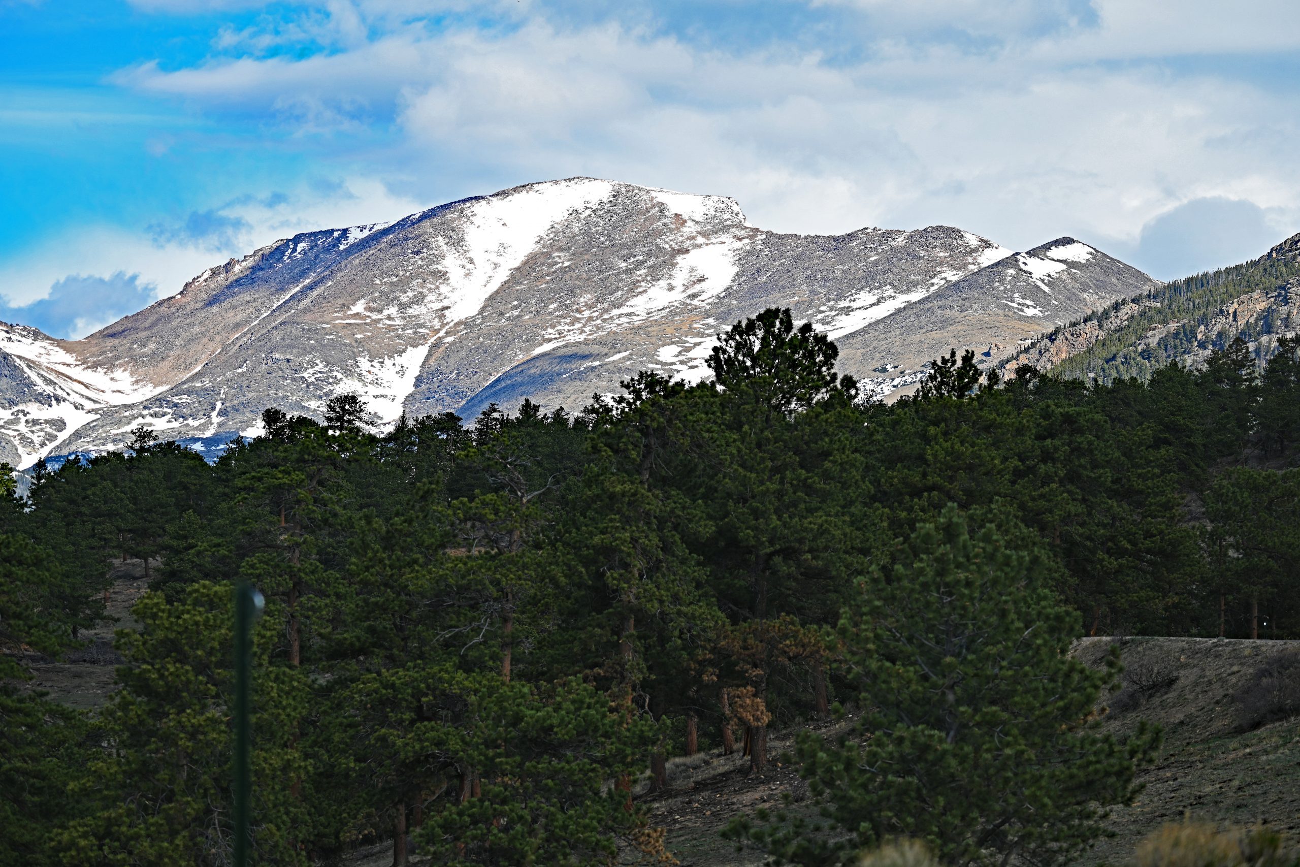 Auf dem Parkplatz des Deer Mountain angekommen, bemerken wir sofort, dass die Sonne heute für Fotos deutlich besser steht als gestern. Ein absolutes Highlight dieser Reise zeigt sich uns hier in voller Pracht: Der majestätische Longs Peak thront wie ein König über seinem Reich. Seine tief verschneiten Flanken glänzen in der hellen Aprilsonne wie polierter Marmor, und die Schatten in den tiefen Rinnen verleihen dem Massiv eine plastische Tiefe. Direkt daneben führt der tiefe Bergrücken von The Loft den Blick hinüber zum stolzen Mount Meeker. Es ist eine Landschaft, die keine Worte braucht, um ihre Erhabenheit zu beweisen – wir stehen dort, atmen die kalte Gebirgsluft und spüren die zeitlose Kraft dieser Giganten.