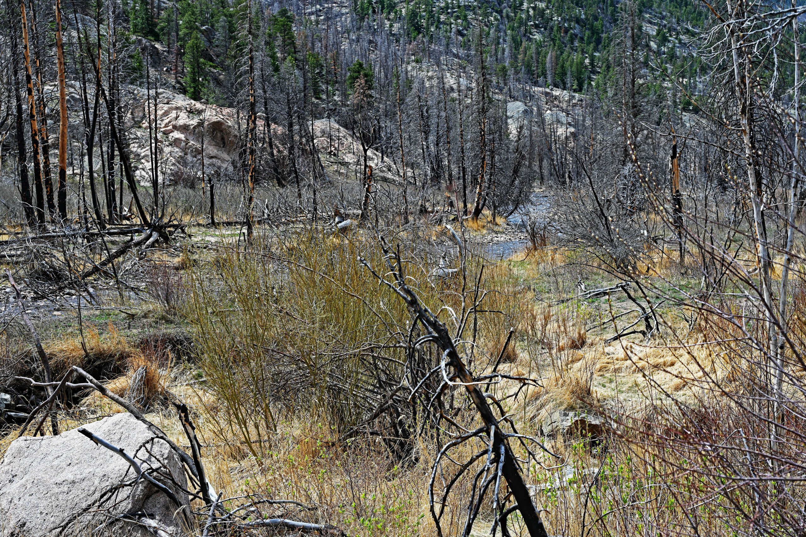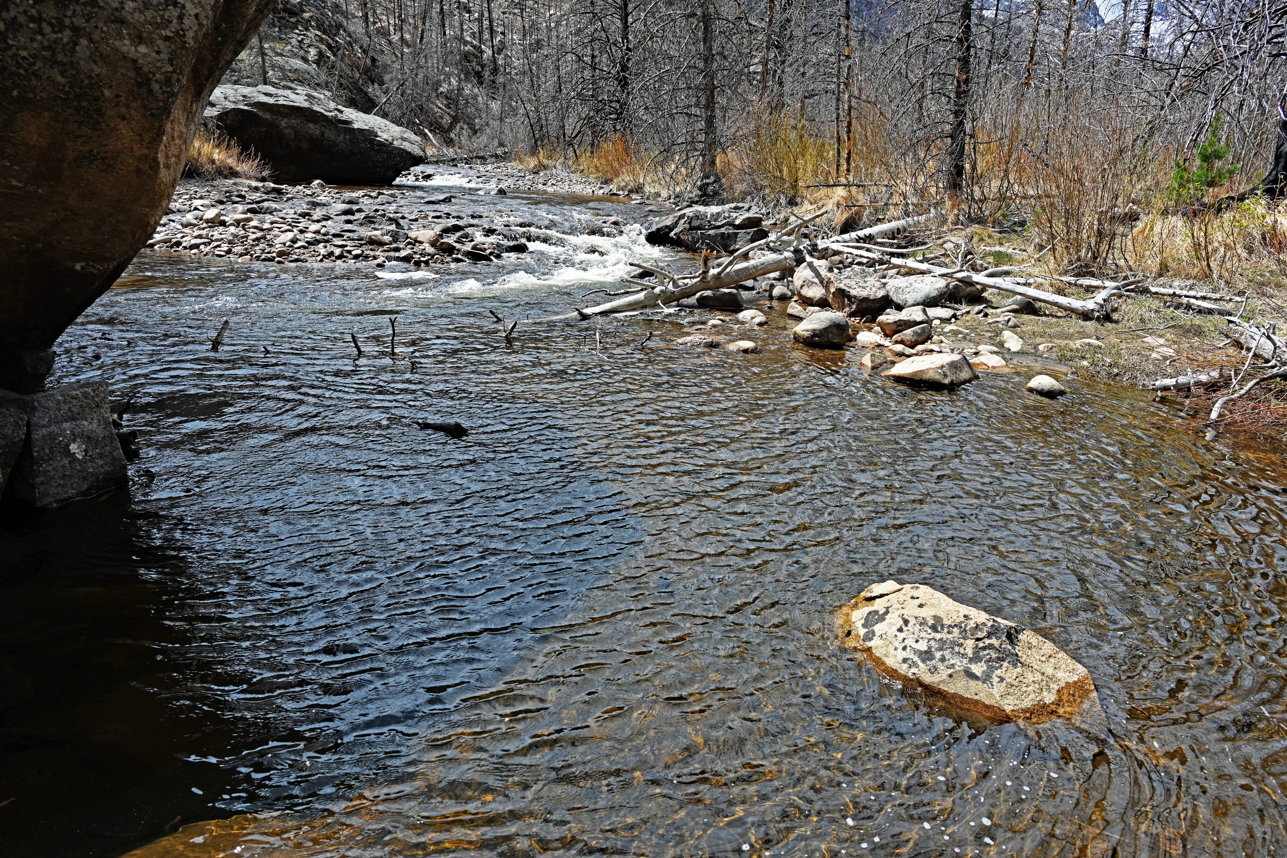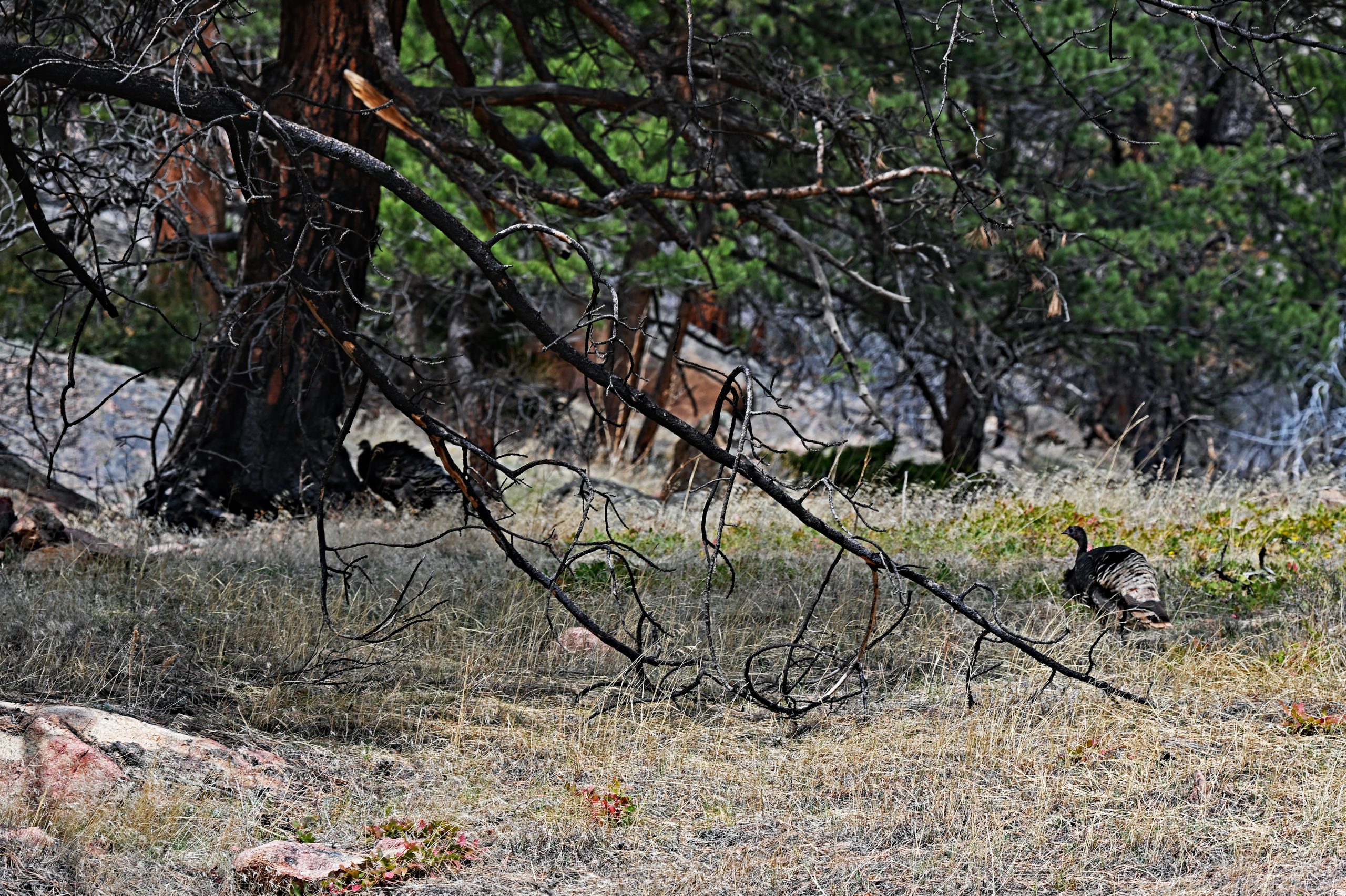 Die Reise geht weiter in Richtung des Trails zum „Pool“, doch die Straße ist bereits nach einer halben Meile gesperrt. Beim Aussteigen erleben wir eine unerwartete Überraschung: Oberhalb des Parkplatzes stolzieren zwei Pfaue durch das Gelände. Die ersten 0,7 Meilen müssen wir auf der staubigen Straße zurücklegen, bevor wir endlich den eigentlichen Trail erreichen und den Staub hinter uns lassen. Der Weg führt uns durch einen Wald, der gezeichnet ist; ein großes Feuer hat hier vor Jahren gewütet. Zwischen den silbrigen Skeletten der toten Bäume stehen vereinzelt grüne Überlebende, und der Nachwuchs drängt bereits kräftig mit einer Höhe von bis zu zwei Metern ans Licht – ein hoffnungsvoller Anblick inmitten der Zerstörung.