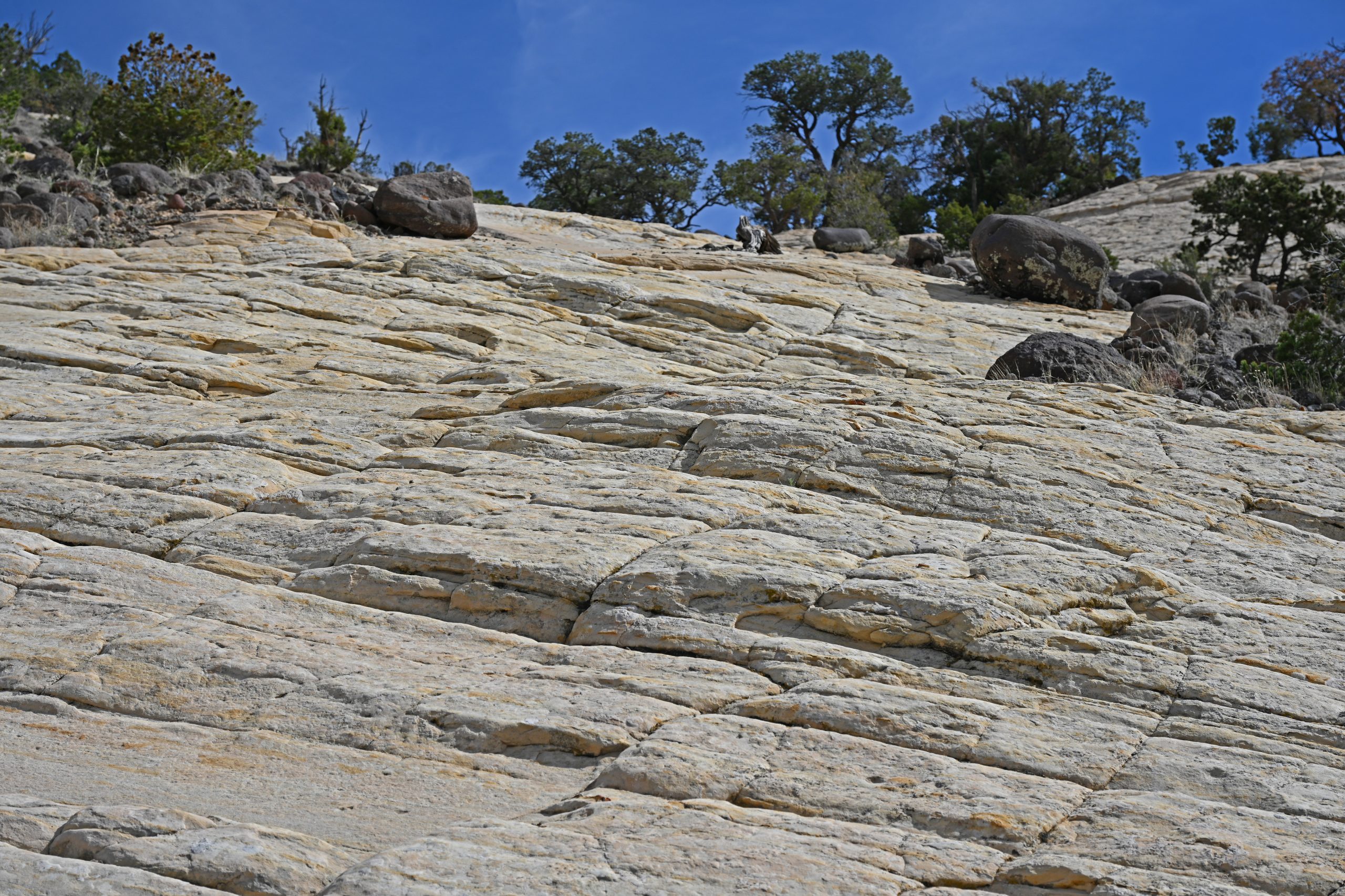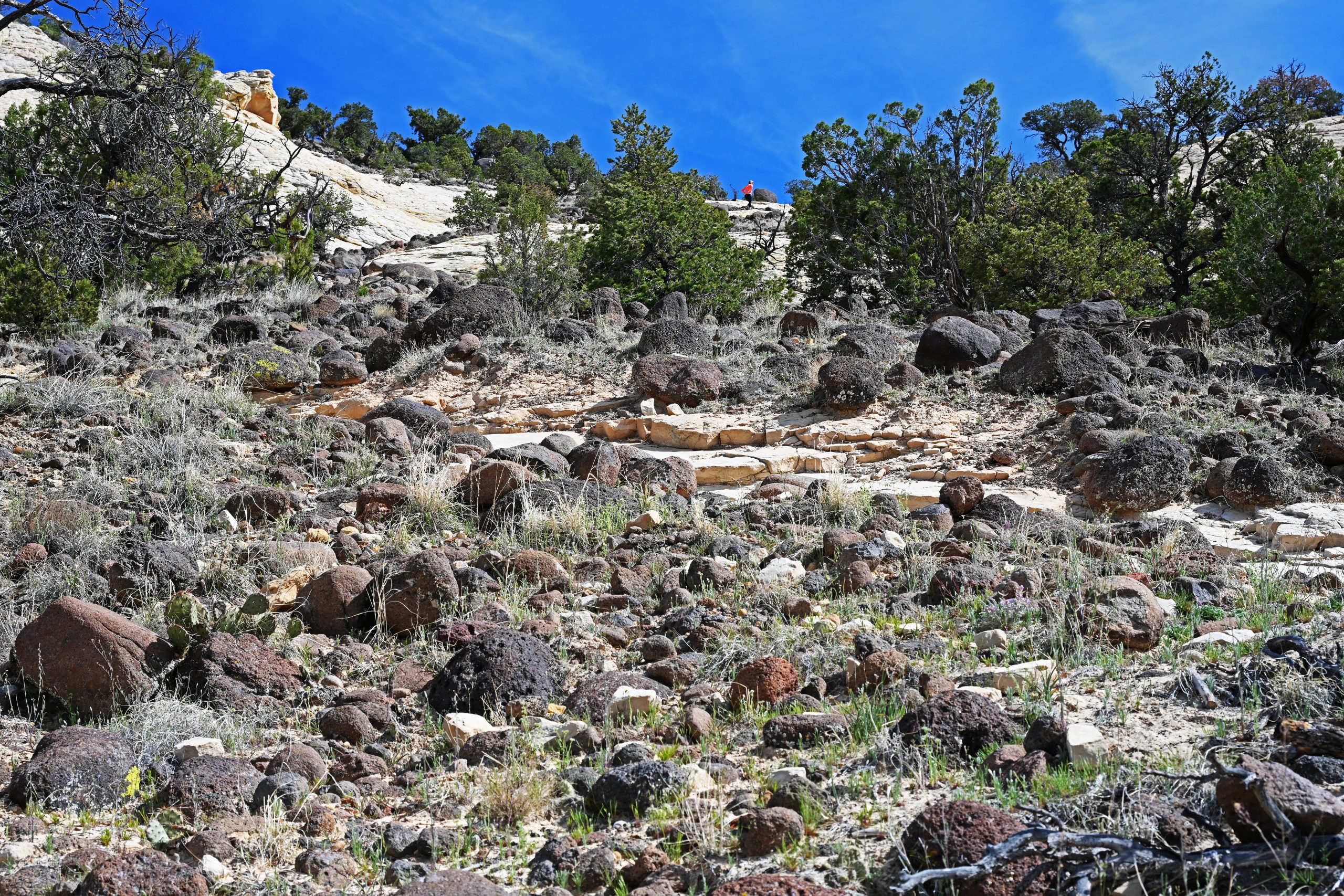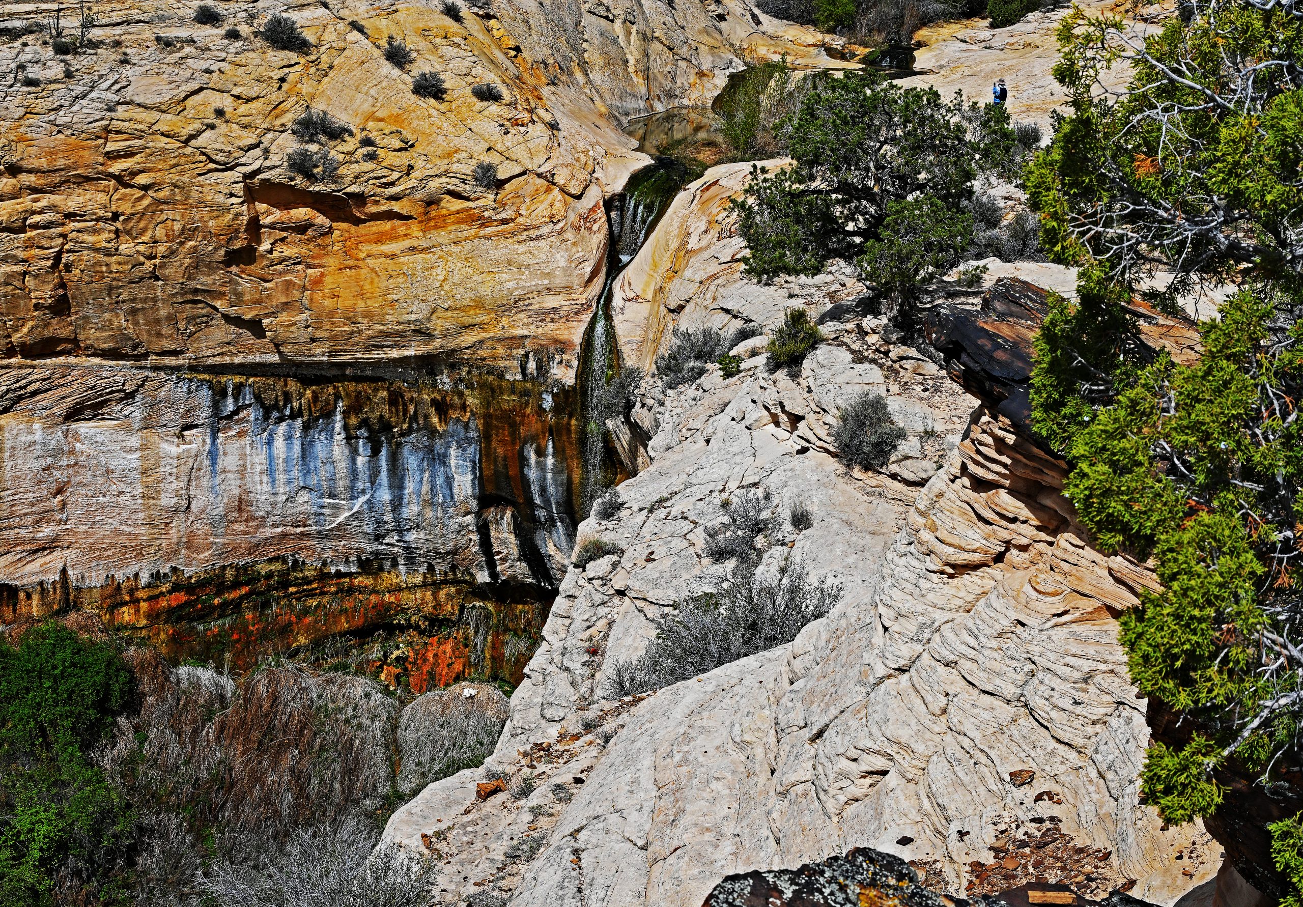 Wir wandern weiter über den nackten Fels, den sogenannten Slickrock. Es erfordert Konzentration, auf den rundlichen Basalt-Brocken nicht den Halt zu verlieren, doch der Ausblick entschädigt uns für jede Mühe. Zwischen den harten Steinen krallen sich Pinyon-Kiefern und Wacholderbäume in kleinste Felsspalten – wahre Überlebenskünstler in dieser trockenen Pracht. Vor uns entfaltet sich das weitläufige Slickrock-Labyrinth oberhalb der Wasserfälle in Farben, die von blendendem Weiß bis zu sanftem Ocker reichen.