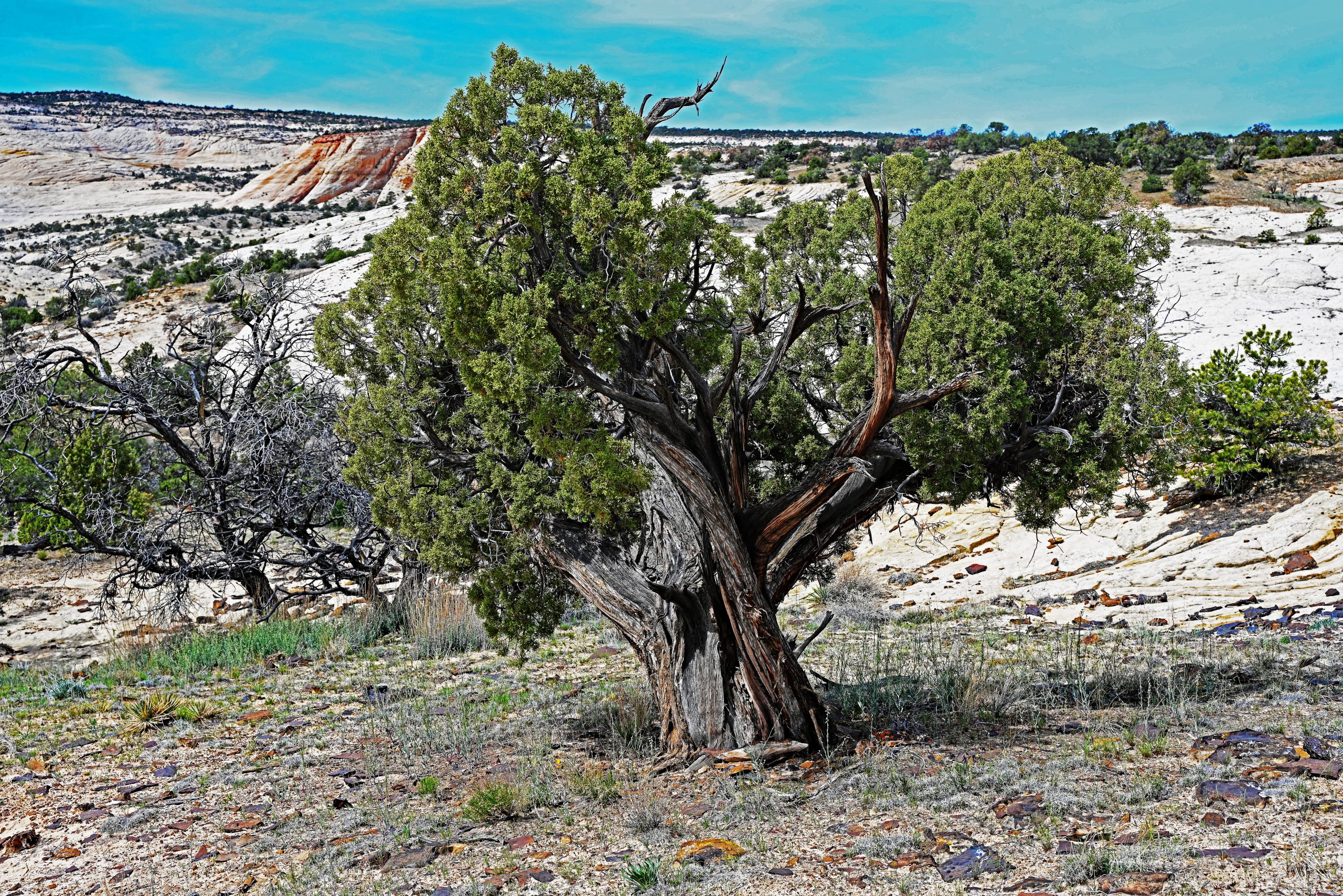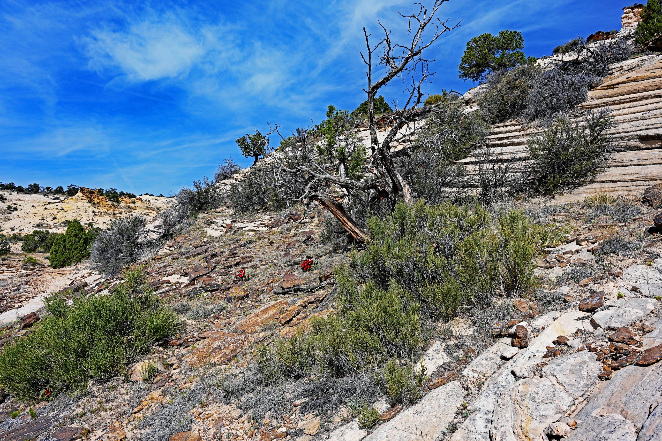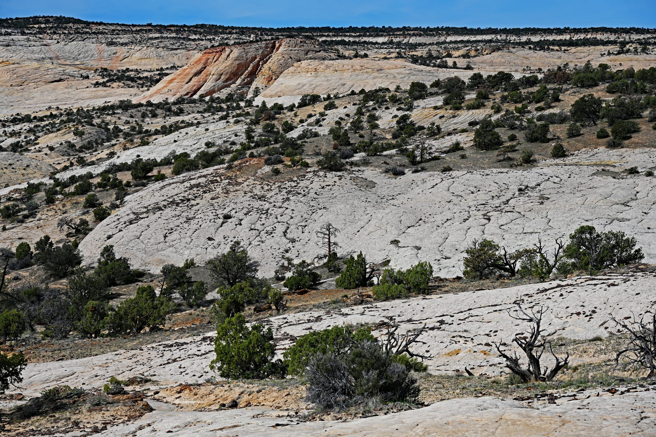 Wir wandern weiter über den nackten Fels, den sogenannten Slickrock. Es erfordert Konzentration, auf den rundlichen Basalt-Brocken nicht den Halt zu verlieren, doch der Ausblick entschädigt uns für jede Mühe. Zwischen den harten Steinen krallen sich Pinyon-Kiefern und Wacholderbäume in kleinste Felsspalten – wahre Überlebenskünstler in dieser trockenen Pracht. Vor uns entfaltet sich das weitläufige Slickrock-Labyrinth oberhalb der Wasserfälle in Farben, die von blendendem Weiß bis zu sanftem Ocker reichen.