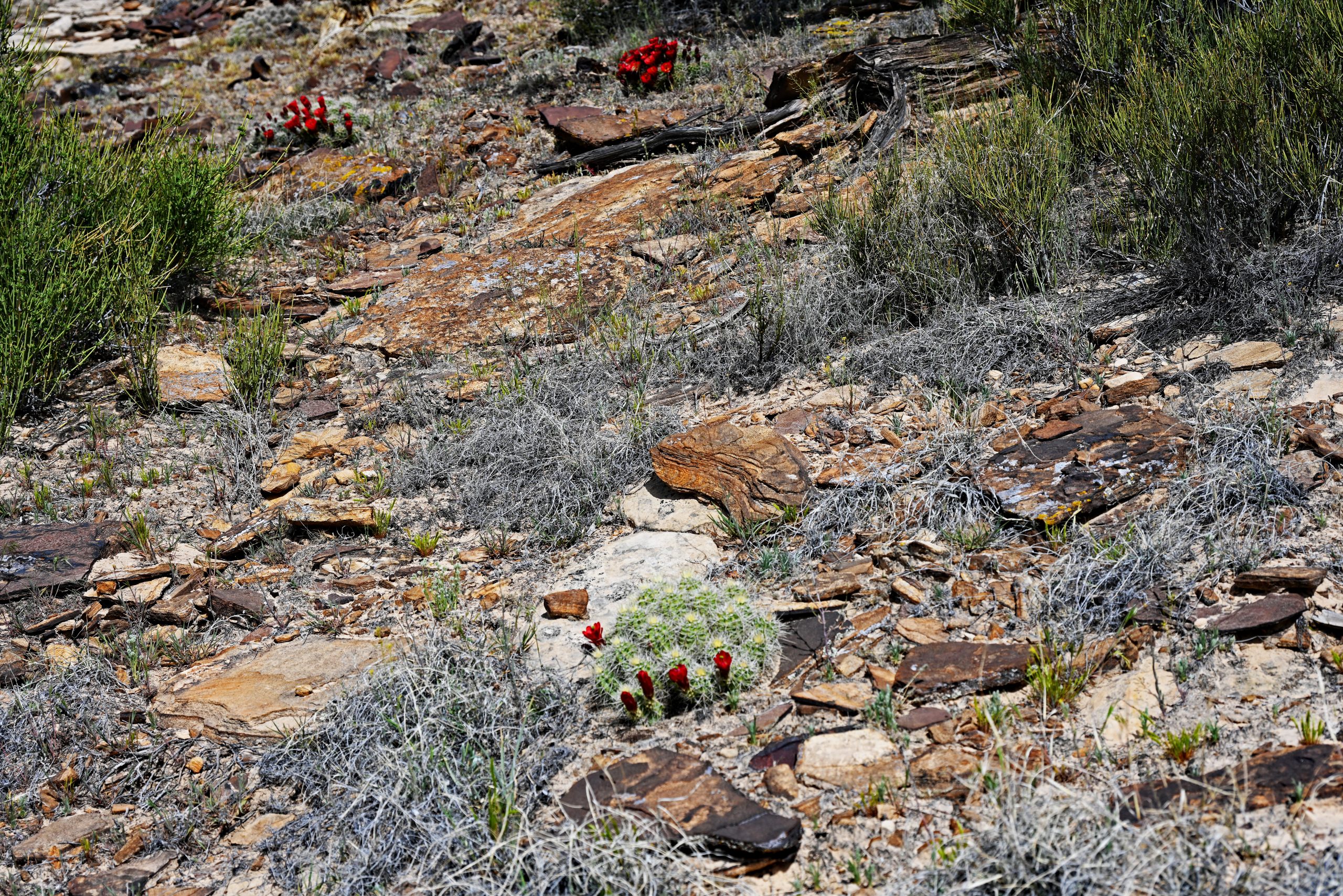 Während wir tiefer in den Canyon vordringen, fällt uns die unerwartet reiche Vegetation auf. Der absolute Star am Wegesrand ist der Claret Cup Kaktus. Seine leuchtend scharlachroten, kelchförmigen Blüten bilden einen fast unwirklichen Kontrast zum grauen Fels. Wir halten kurz inne und hoffen, einen der Kolibris zu entdecken, die von diesem Rot magisch angezogen werden. Überall begegnen wir auch dem Mormonentee mit seinen besenartigen, grünen Zweigen, die im Alter einen gelblichen Ton annehmen – ein Kraut, das schon den frühen Siedlern als heilkräftiger Trank diente.