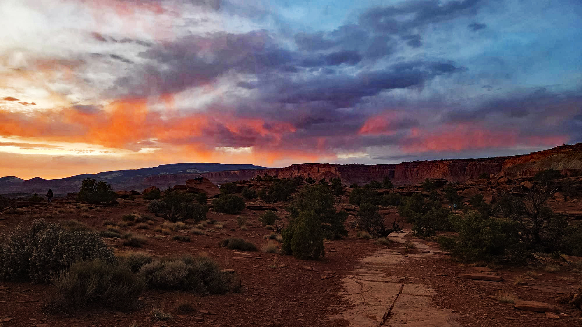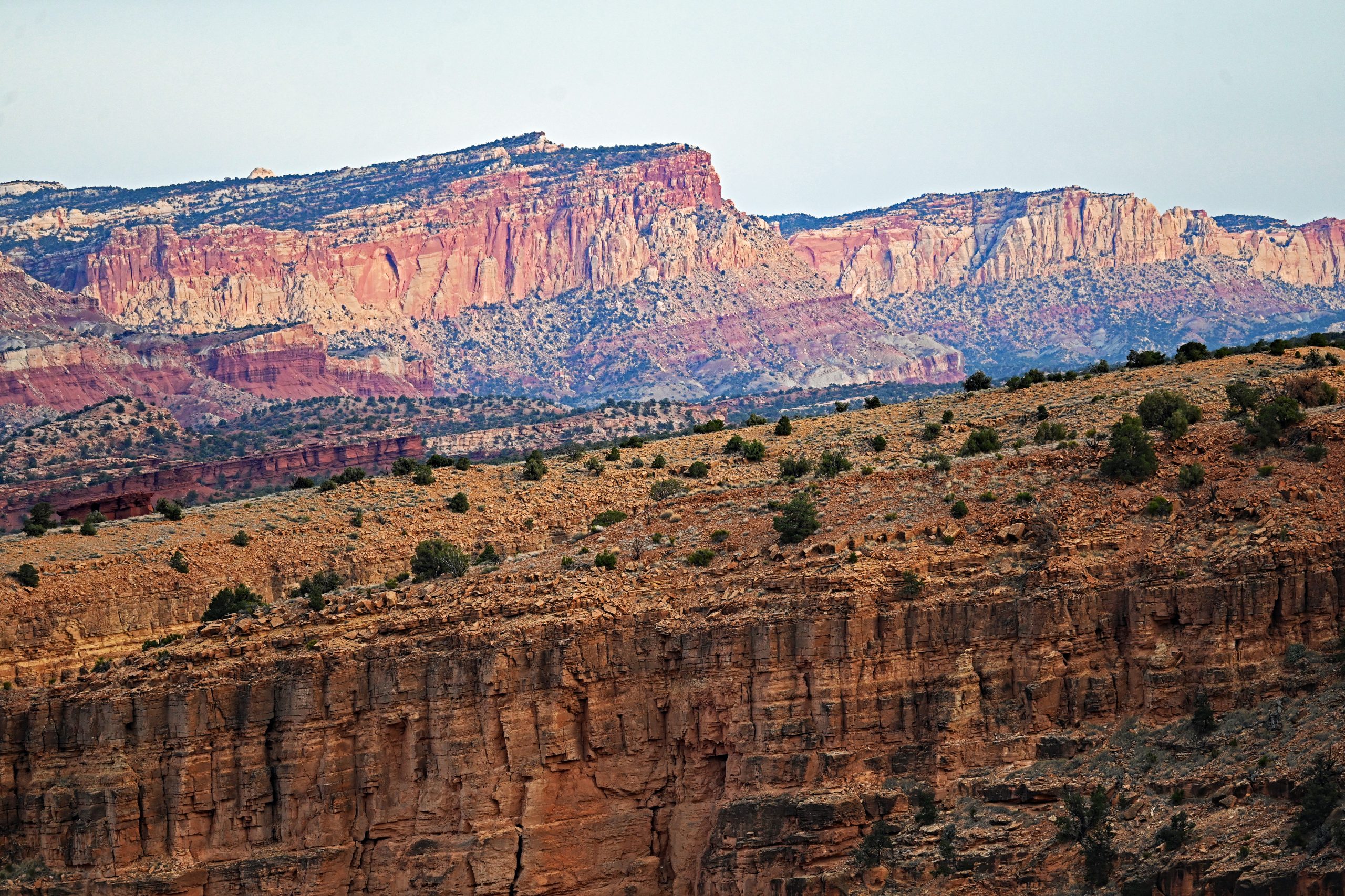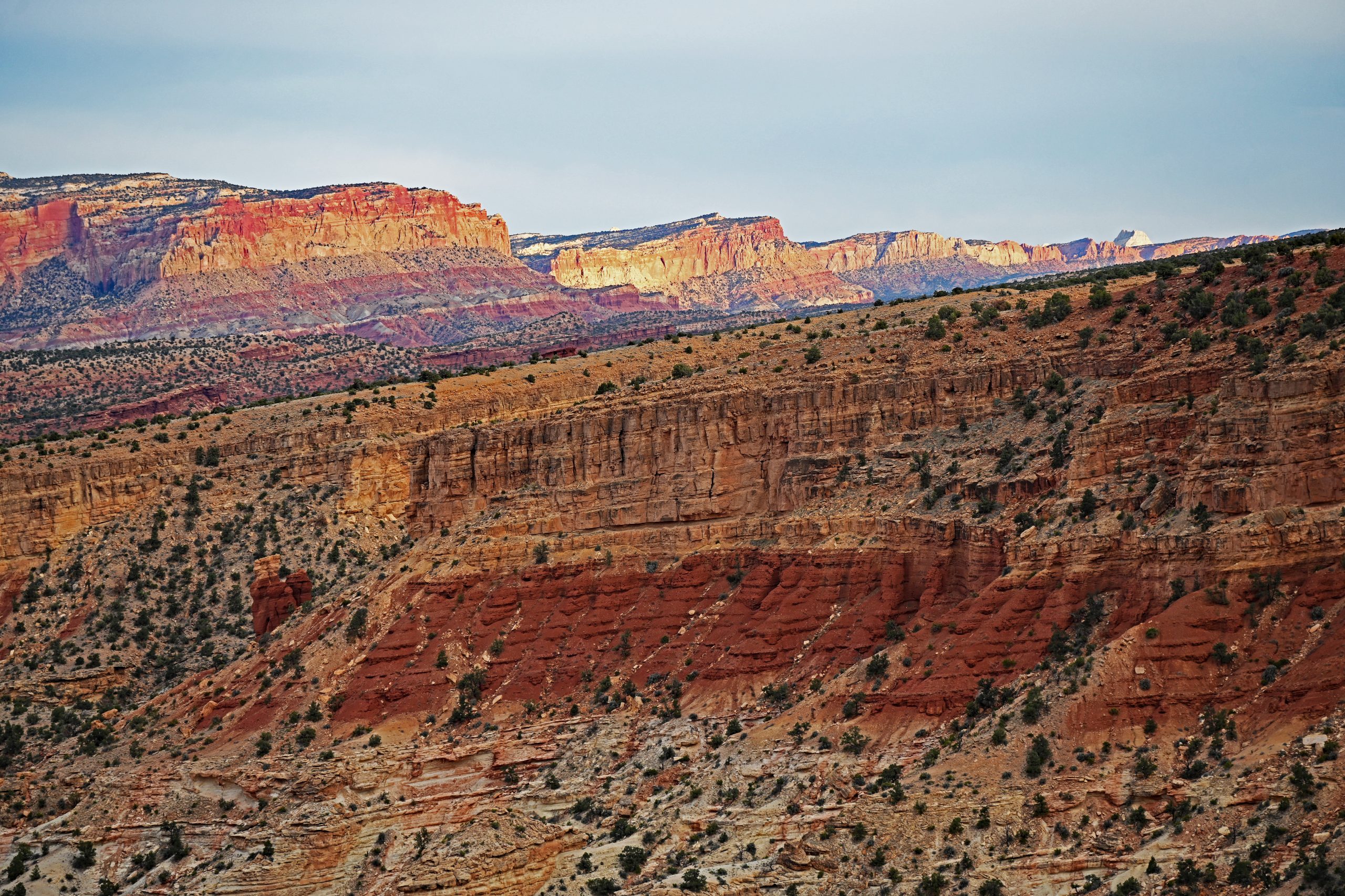 Hier am Sunset Point schauen wir nicht direkt in den Untergang, sondern werden Zeuge, wie die gegenüberliegende Waterpocket Fold entflammt. Zuerst sehen wir, wie die weißen Spitzen der Navajo-Formation im Nordosten angestrahlt werden. Sie leuchten in einem zarten Rosa und Weiß, das an die Marmorkuppeln in Washington erinnert. Dann wandert das Licht tiefer zu den gelblichen Klippen der Kayenta-Formation, bis schließlich der massive Wingate-Sandstein der „Fluted Cliffs“ in einem tiefen, fast blutigen Rot-Orange aufleuchtet.