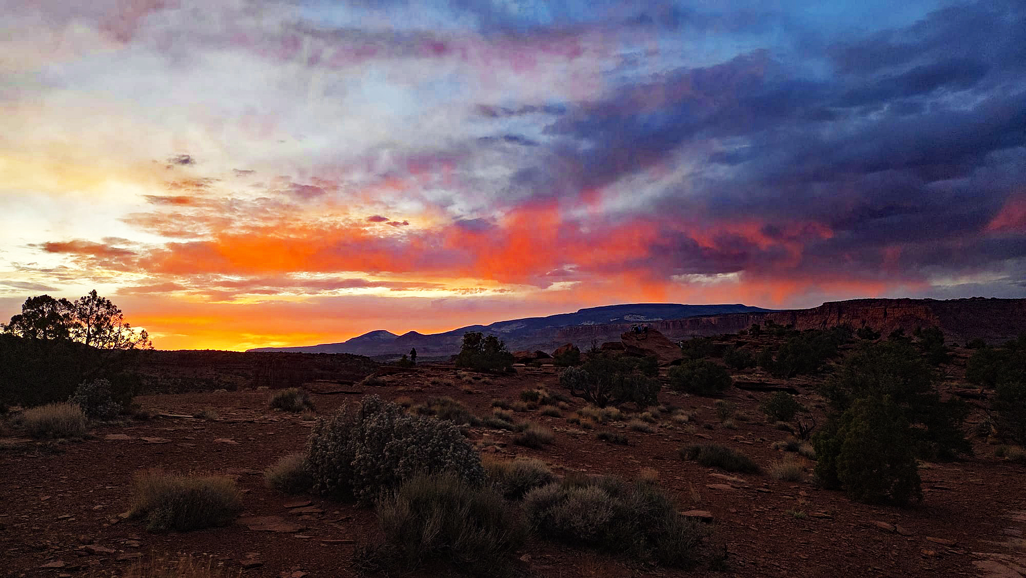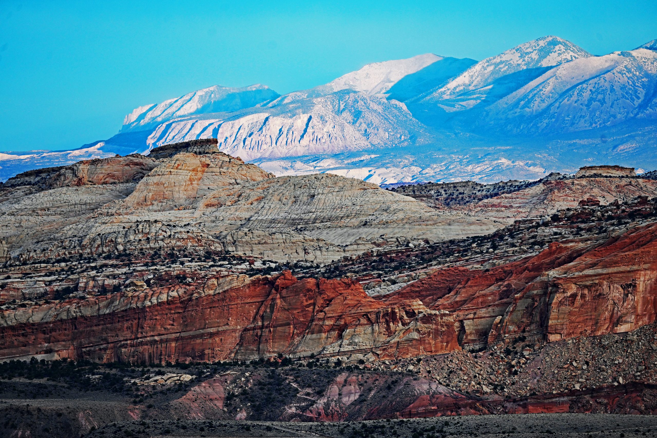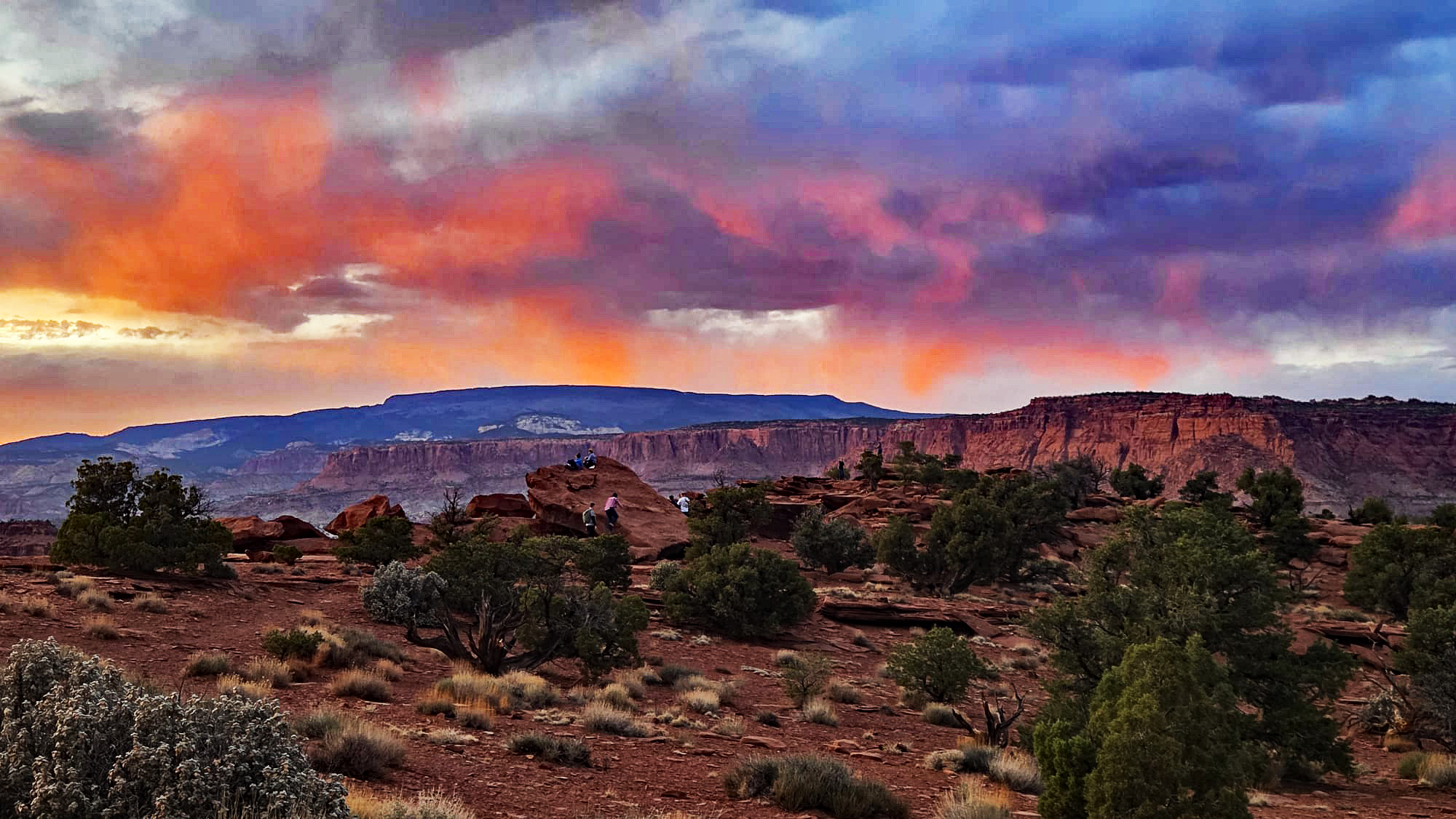 Hier am Sunset Point schauen wir nicht direkt in den Untergang, sondern werden Zeuge, wie die gegenüberliegende Waterpocket Fold entflammt. Zuerst sehen wir, wie die weißen Spitzen der Navajo-Formation im Nordosten angestrahlt werden. Sie leuchten in einem zarten Rosa und Weiß, das an die Marmorkuppeln in Washington erinnert. Dann wandert das Licht tiefer zu den gelblichen Klippen der Kayenta-Formation, bis schließlich der massive Wingate-Sandstein der „Fluted Cliffs“ in einem tiefen, fast blutigen Rot-Orange aufleuchtet.