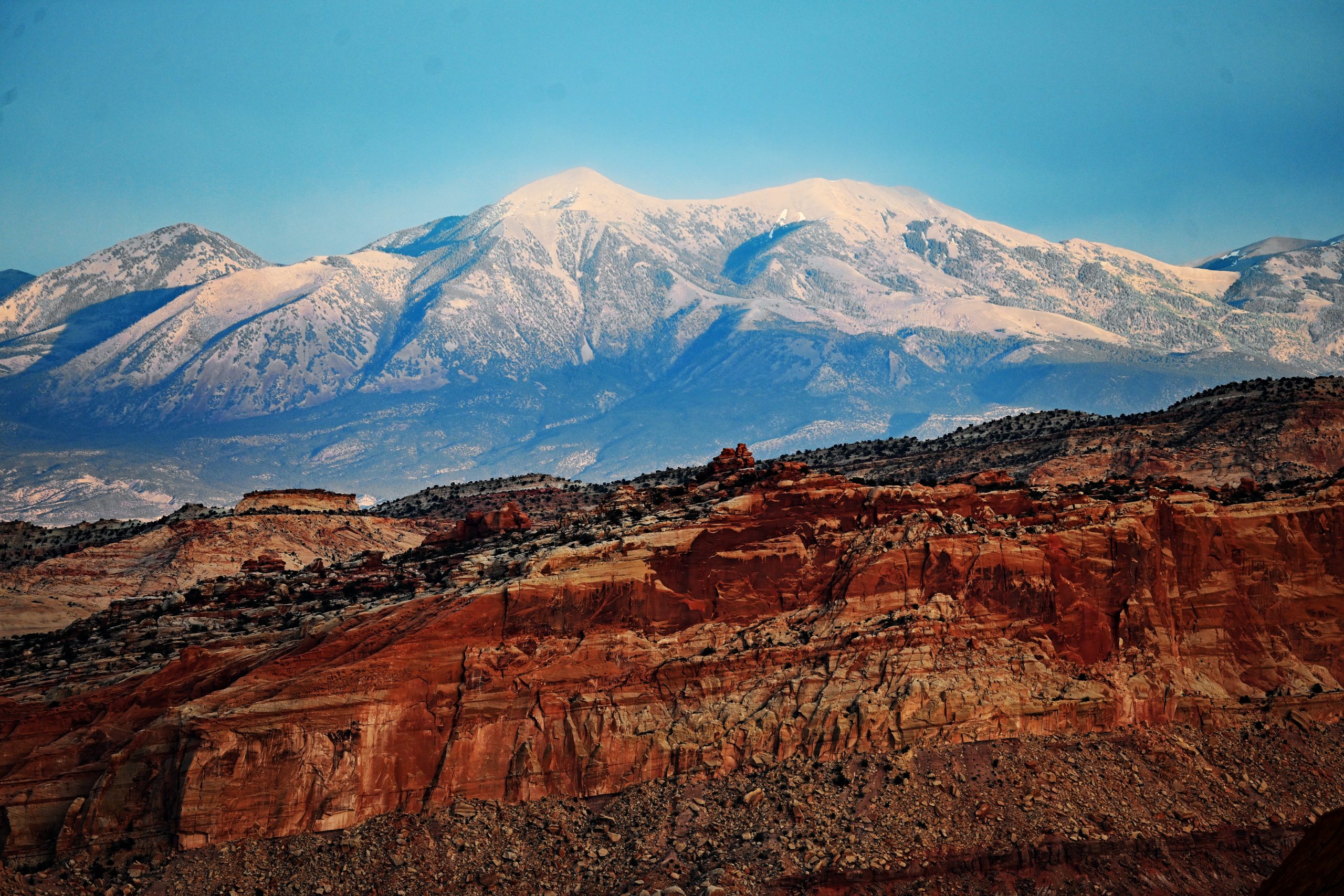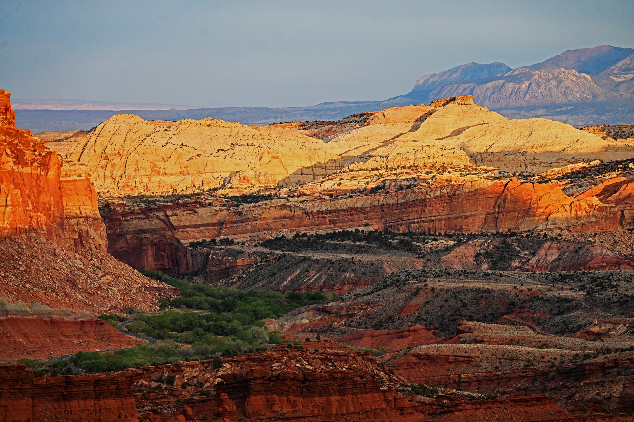 Am fernen Horizont erscheinen die bläulichen Silhouetten der Henry Mountains mit dem Mount Ellen, während näher bei uns die goldenen Navajo-Kuppeln von Fern’s Nipple und der plateauartigen Pectols Pyramid um die Wette strahlen. Tief unten im Schatten markiert das satte Grün der Bäume den geheimen Lauf des Sulphur Creek.