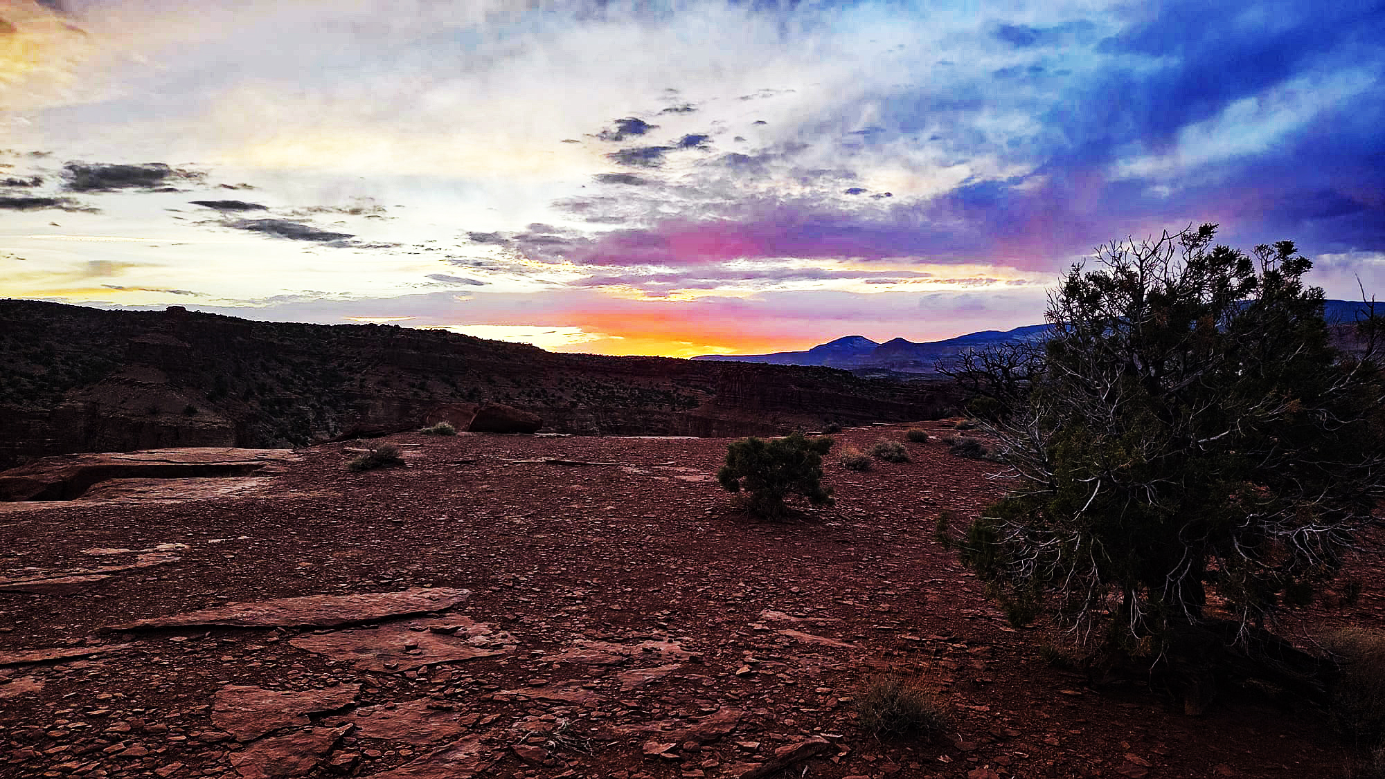 Nach einer kurzen Erholungspause in unserem Hotel, dem Rim Rock Inn, zieht es uns gegen 17:30 Uhr wieder hinaus. Wir fahren zum Sunset Point im Capitol Reef National Park. Der Himmel ist zunächst enttäuschend grau, die Sonne versteckt sich hartnäckig hinter einer dichten Wolkendecke. Doch wir lassen uns nicht abschrecken. Und tatsächlich geschieht das kleine Wunder: Kurz bevor keiner mehr an einen Sonnenuntergang glaubt, stiehlt sich die Sonne unter den Wolken hervor und beginnt ihr tägliches Meisterwerk.