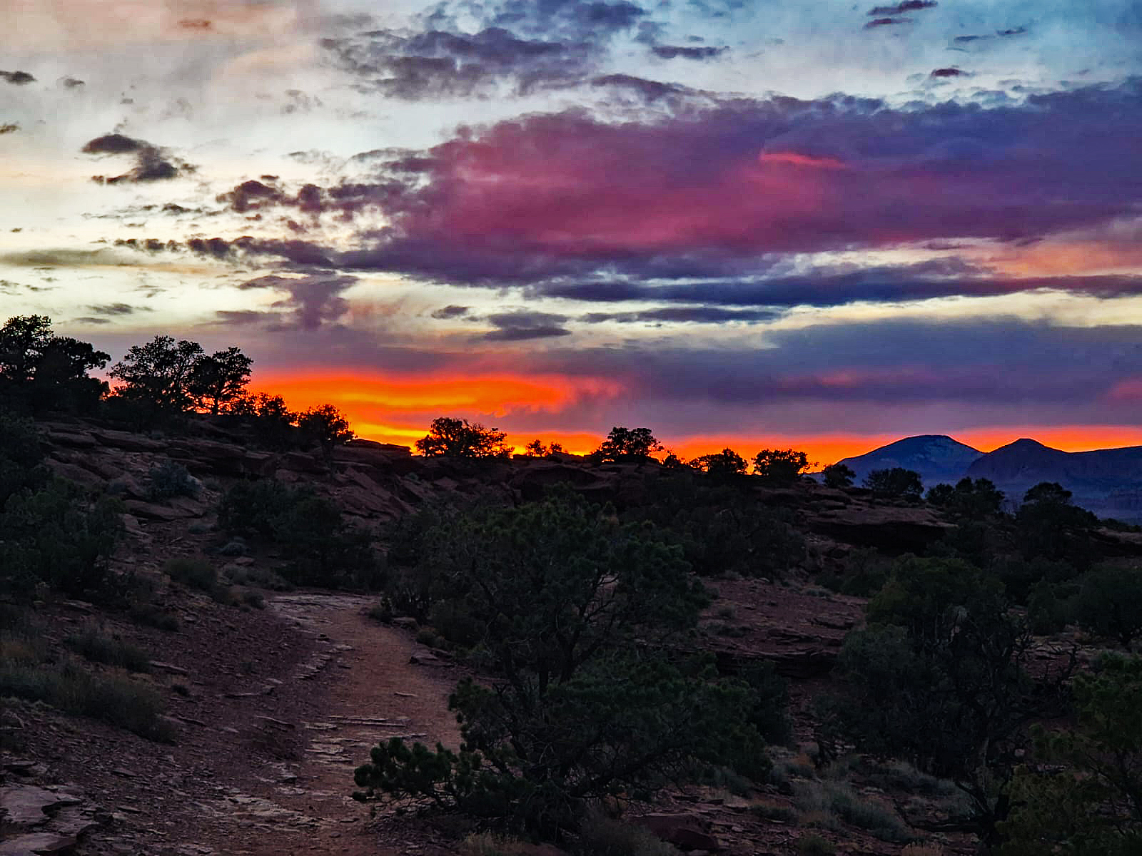 Völlig berauscht von diesen Farben machen wir uns auf den Rückweg zum Parkplatz. Doch das Spektakel ist noch nicht vorbei. Über dem Gooseneck Overlook brennt der Himmel nun in Violett- und Orangetönen, ein letztes dramatisches Aufbäumen des Tages, das uns einfach hingerissen sein lässt. Es ist der perfekte Abschluss eines Tages, der von der Stille des weißen Sandsteins bis zum Feuer des Abendhimmels alles bot.
